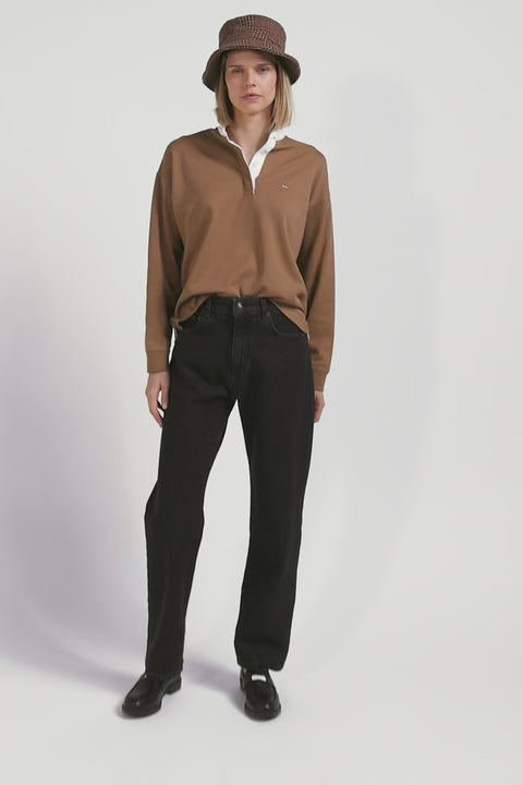 Regular brown striped long-sleeved cotton rugby shirt with back embroidery
