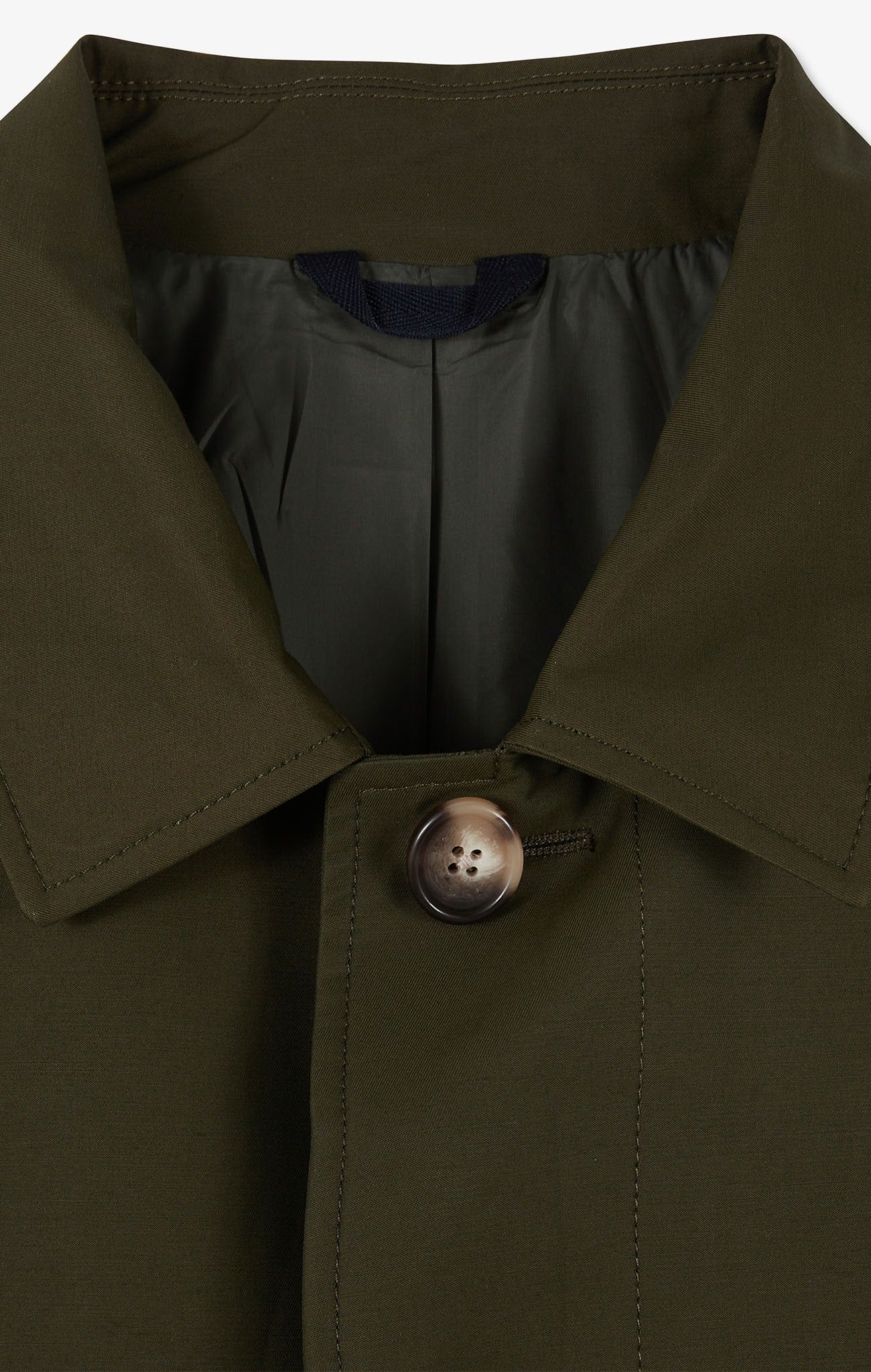 Designed in soft cotton and polyamide with a water-repellent finish, this raincoat features a totally plain color scheme. It features an unbuttoned collar and a loose, straight fit. This raincoat has two front raglan pockets and a buttoned placket closure.