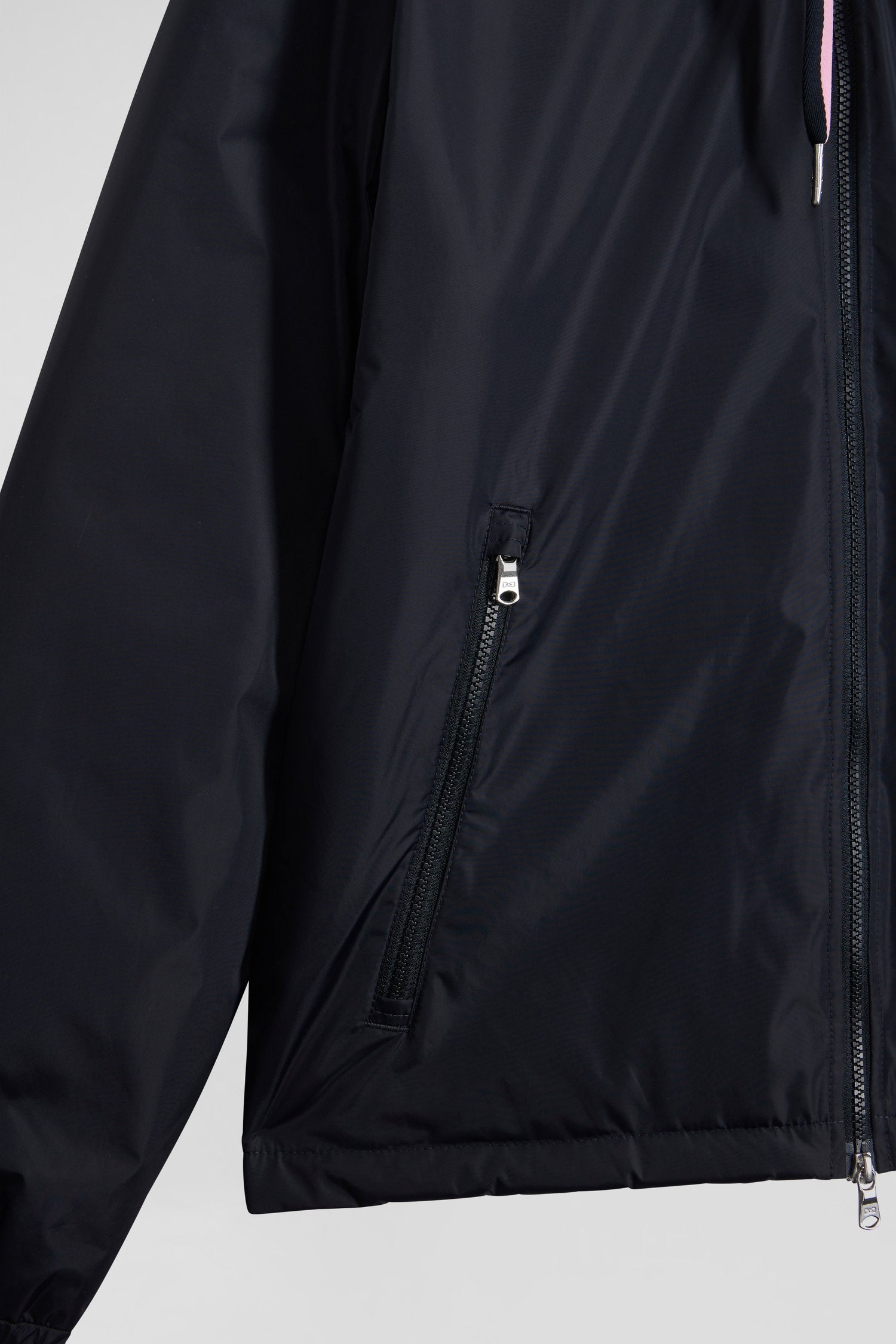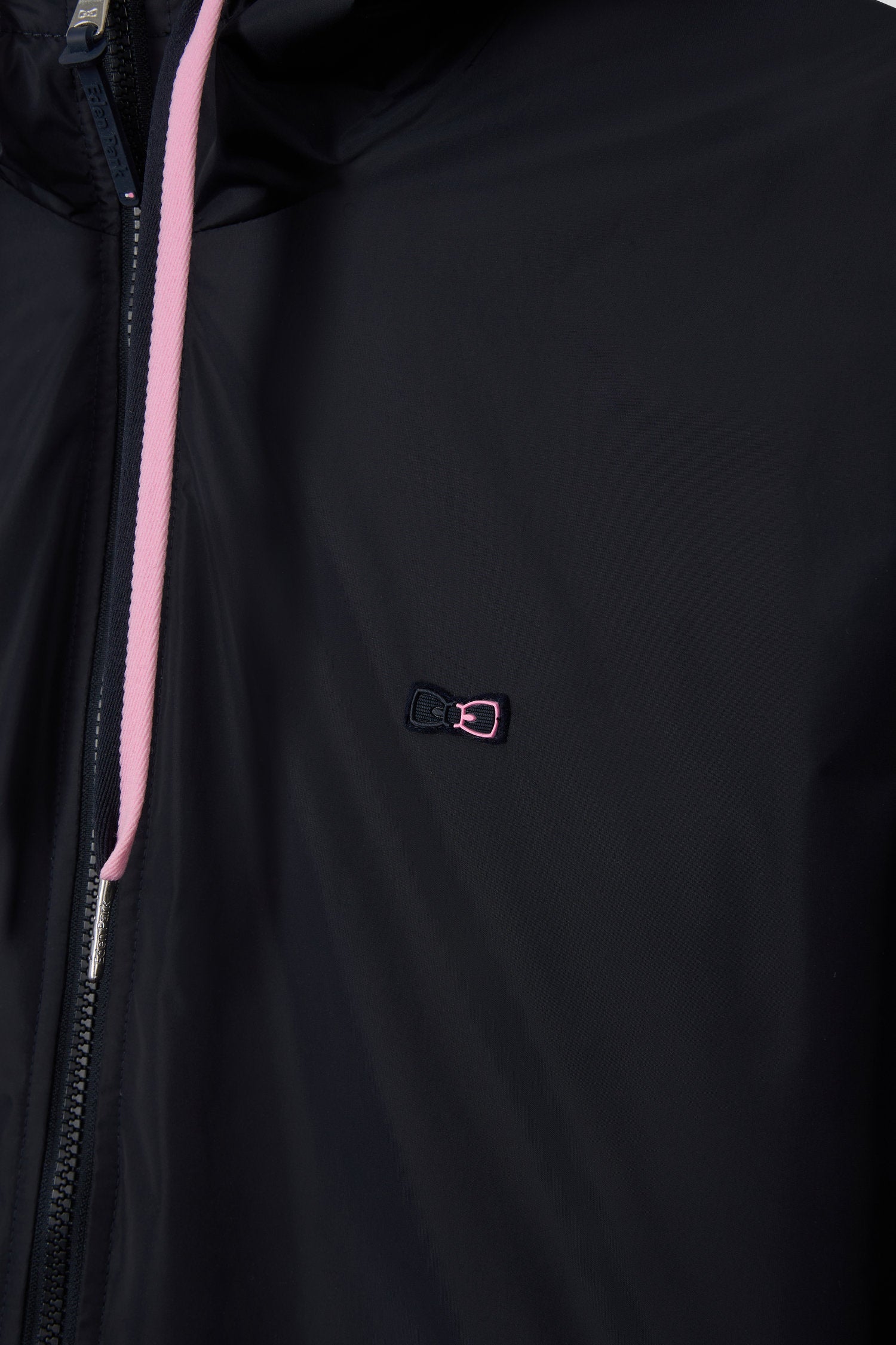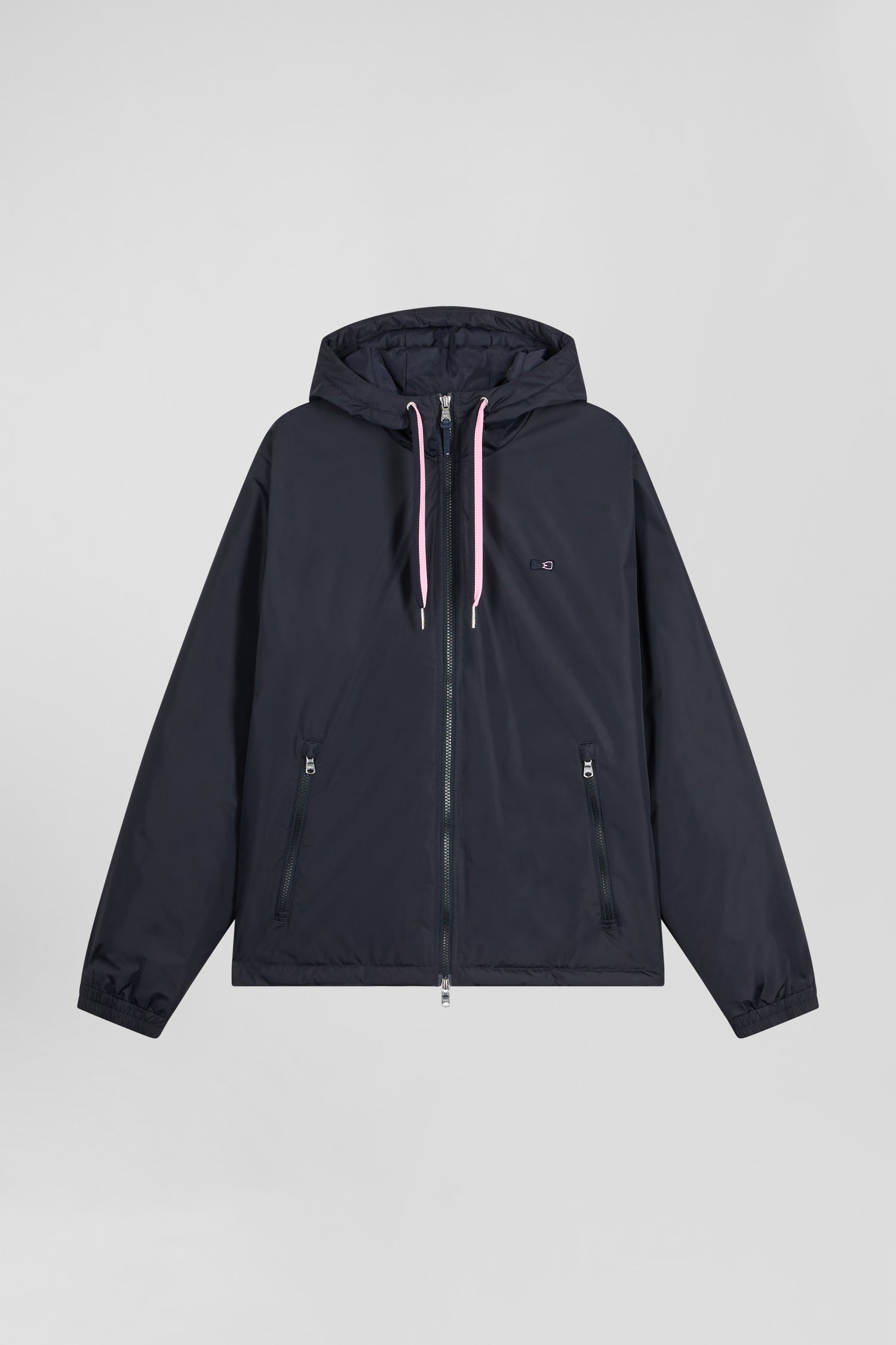 Navy blue hooded windbreaker jacket