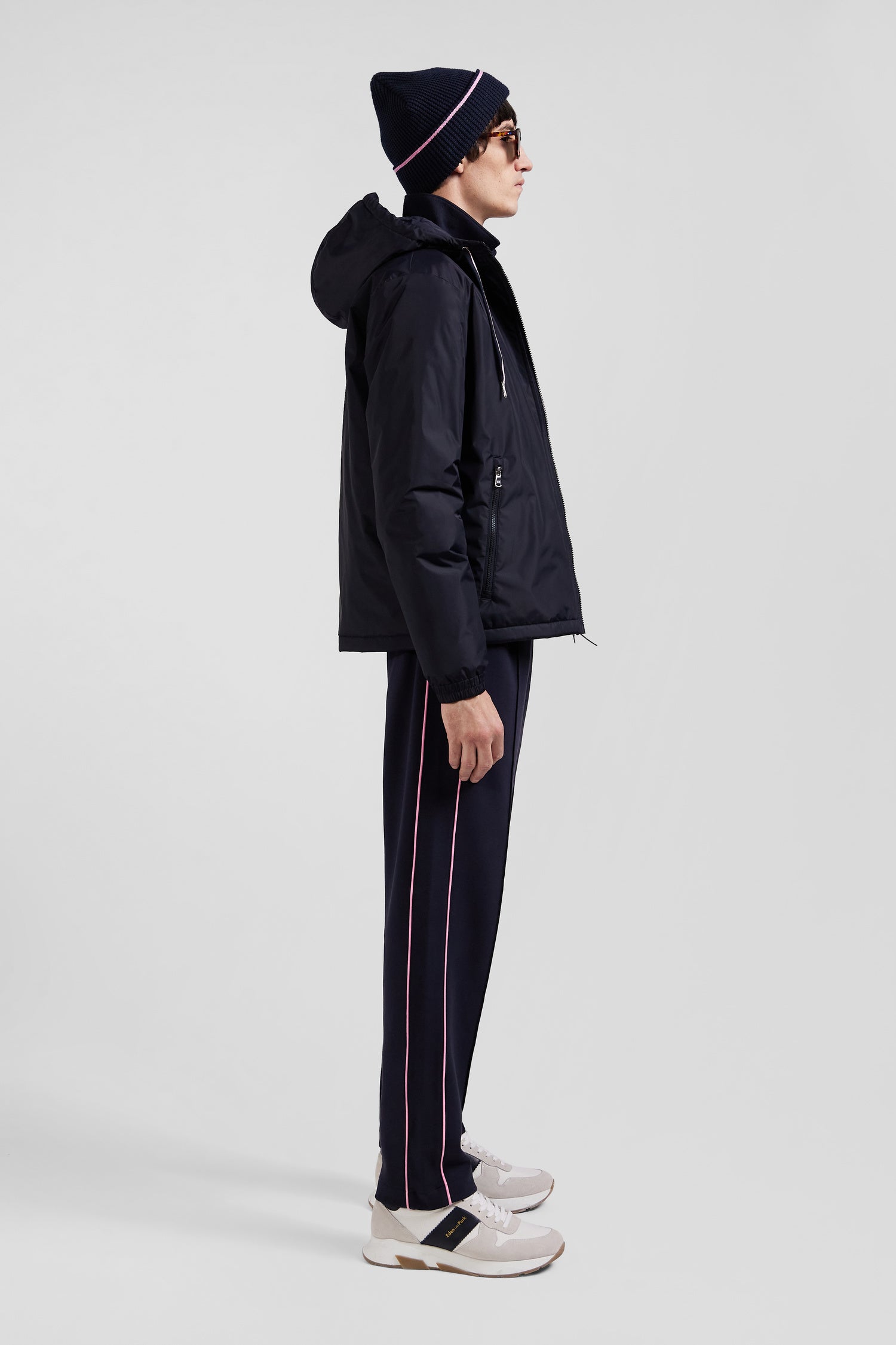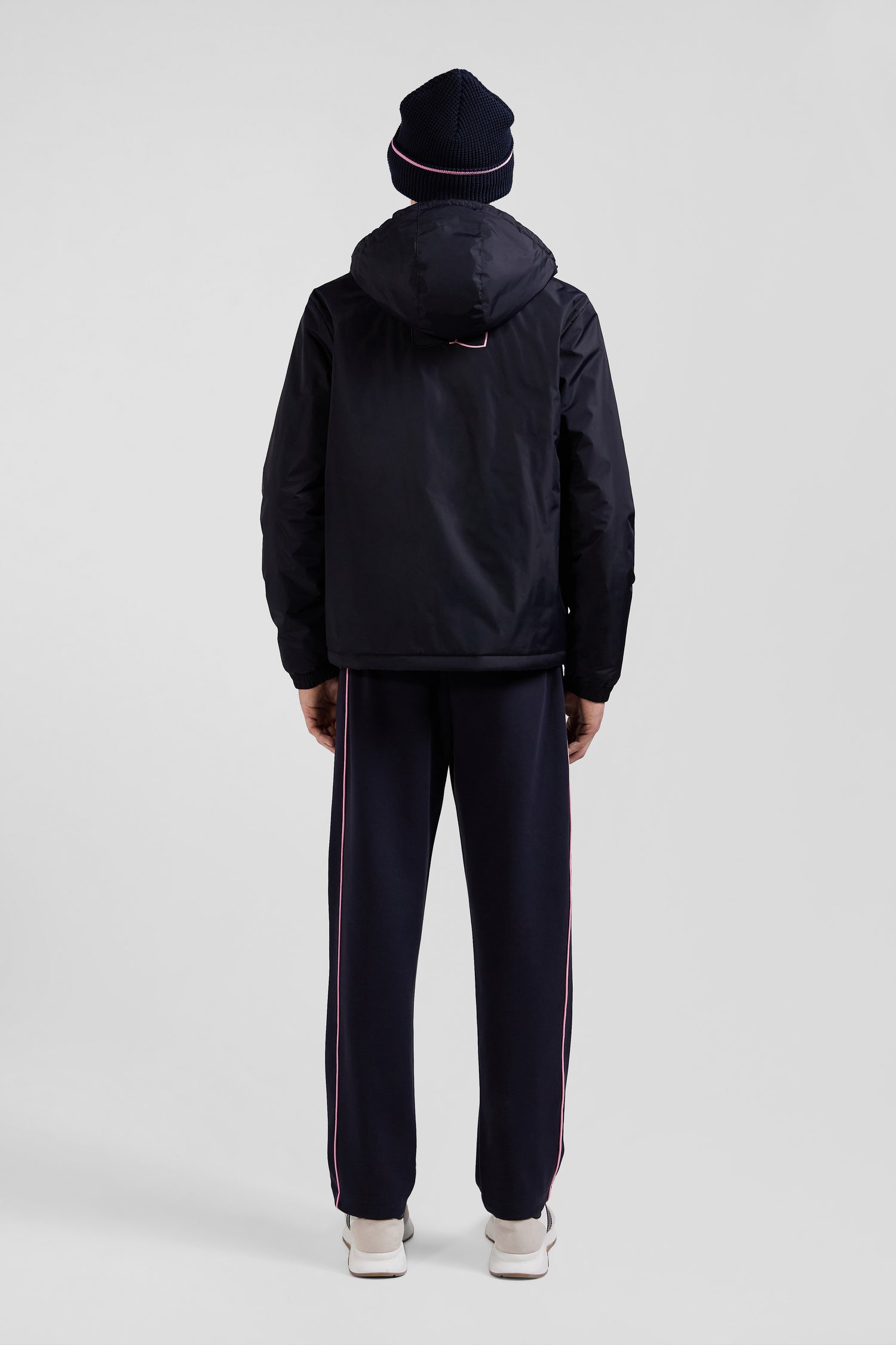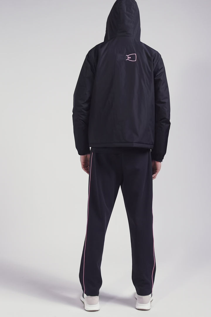 Navy blue hooded windbreaker jacket