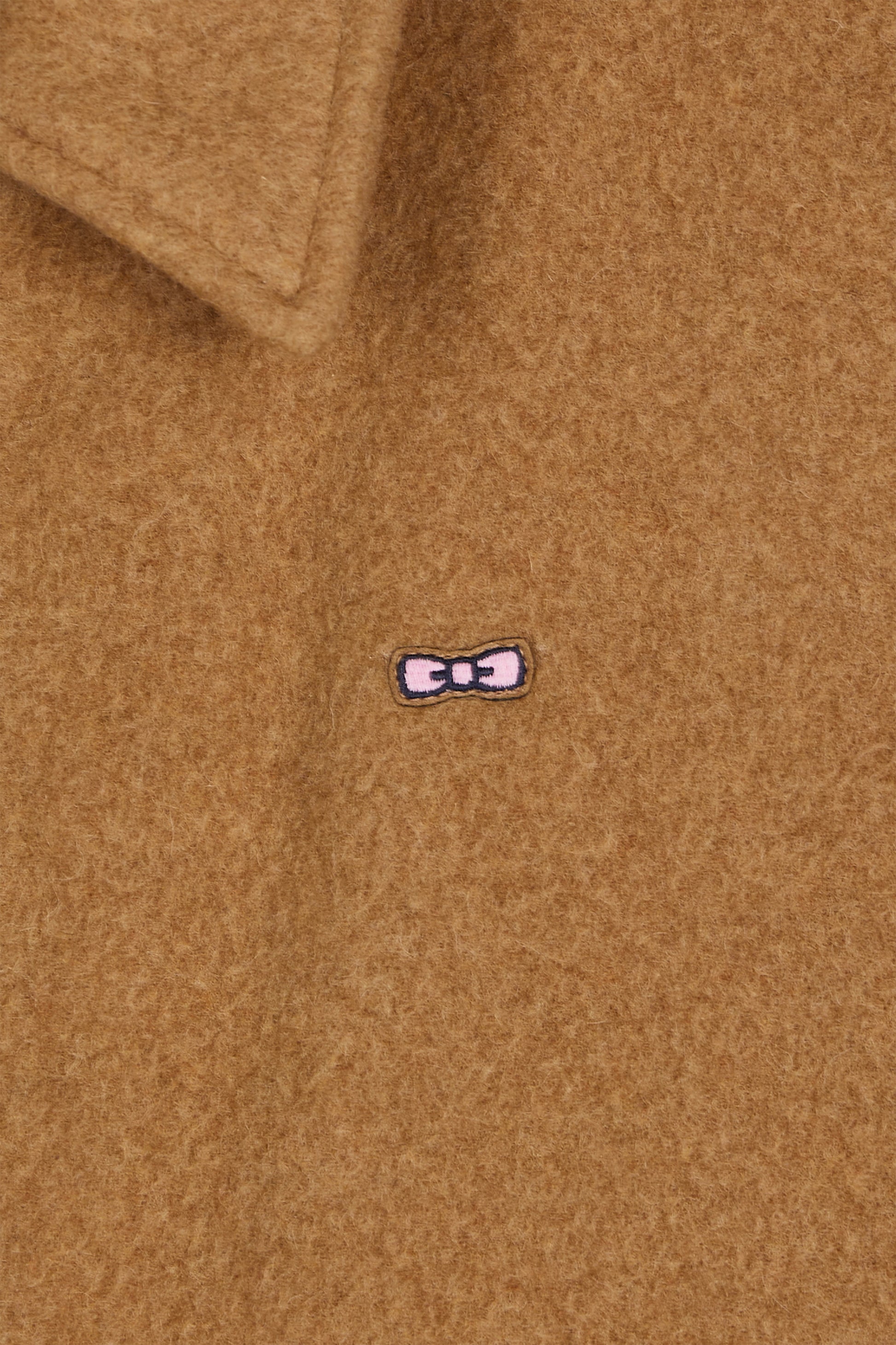 Clean lines and controlled warmth for this boiled wool jacket in camel or navy. Its straight cut is structured by a silver-tone metal double-slider zip and two flap pockets with snap fastenings. Camel-ringed inner lining, premium finishes and a gum bow on a felt base at the chest give this piece a minimalist, timeless elegance.