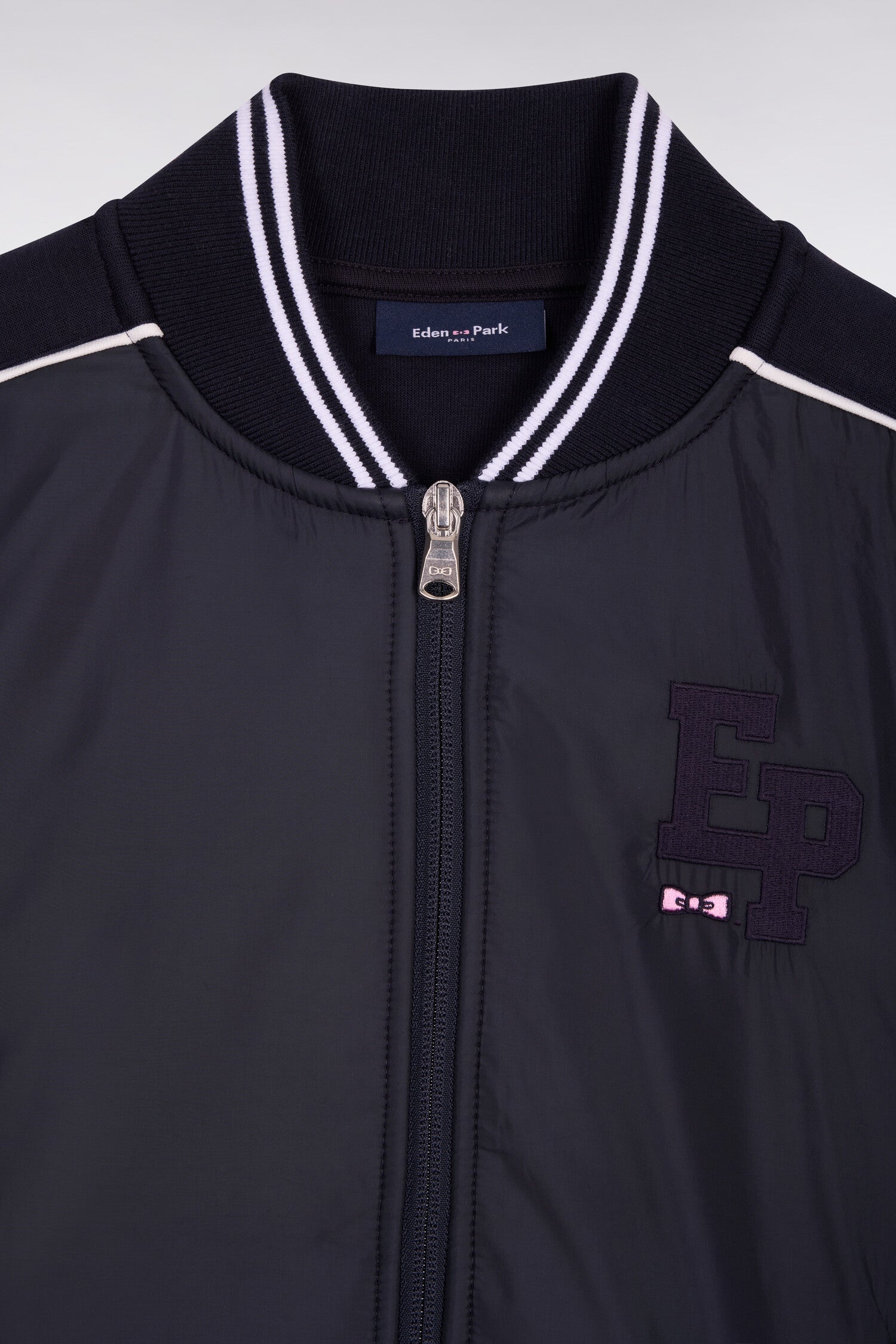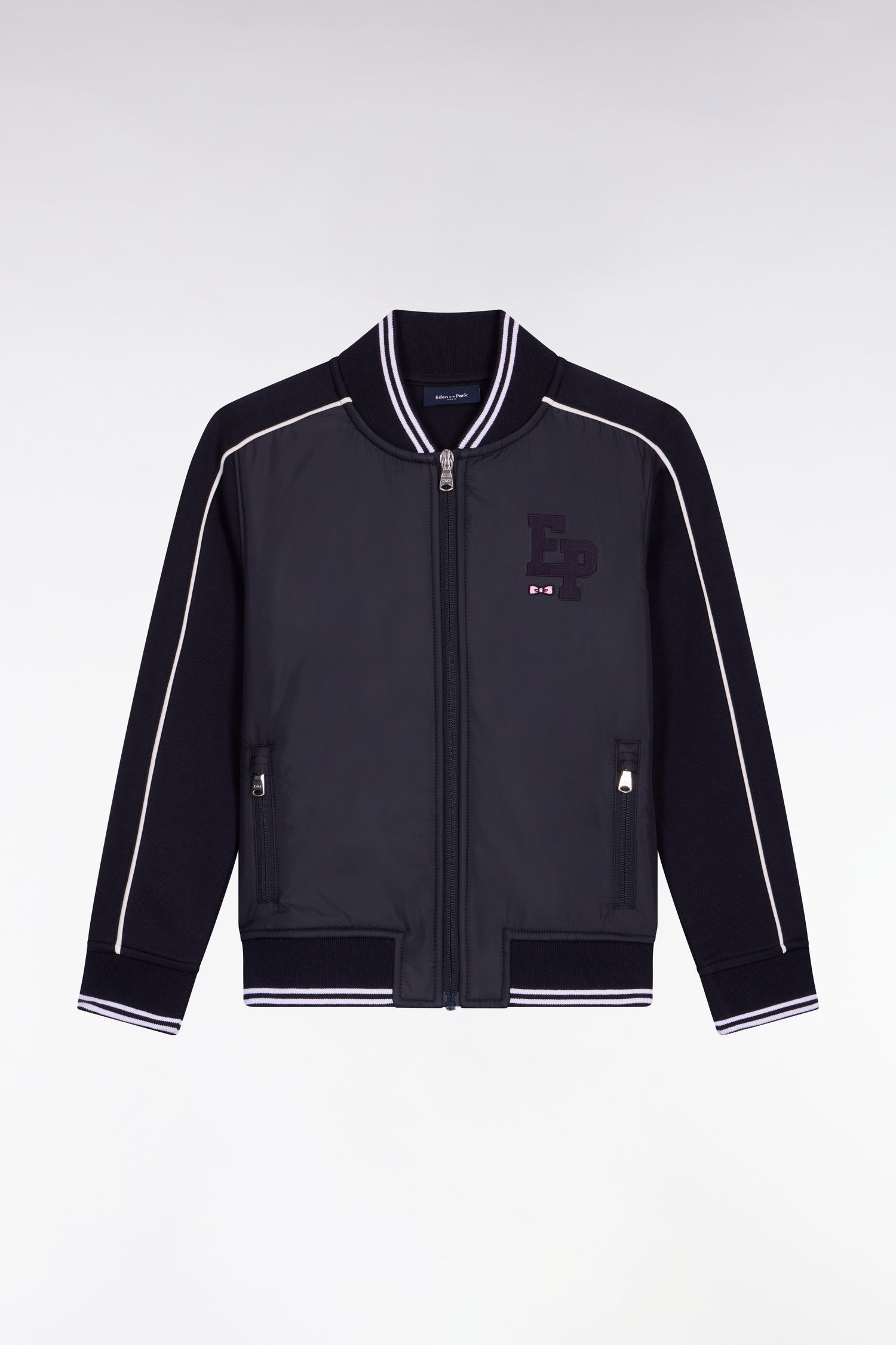 This starter jacket with a striped teddy collar combines a nylon front with an interlock cotton back and sleeves to combine style and comfort. Its EP patch affixed to the chest, its zipped pockets and its striped sleeve edges, hem and collar inspired by American sportswear give it an assertive character. An ideal mini-me piece to wear from the morning at the playground until the weekend, always ready to keep up with the little ones. This children's jacket combines style and quality with the same standards as our adult wardrobe.