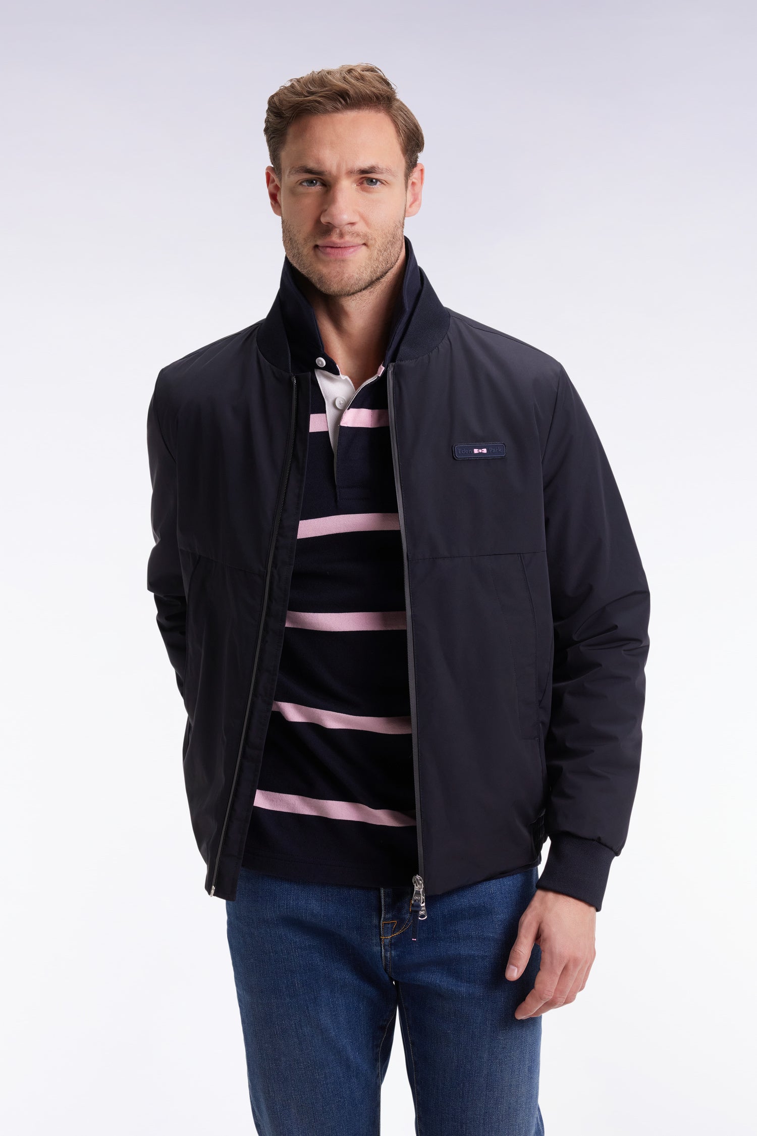 Sporty elegance and technical details for this navy Starter jacket in nylon lined with quilted nylon. The cut-outs on the front and back structure the silhouette, while the meticulous finishing touches - Aquagard zips, piped zipped pockets and ribbed edges - underline its character. The inimitable Eden Park touch? A tricolor ribbon subtly slipped under the neckline and its gum logo barrette!
