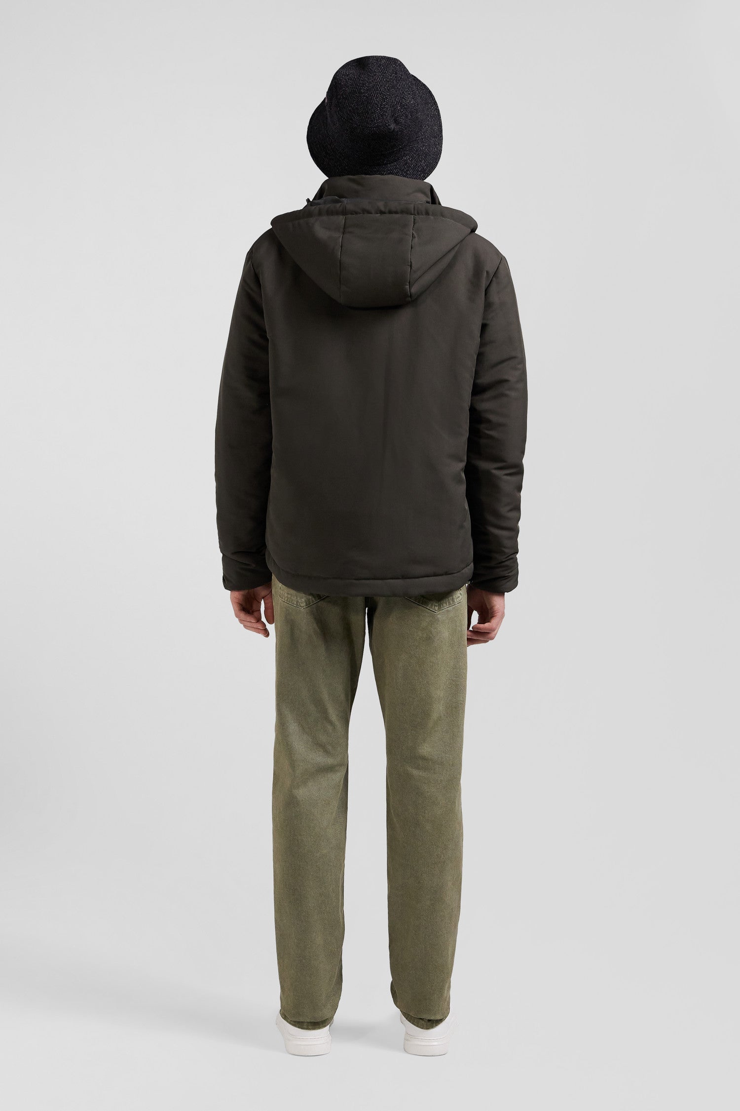 Discover the perfect blend of functionality and style with this peach-skin-feel nylon jacket. Complete with a fixed snap-fastening hood and plain nylon lining, this men's jacket offers comfort and protection. Its signature two-way zip and piped pockets combine with two zipped inside pockets for maximum practicality. The sleeves are trimmed with knitted ribbing.