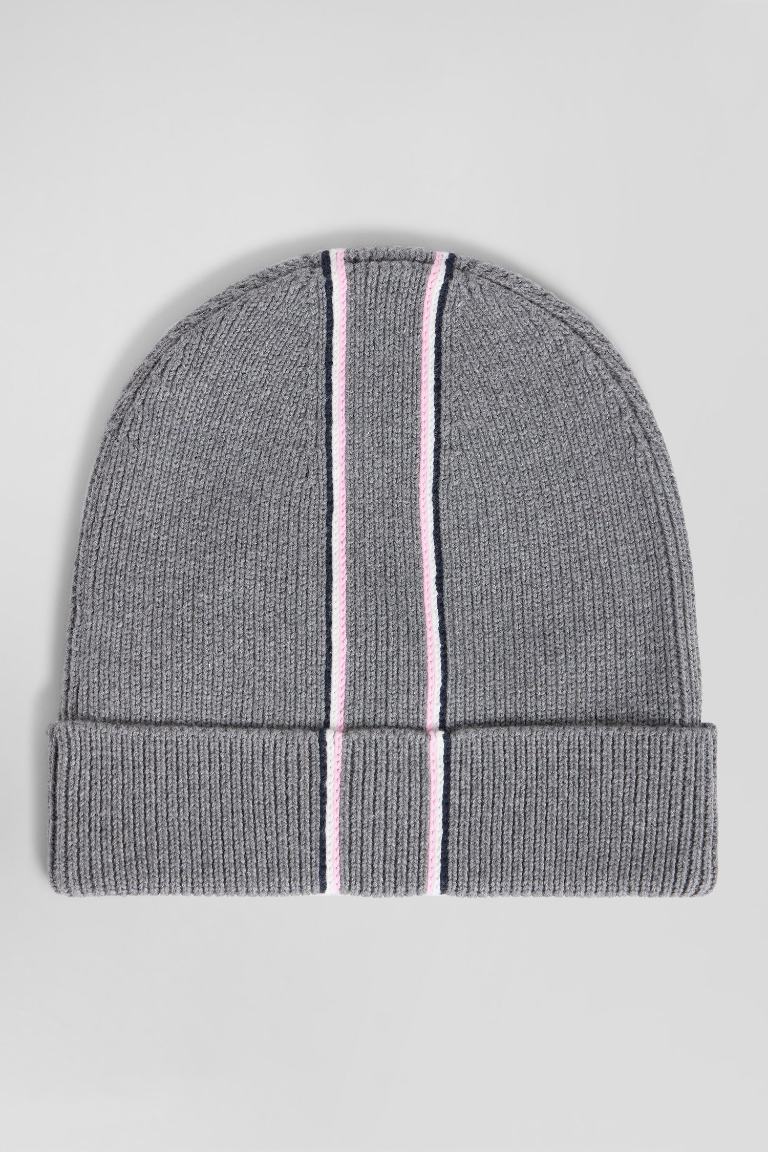 Grey cotton beanie with pink and white stripes