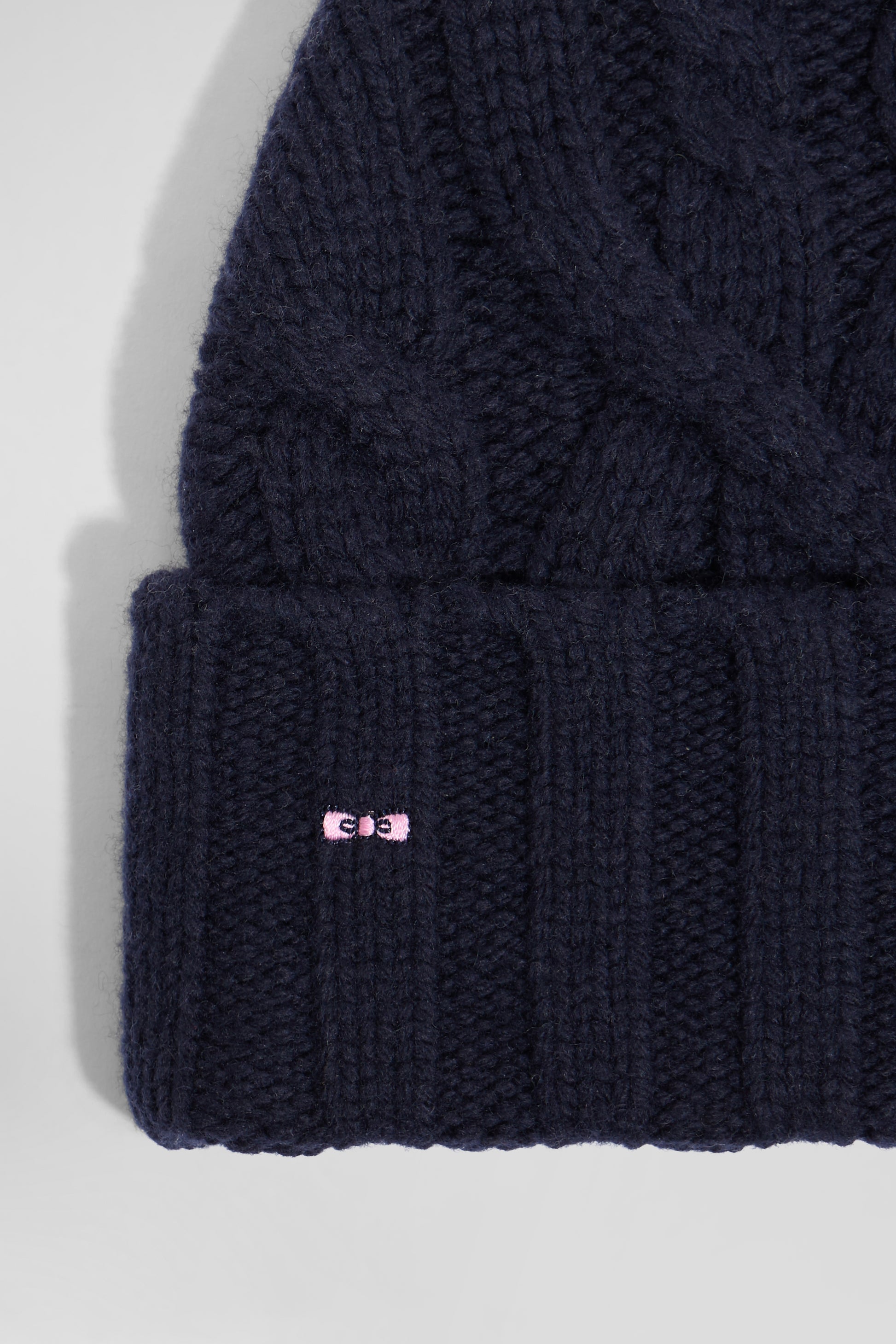 With its twists and turns, this beanie adds an authentic winter touch to any cold-weather outfit. Available in luminous ecru or timeless navy, this virgin wool beanie features a hint of recycled polyamide for added durability, and is adorned with our discreet pink bowtie embroidery.