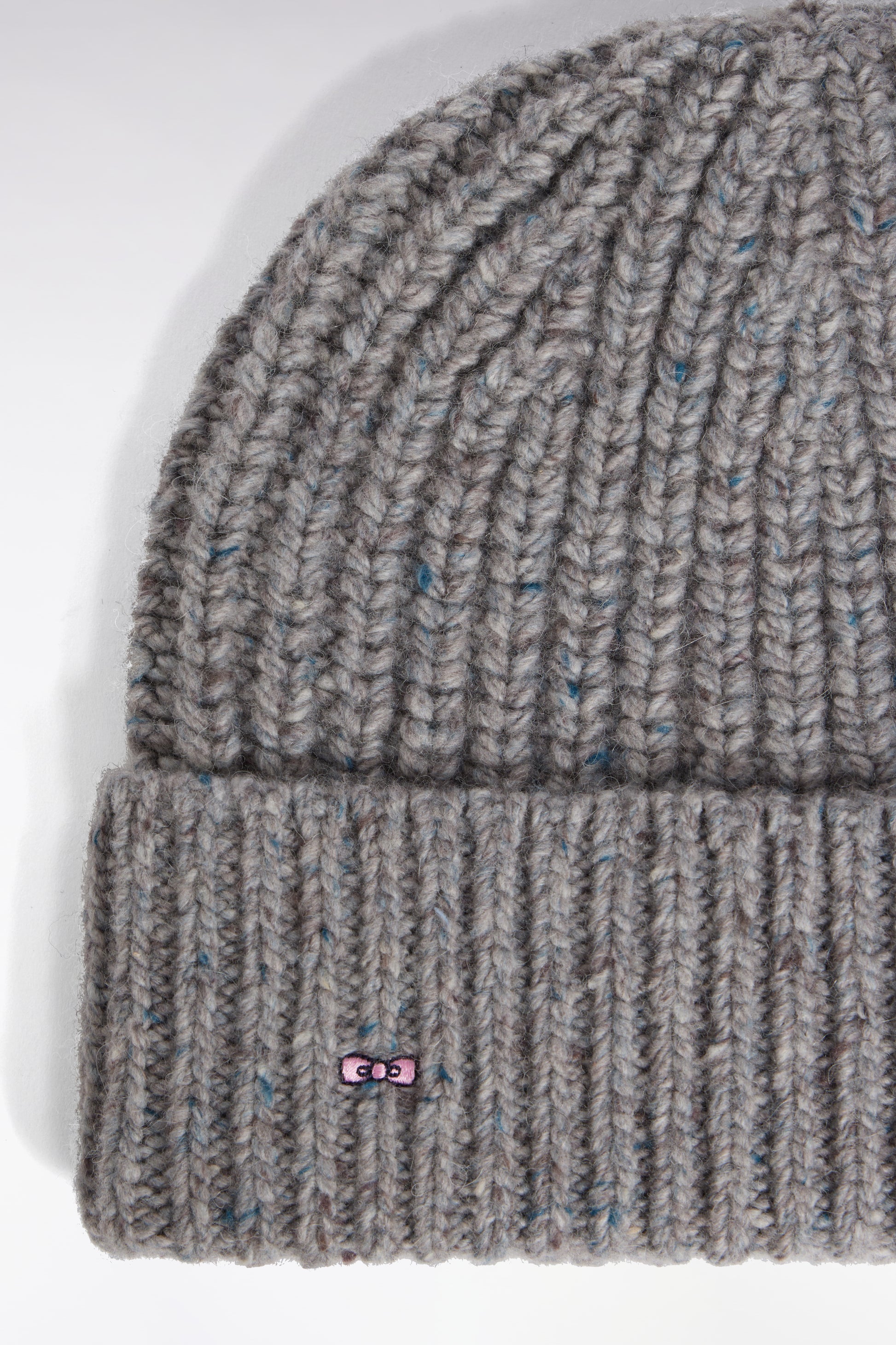 Knitted in a soft blend of virgin wool and alpaca, this ribbed knit cap features our discreet bowtie embroidery on the lapel. A soft, comfortable beanie to accessorize a multitude of silhouettes.