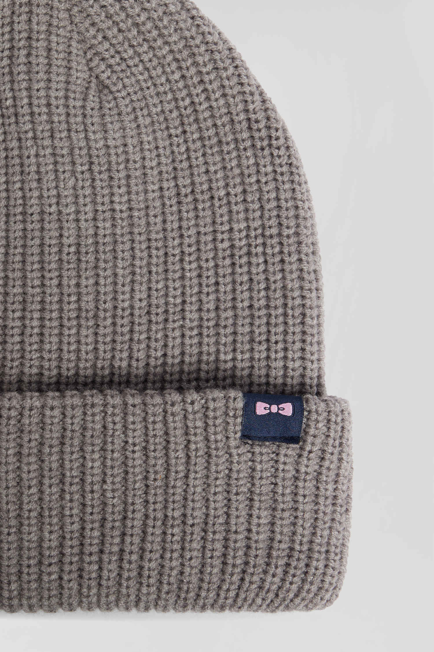 Mottled grey knitted beanie with bow tie embroidery