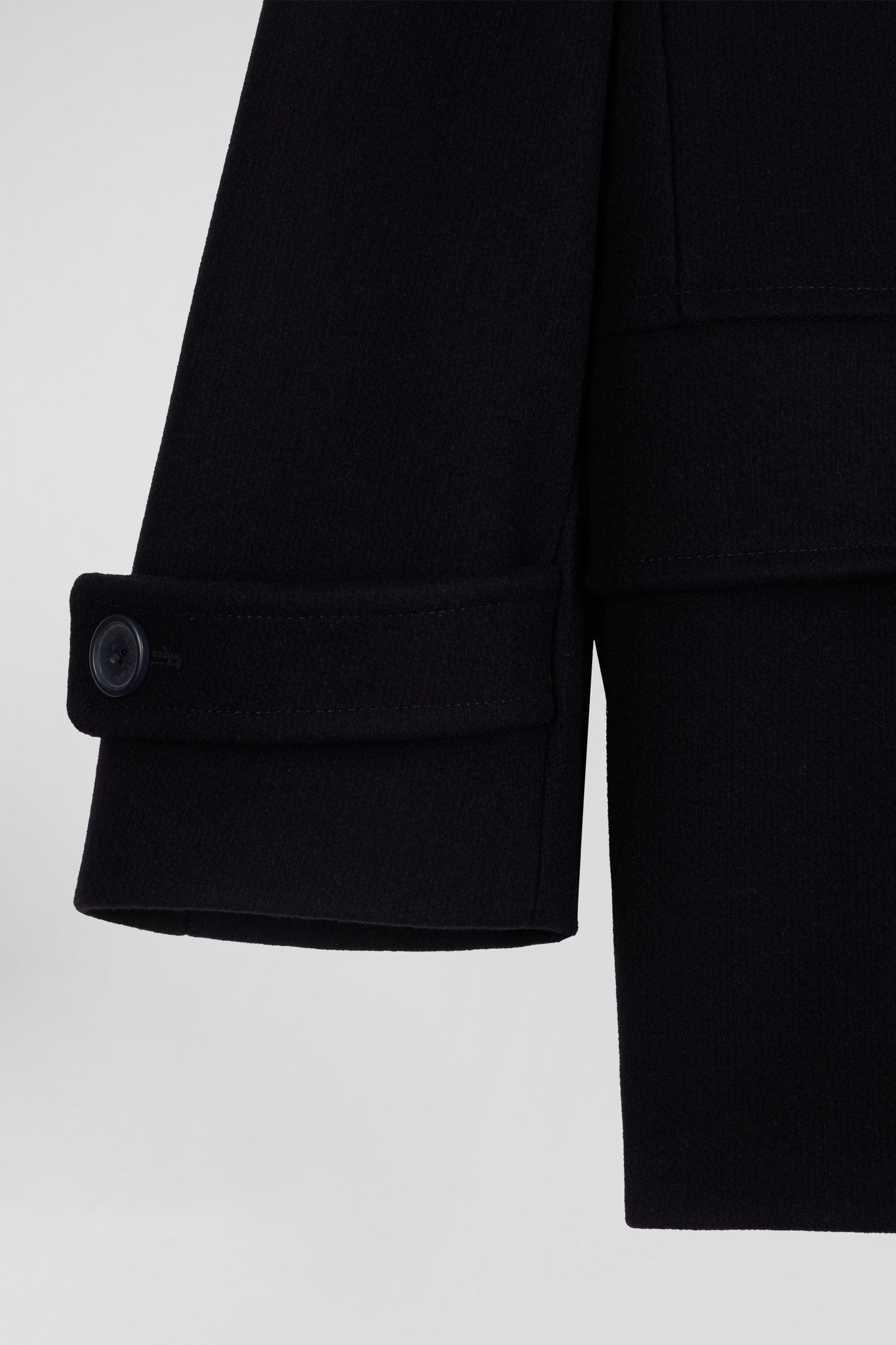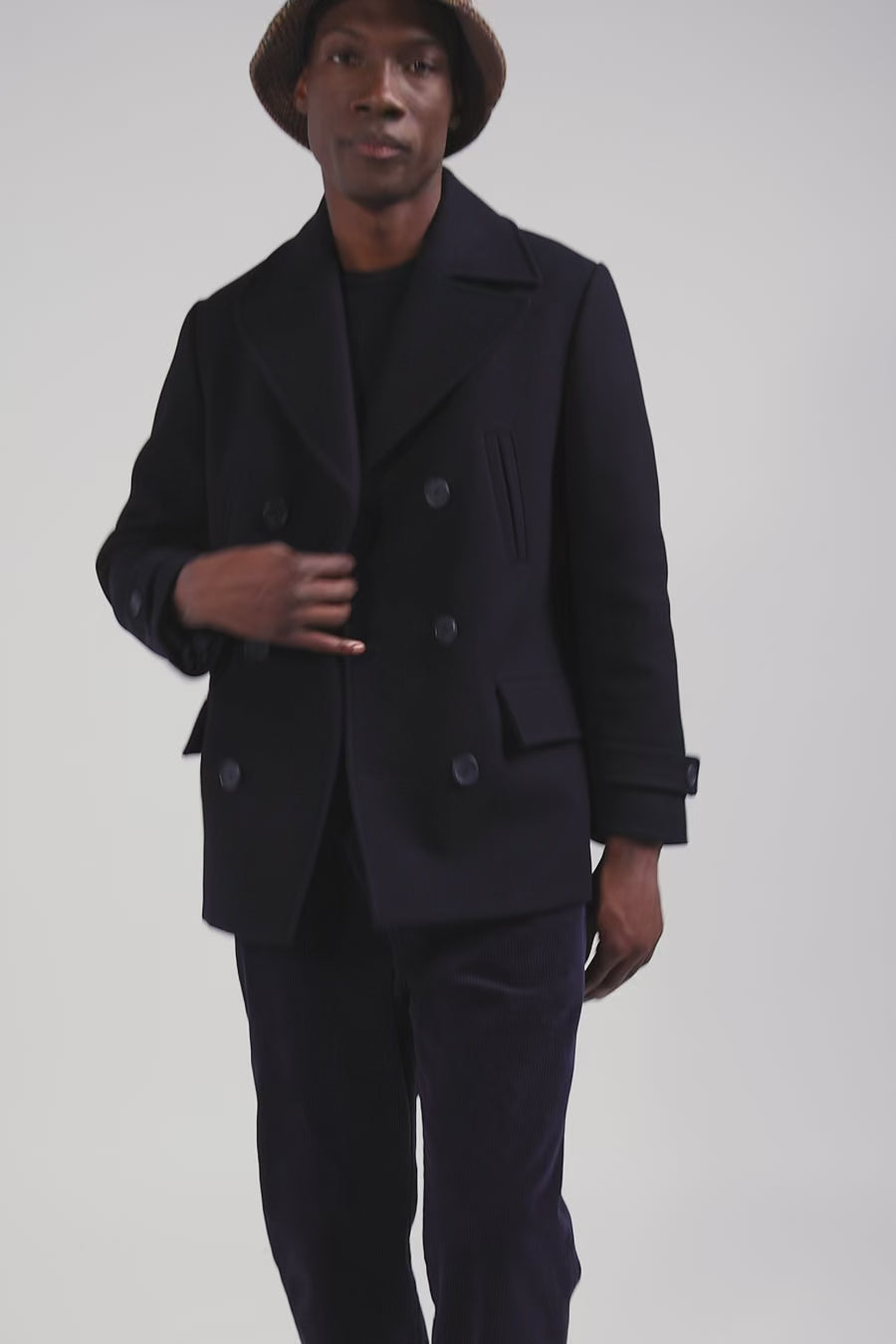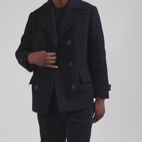 Our navy wool-blend pea coat is a revisited classic. This men's coat features double-breasted buttoning and embodies all the codes of this iconic and timeless men's wardrobe piece. Perfect for winter elegance, it combines traditional styling with contemporary elegance for a sophisticated look on any occasion.