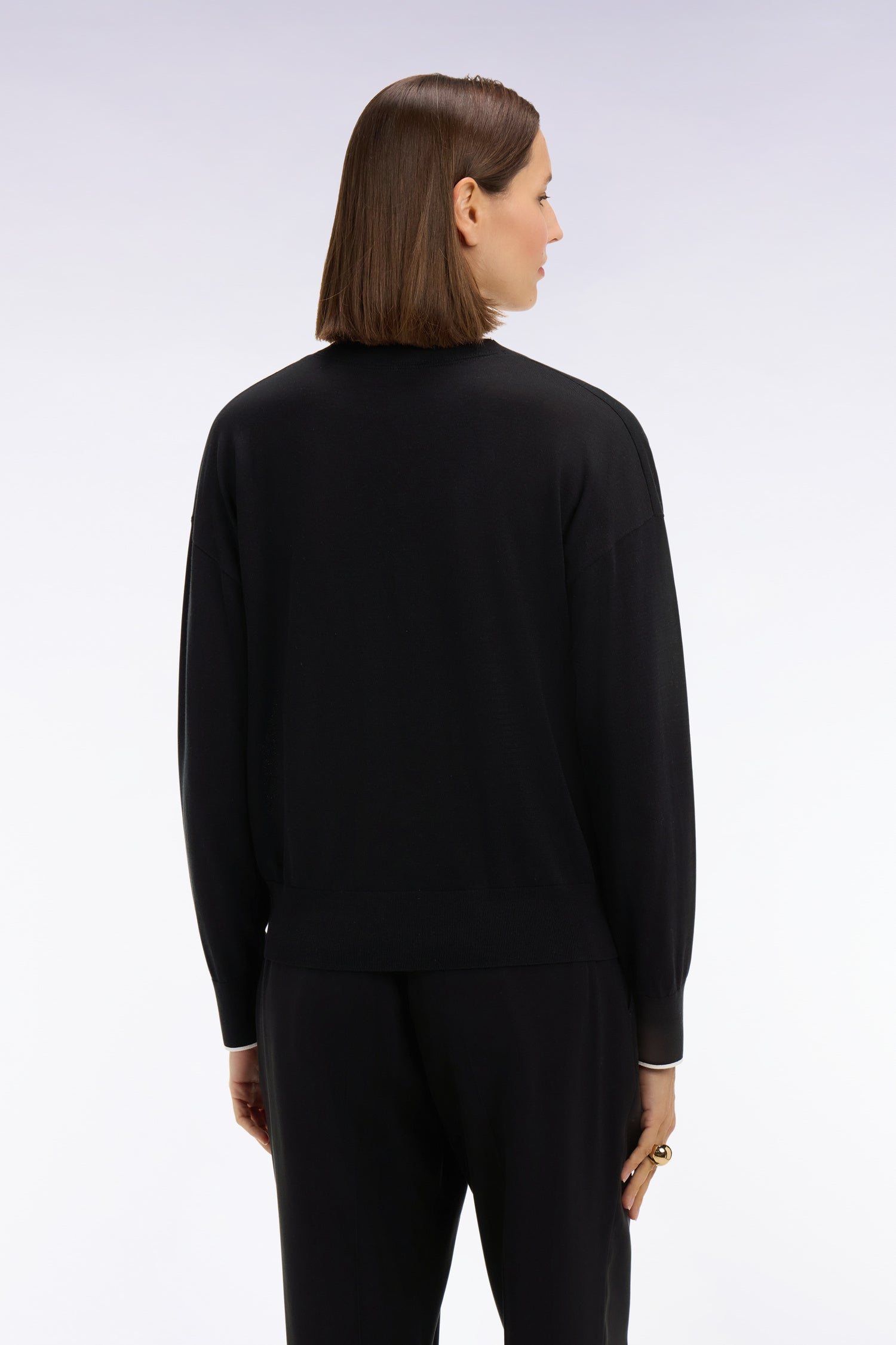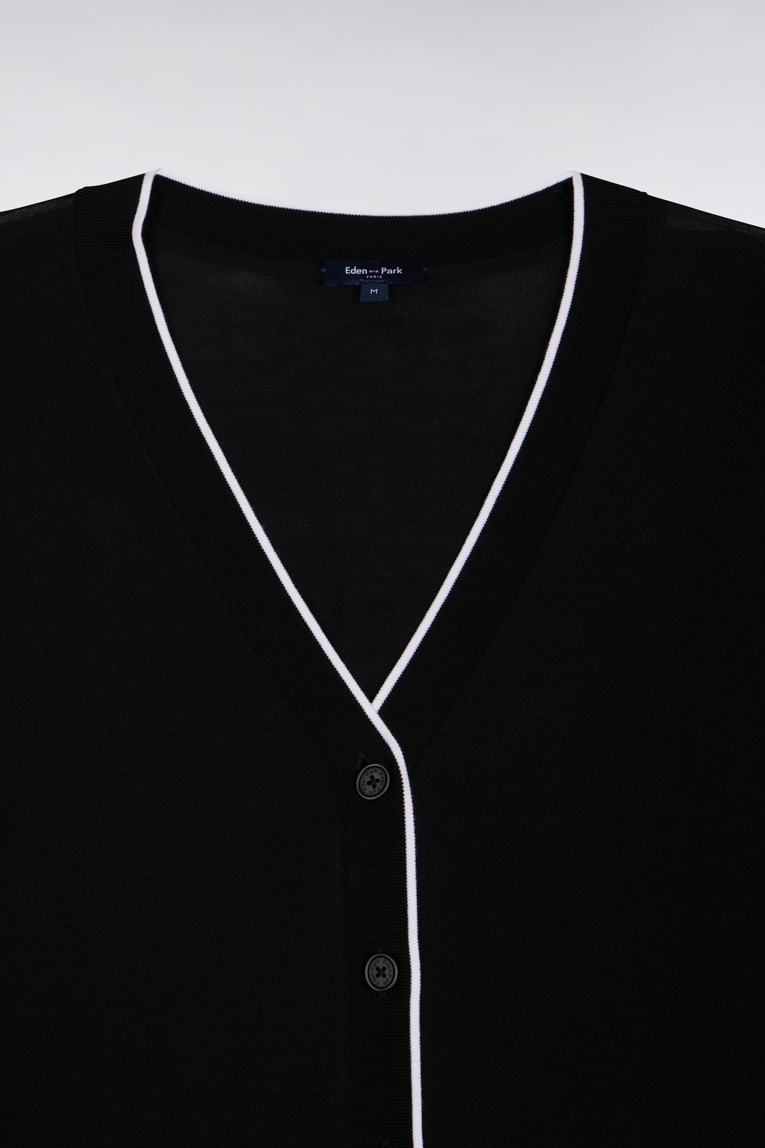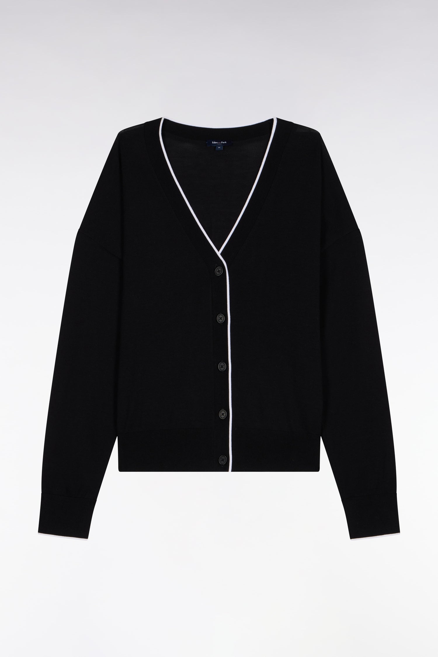 Notre cardigan col V, confectionné dans un mélange fluide et léger de Tencel, coton et soie, séduit par sa douceur exceptionnelle et son tomber. Sa coupe relaxed assure une allure effortless, tandis que le liseré contrasté en bordure d'encolure et patte de boutonnage structure délicatement la silhouette, se déclinant en noir ou en blanc selon le coloris choisi pour renforcer le caractère graphique de ce cardigan. À porter sur un débardeur près du corps, son pull à manches courtes dans l'un ou l'autre des coloris ou à même la peau pour apprécier toute sa douceur. Cardigan femme offert en coloris noir ou blanc.