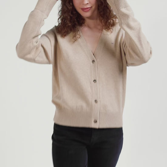 This timeless wool and cotton cardigan is available in six timeless colors to match your entire fall-winter wardrobe. Featuring classic buttoning and a V-neckline, this cardigan is slightly loose-fitting for easy layering, with ribbing at the sleeves and waist for a perfect fit. It's a safe choice for adding a touch of warmth and style to your wardrobe.