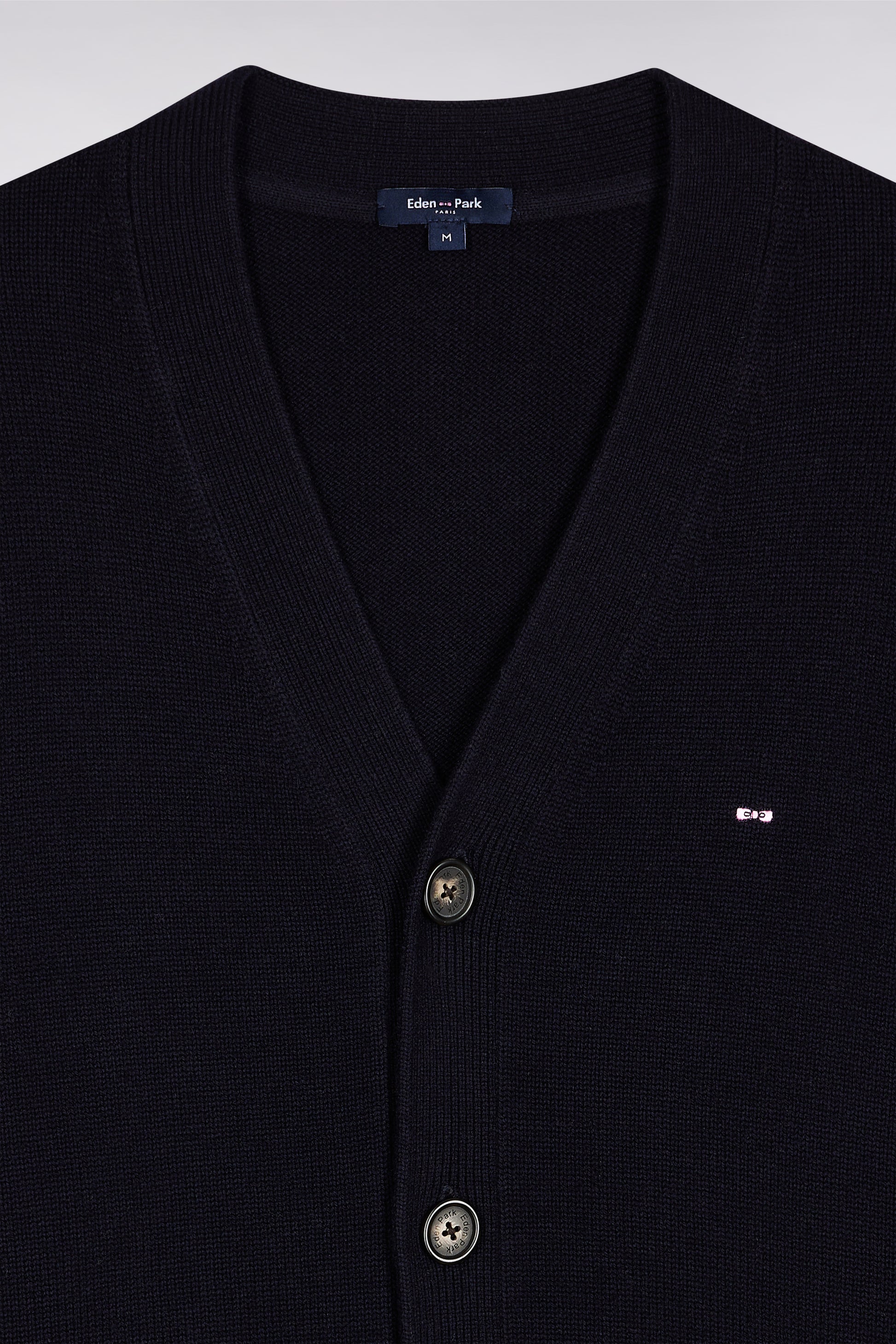 Our house style can be recognized by its subtle balance between rigorous cut, quality materials and freedom of detail. With its thick, flat-knit fabric in a soft wool-cotton blend, this V-neck cardigan embodies the perfect blend of craftsmanship and durability. Designed to last, its sturdy construction and meticulous finishing, from the button placket to the ribbed edges, make it a strong piece in the men's wardrobe, capable of weathering the seasons without losing its elegance. The pink bowtie embroidery discreetly marks this exceptional piece, true to the Eden Park heritage.
