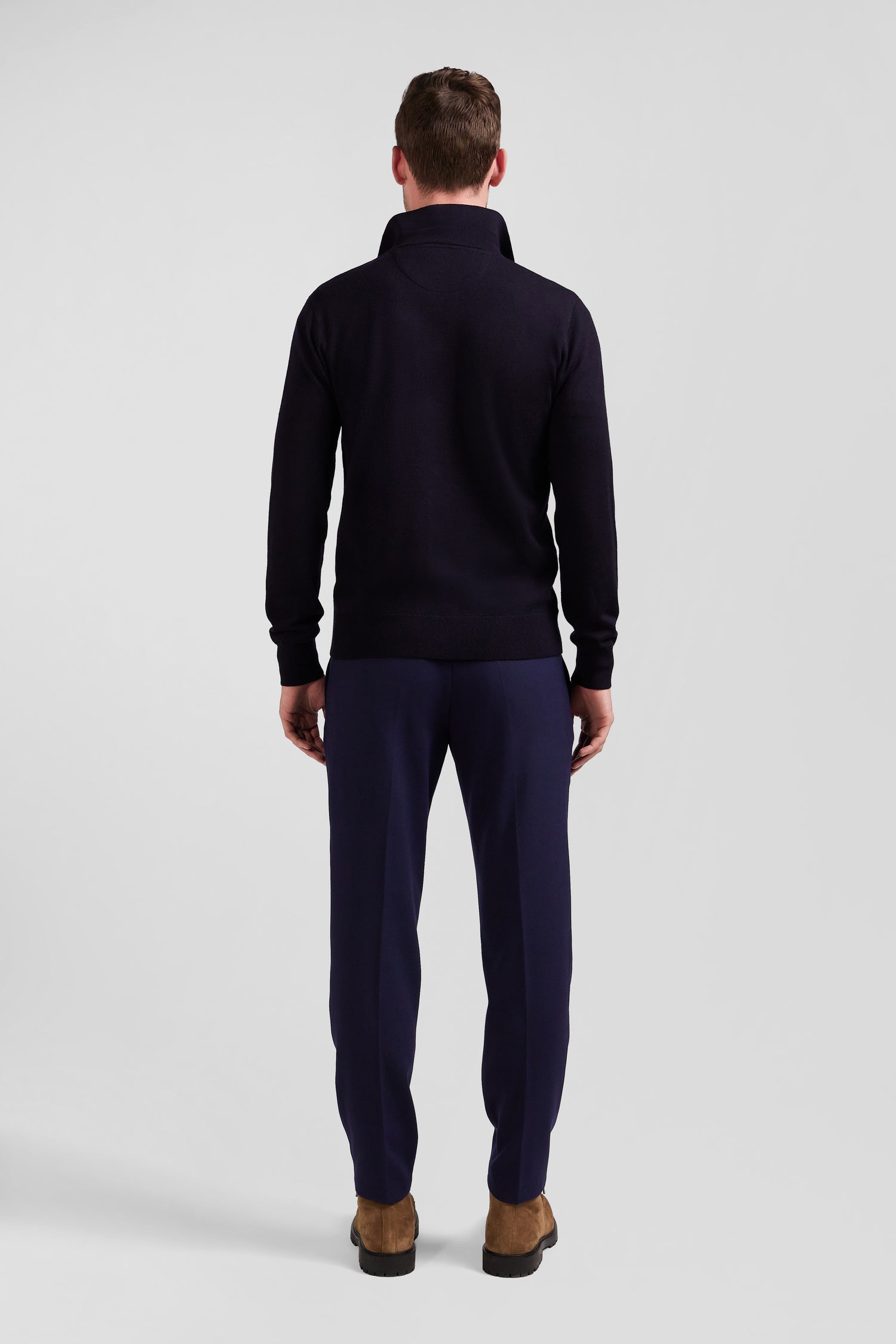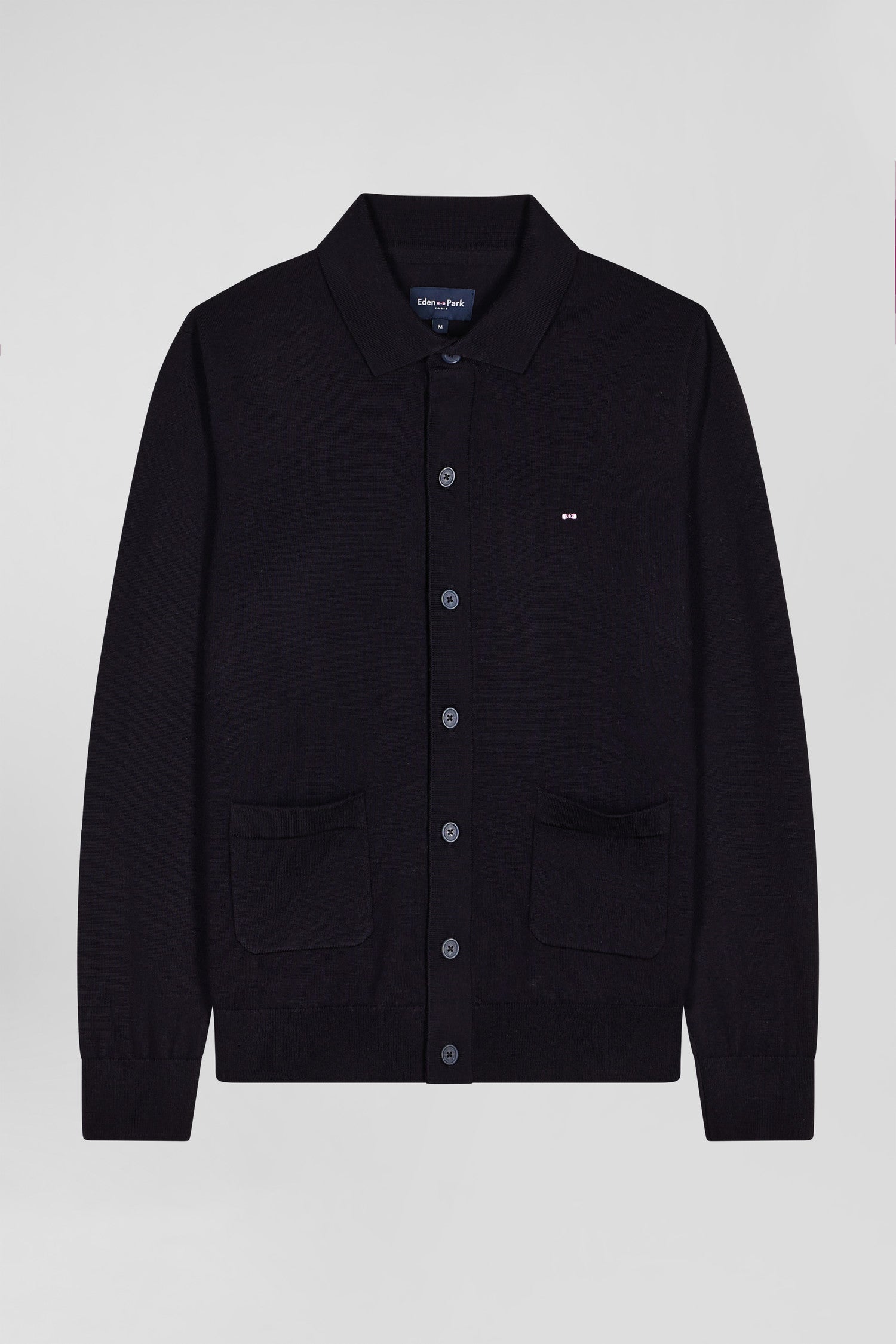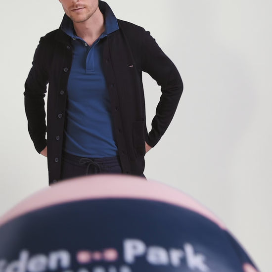 Our luxurious button-down merino wool cardigan combines warmth and refinement. Its finely knitted button placket is combined with a rugby jersey-style collar, enhanced by a milano knit collar stand effect, for a sportier touch. Its knitted finish and two patch pockets add functional elegance to this masculine cardigan. Perfect for fall layering, this piece is a must-have for a classic yet contemporary look.