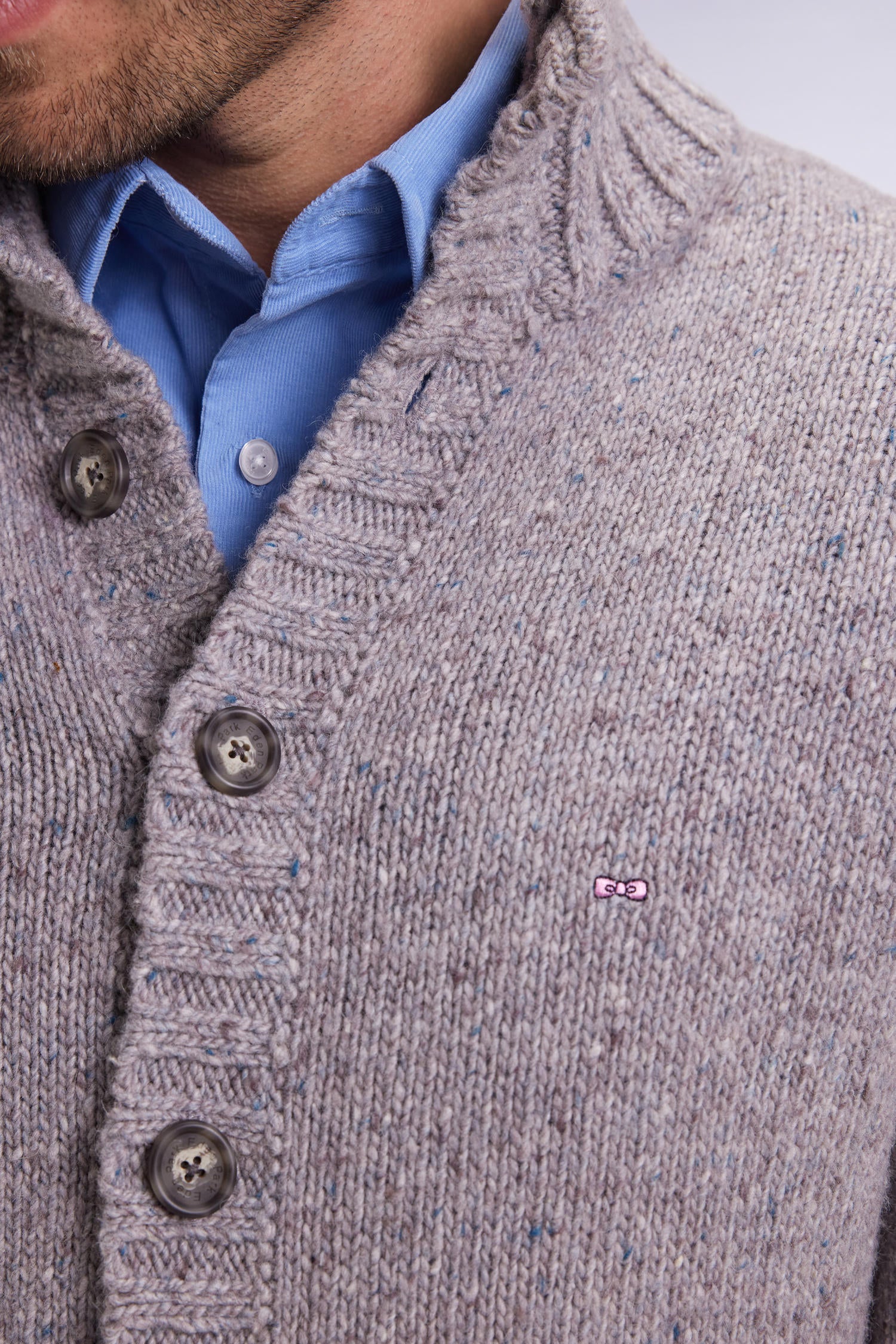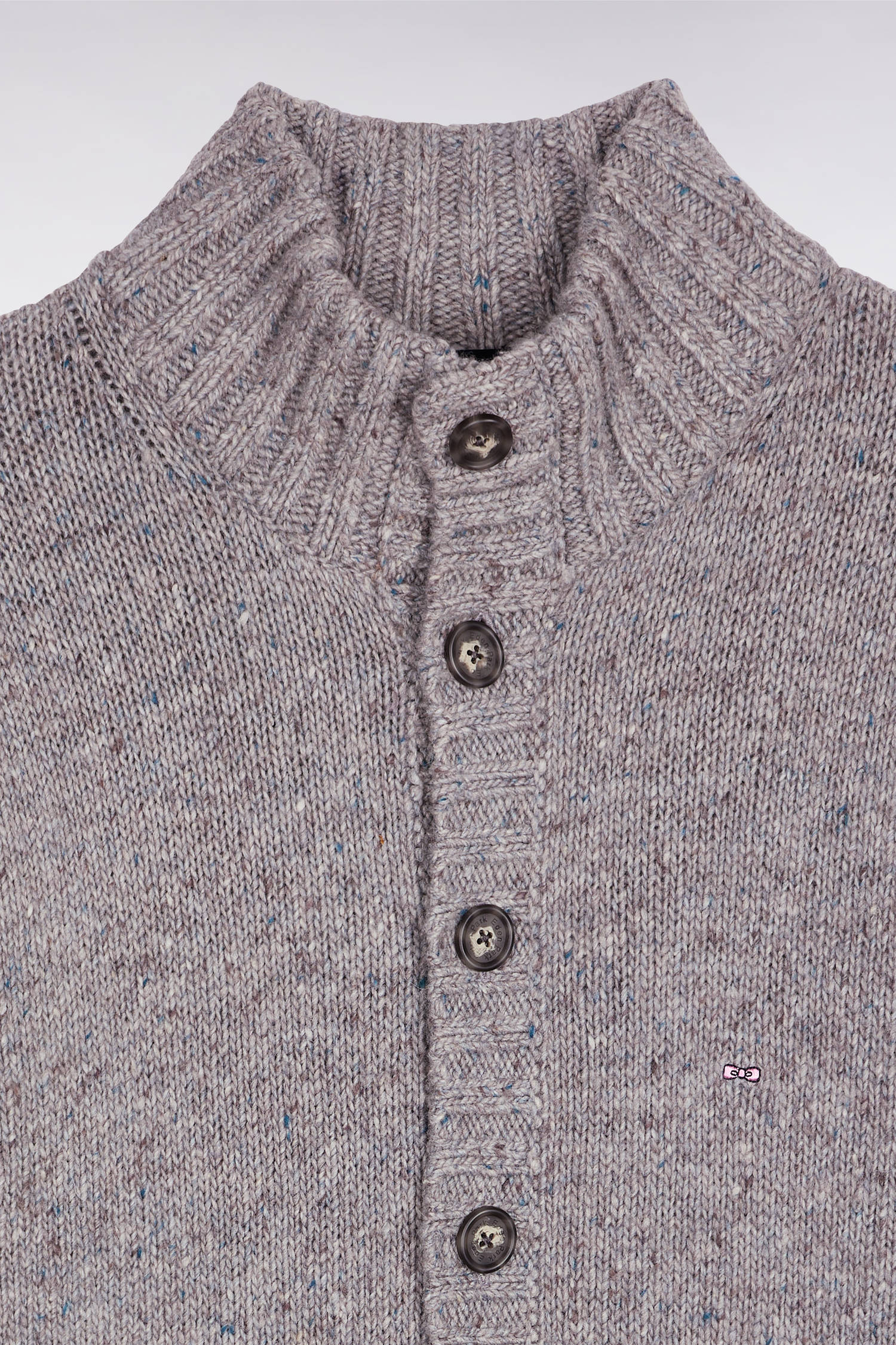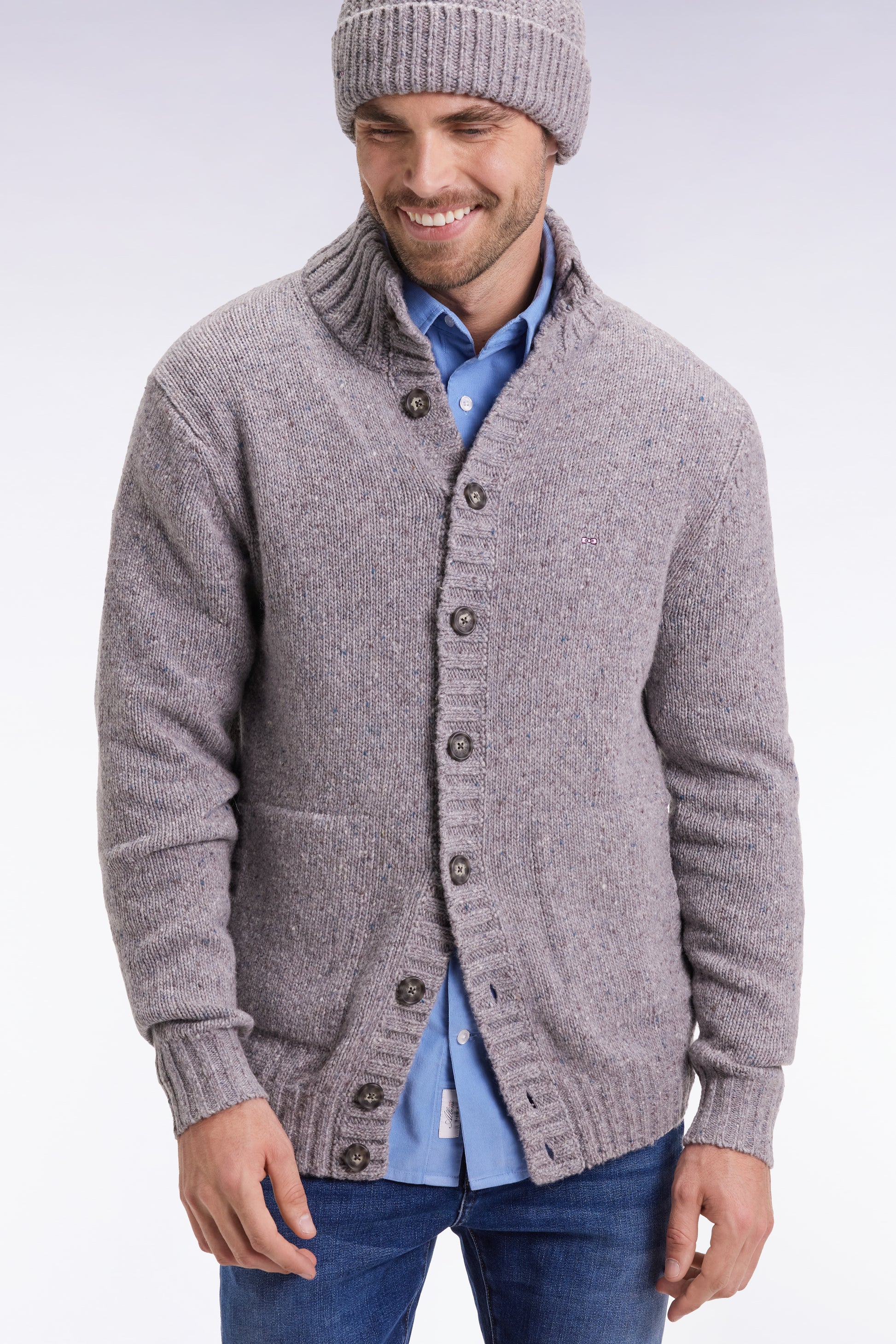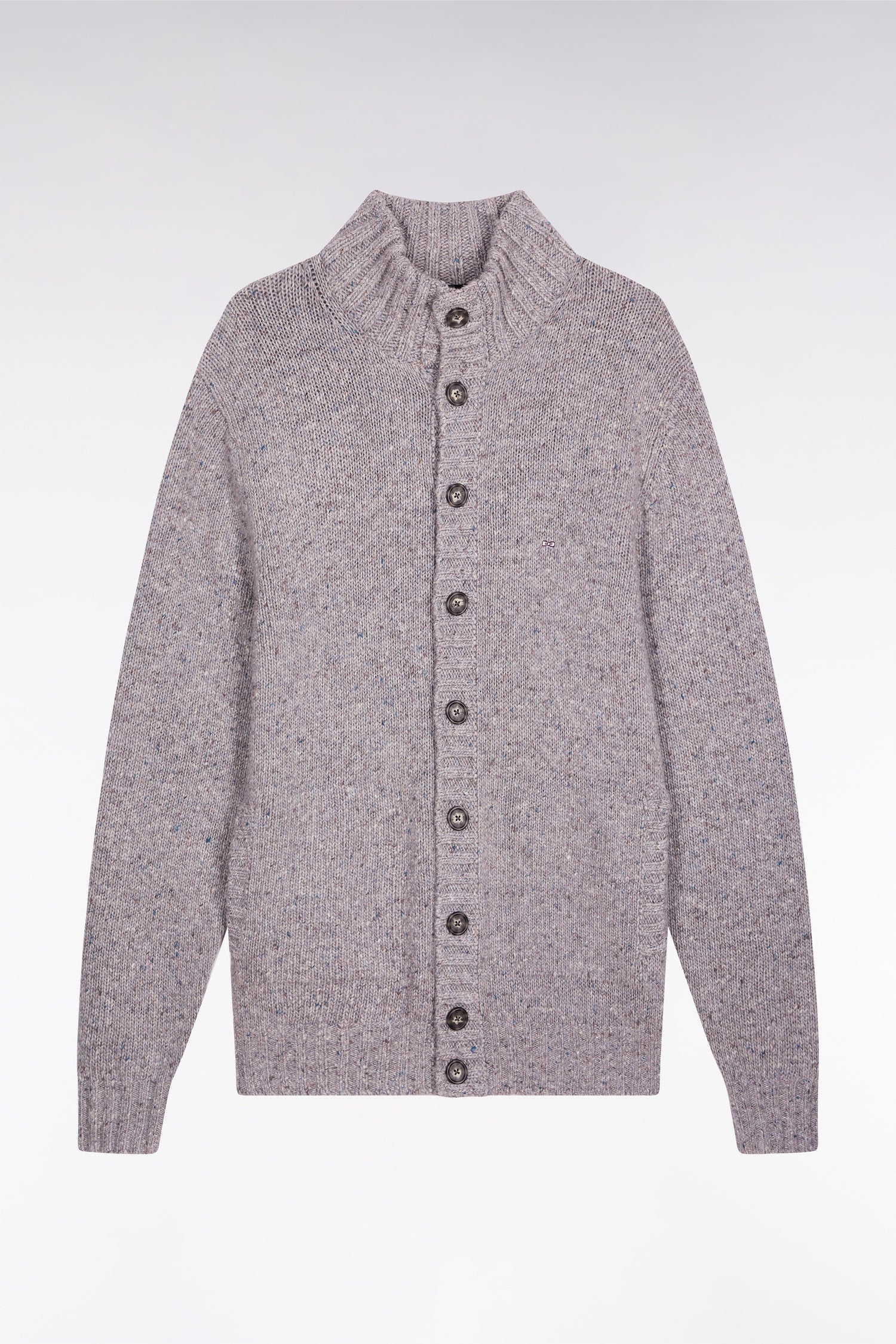 Made from a blend of virgin wool and alpaca, this men's high-collared cardigan emphasizes the natural warmth and softness of its fibers. Knitted in a thick knit, it adopts an easy-to-wear straight cut, designed to face winter with elegance. This gray cardigan, with its rib-knit structure, features side pockets.