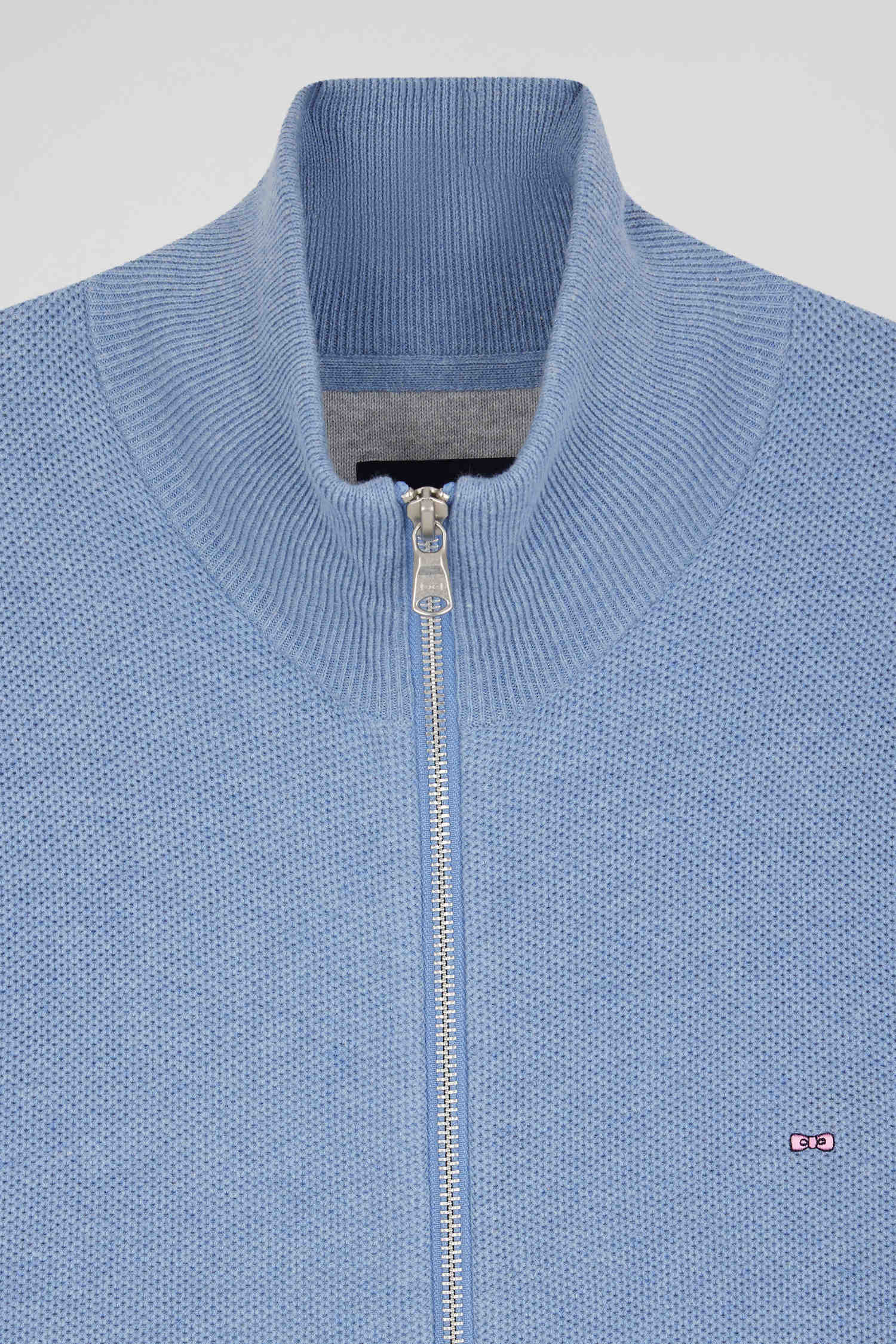Regular plain sky blue cotton high collar zipped cardigan