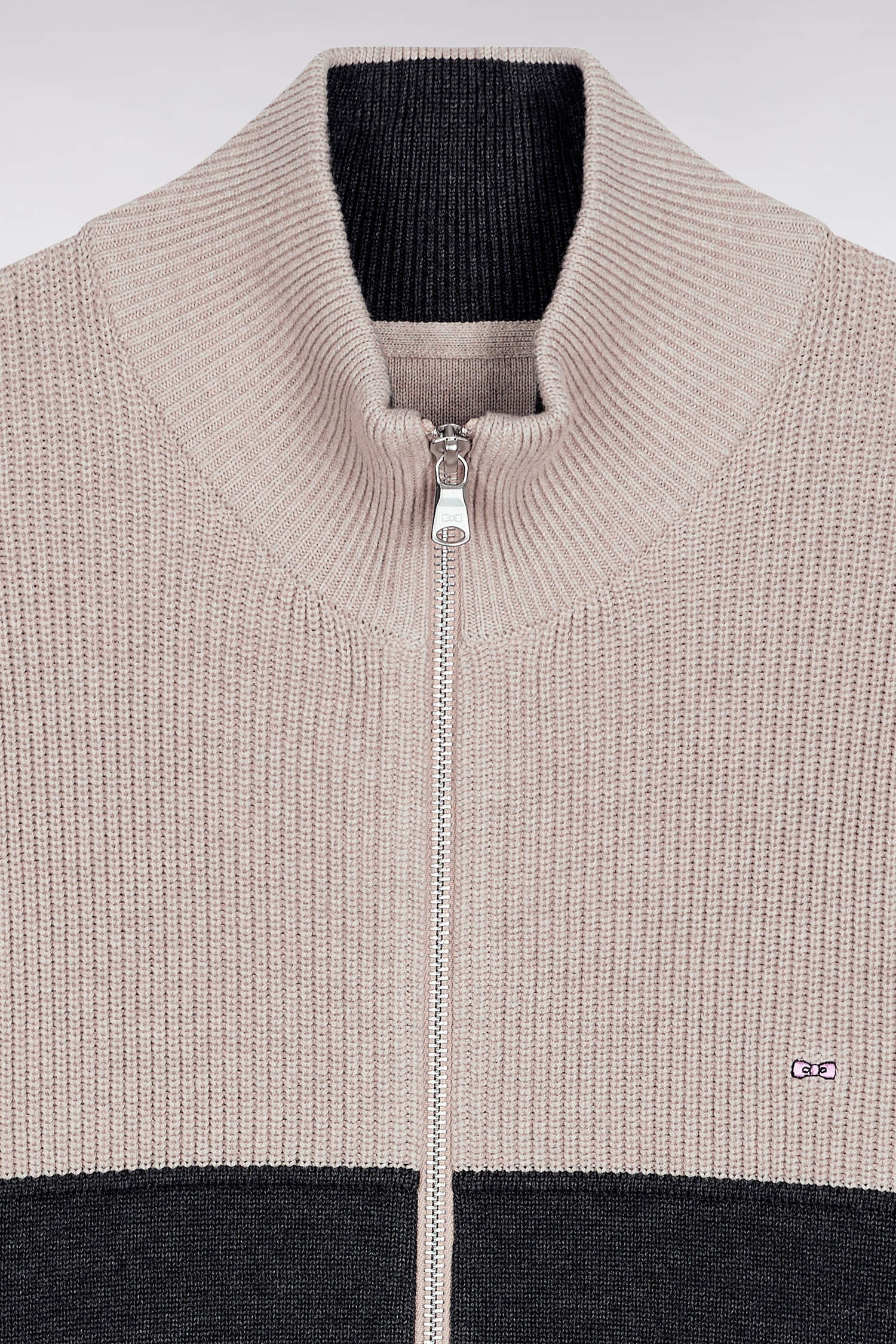 Zipped cardigan in two-tone beige and grey cotton, straight cut