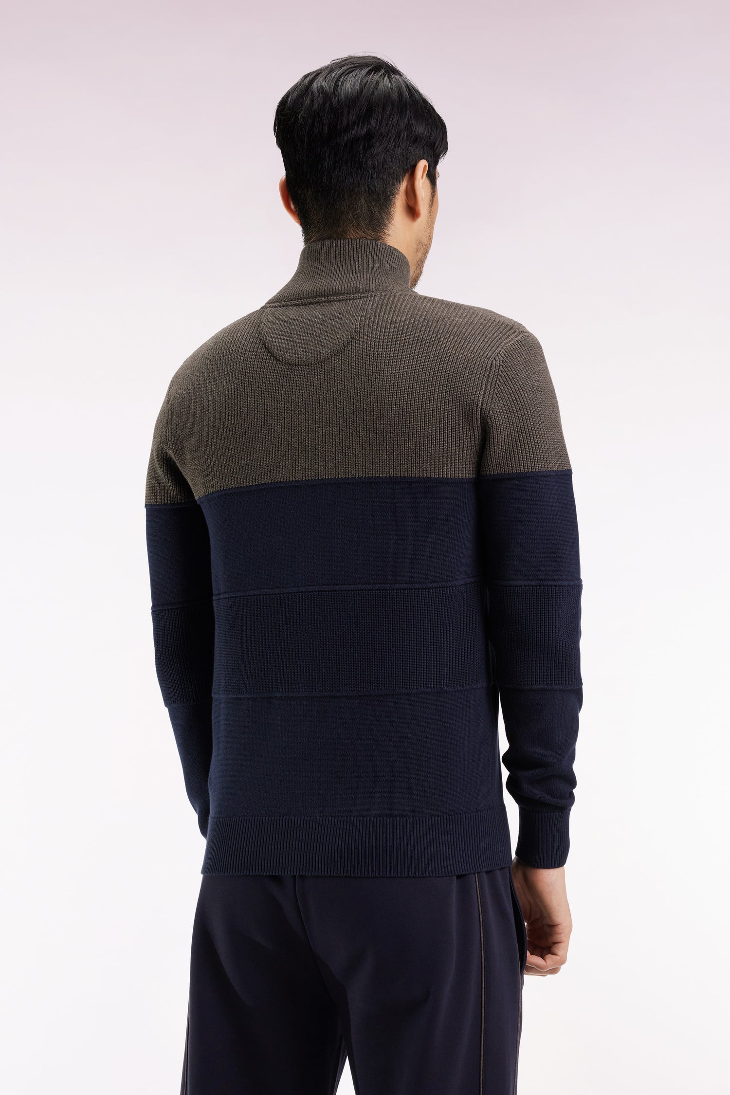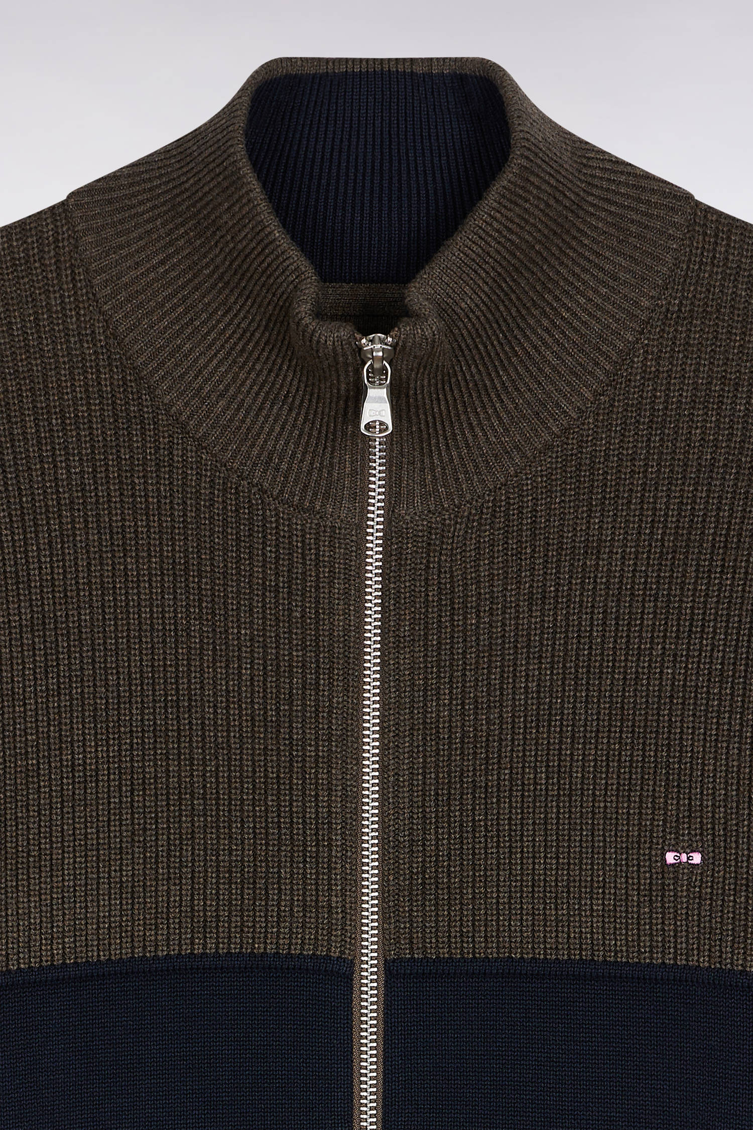 Zipped cardigan in two-tone navy and brown cotton, straight cut