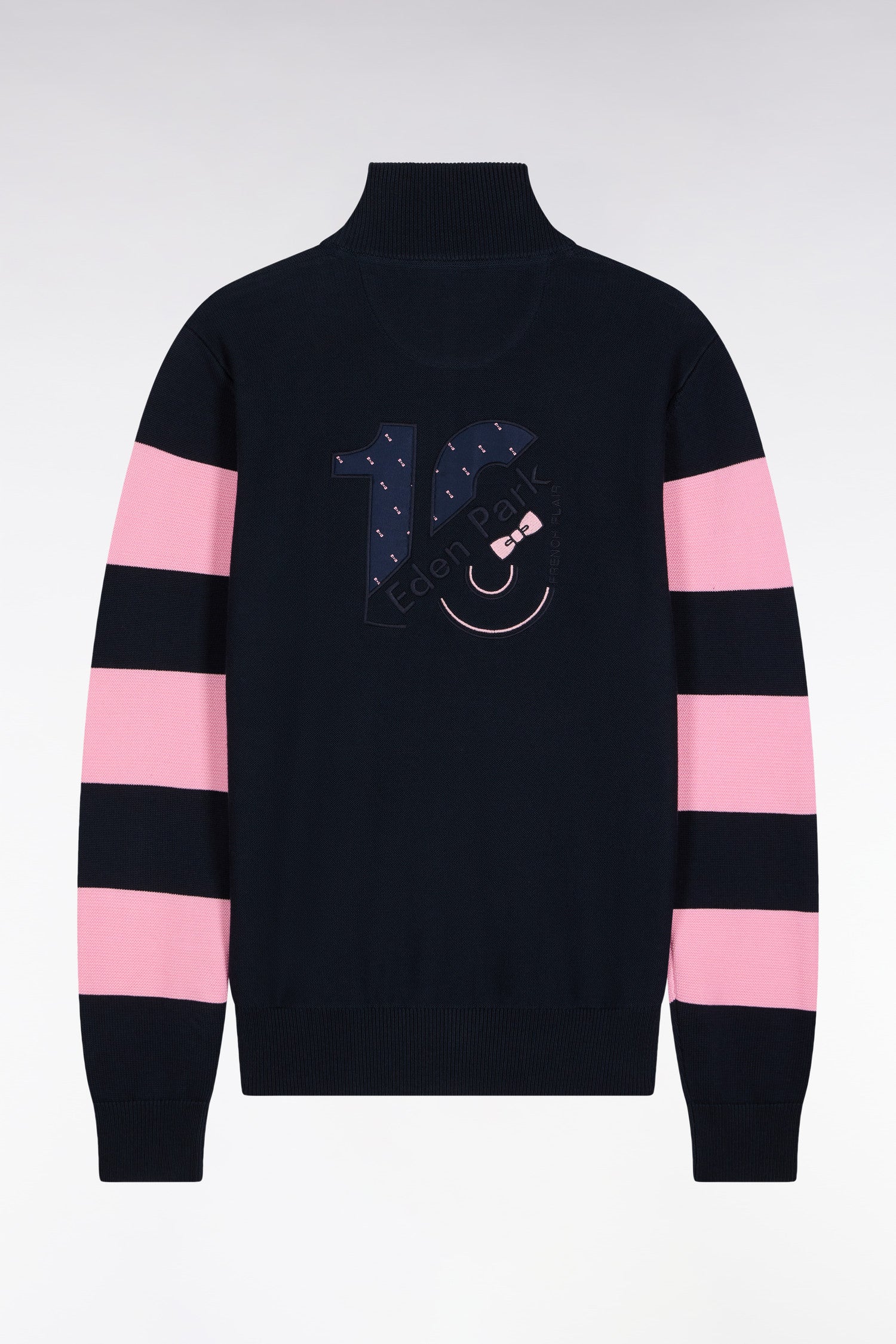Rugby in spirit, refinement in attitude: Eden Park has left its mark on the landscape of men's fashion with a unique, ever-recognizable line. With its wide pink rugby jersey-style stripes, this navy blue stand-up collar zipped cardigan revisits the Eden Park wardrobe in an assumed sport-chic version. Made in knitted cotton, it plays on contrasts with its sleeves hooped in a different stitch and its elegantly colored collar interior. Pink bowtie embroidery on the chest marks this iconic piece, revealing embroidery in the house's codes on the back.