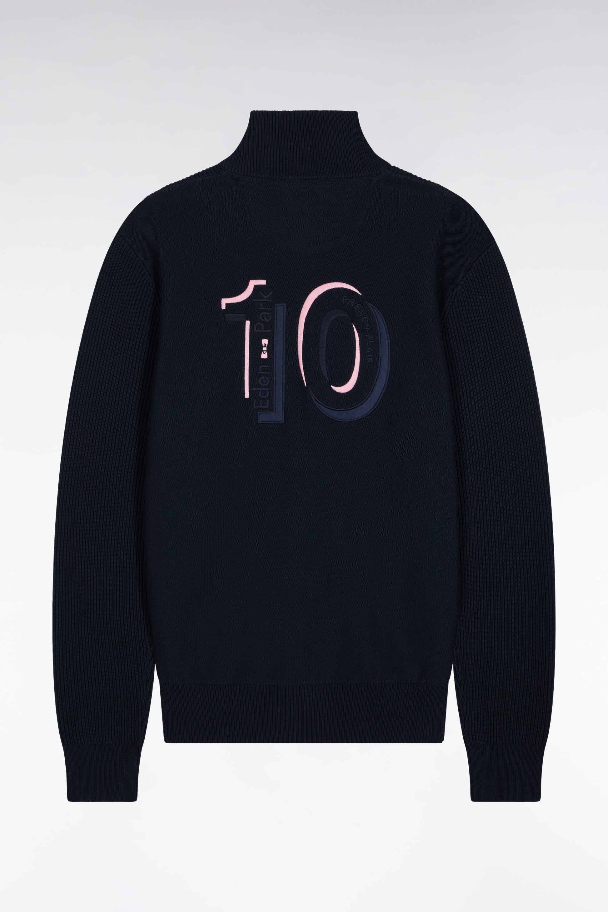 This zipped cardigan with stand-up collar and contrasting interior, revealed when worn open, imposes its graphic style with a play of contrasting horizontal stripes on the chest. Knitted in cotton, it combines ribbed knit on the sleeves and jersey on the body for a structured, comfortable look. On the back, this high collar zip sweater features a large embroidery, a subtle tribute to the rugby jersey of our founder, Franck Mesnel. A singular, recognizable look: the hallmark of French sport-chic elegance.
