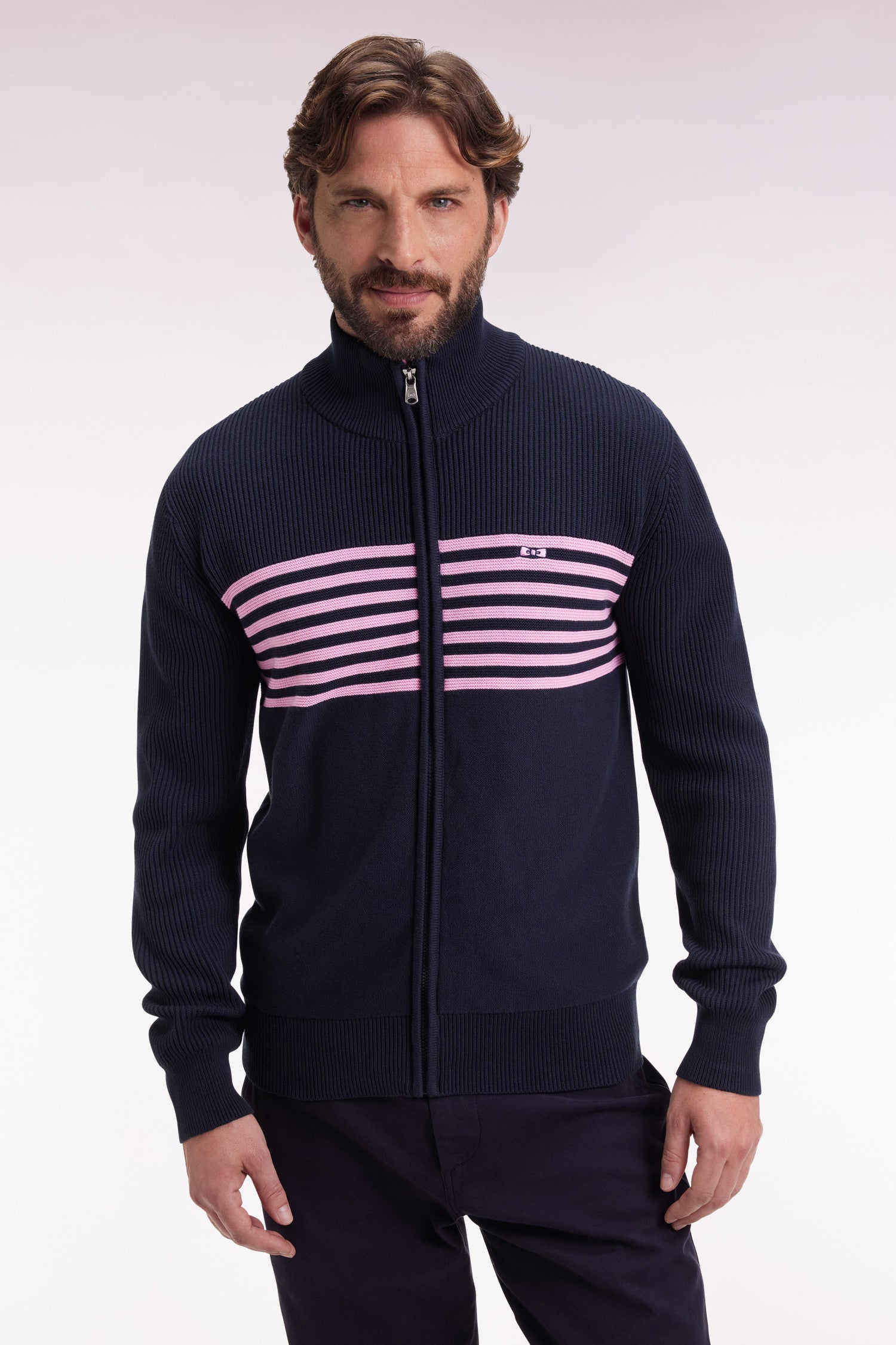 Zipped cardigan in navy cotton with pink stripes, straight cut