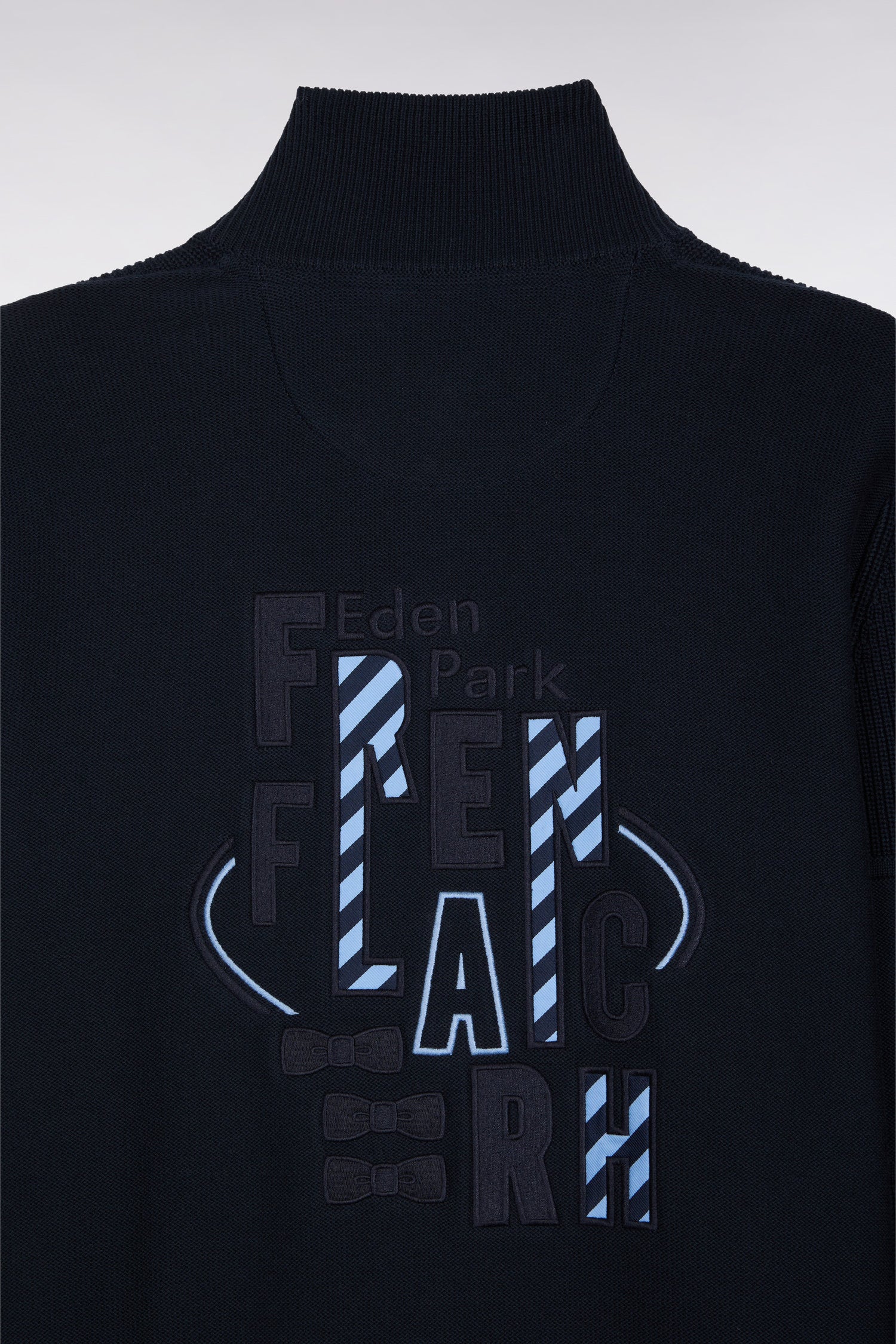 This straight-zip cardigan in pure cotton, knitted in a blend of jersey and English rib, embodies the sport-chic spirit so typical of Eden Park. On the back, its large French Flair embroidery is enhanced by a striped tie fabric: a typical detail of our fashion house's wardrobe.