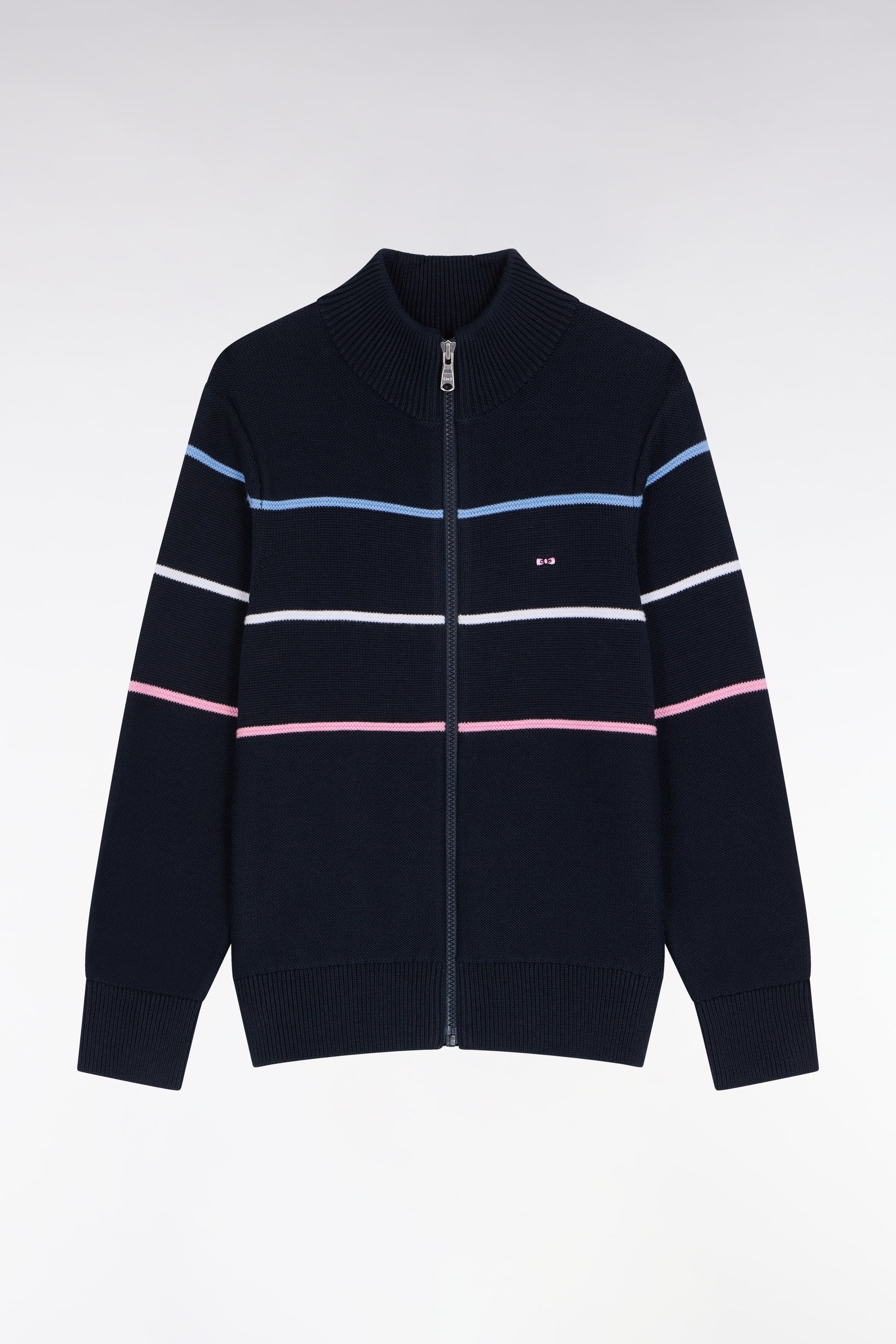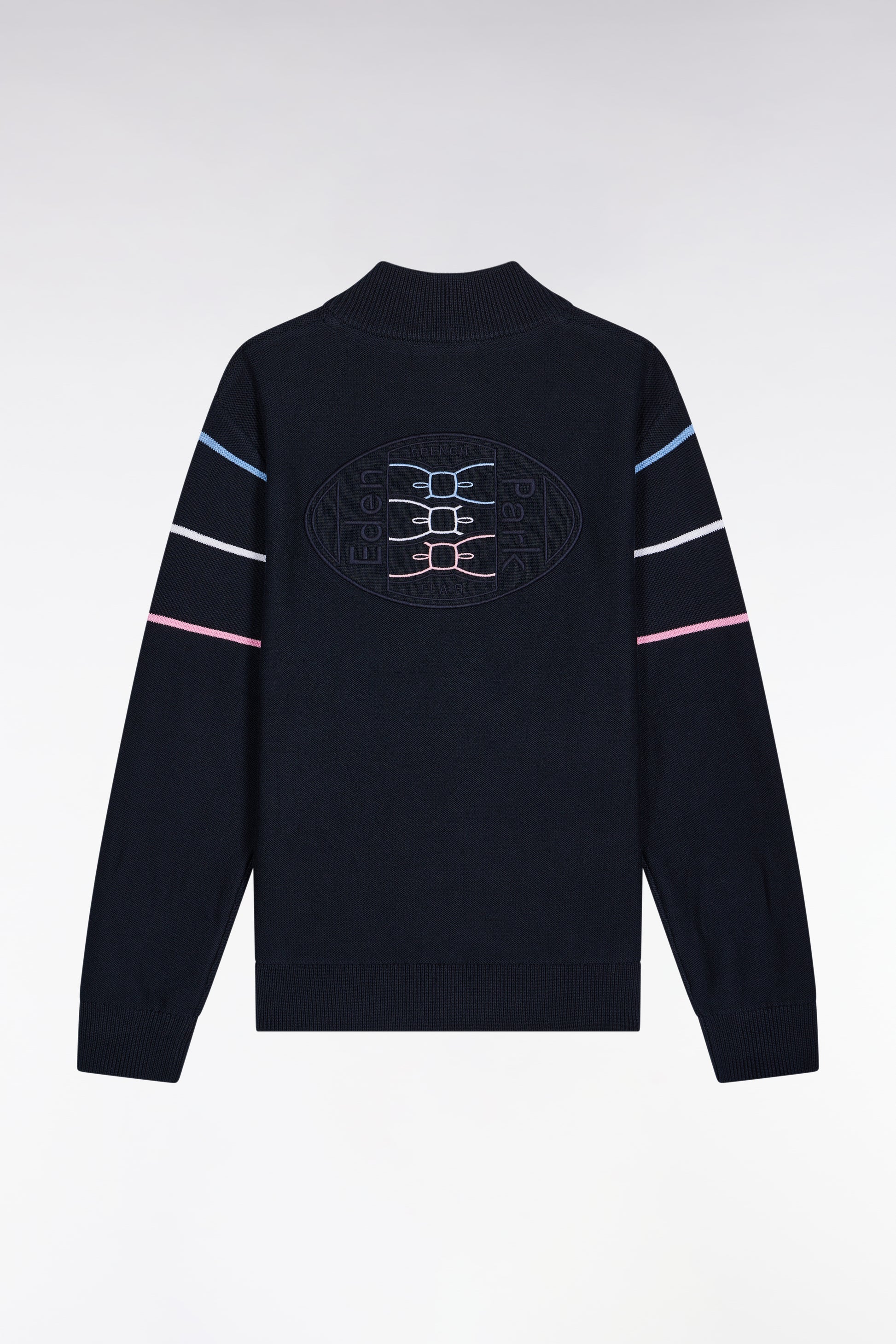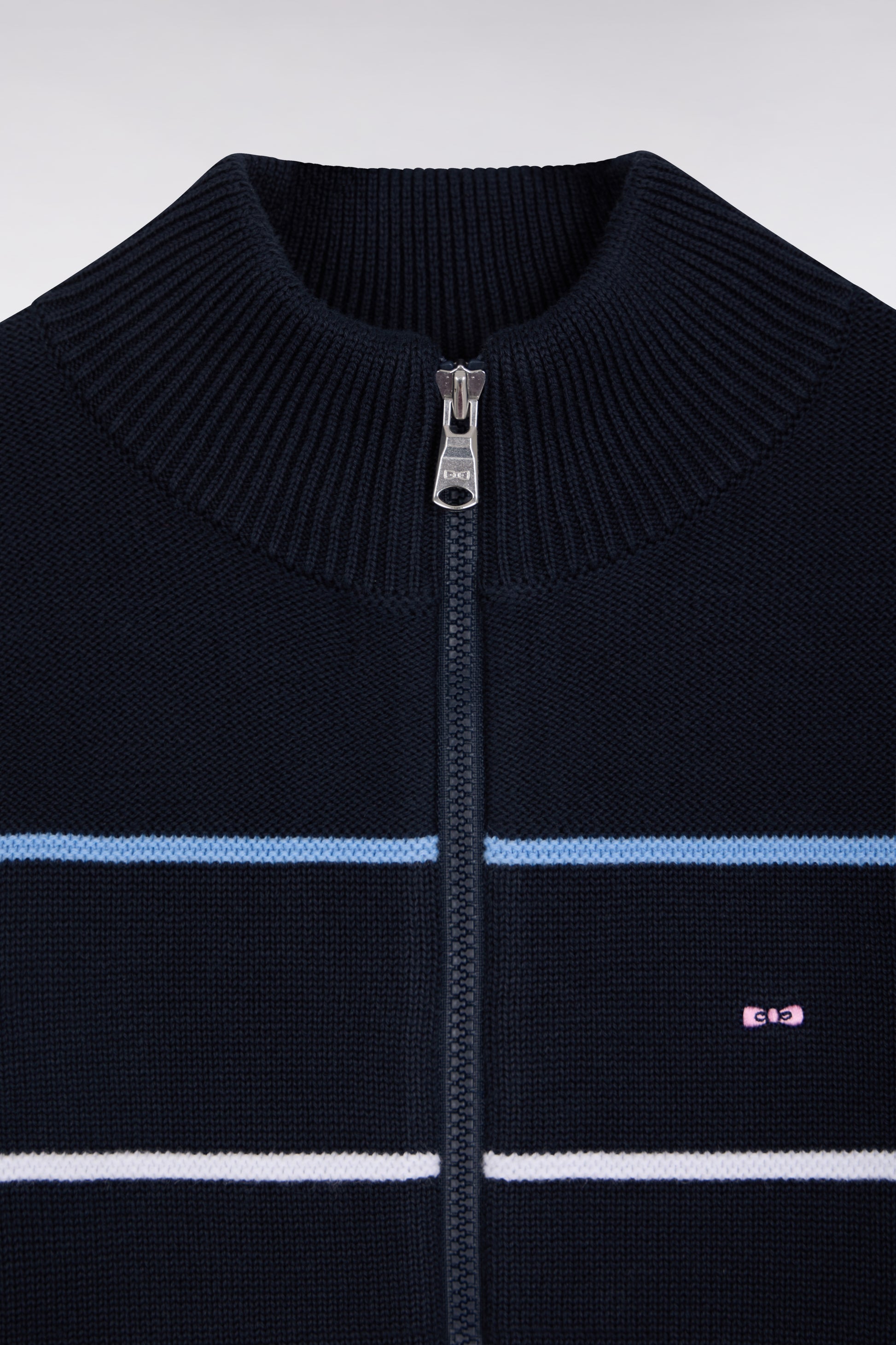 Our navy zipped cardigan plays on contrasts with its refined stitch play and tricolored finishing. Featuring a stand-up collar, it is distinguished by its bow-tie chest embroidery and wide back embroidery, bringing together three emblematic Eden Park bows in our signature colors. Designed to accompany children in style, worn as a sweatshirt or mid-season jacket.