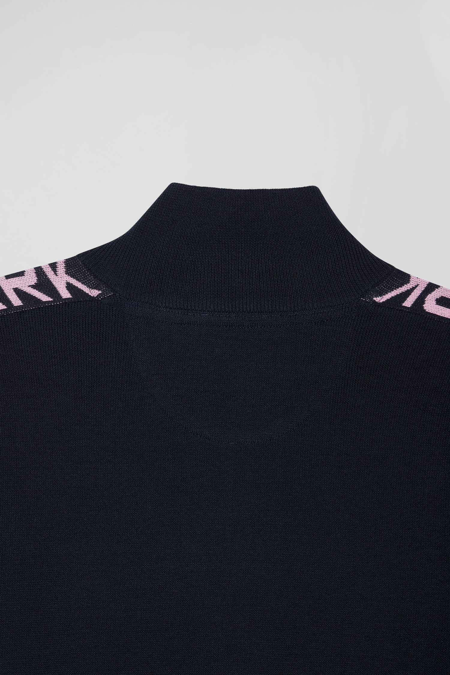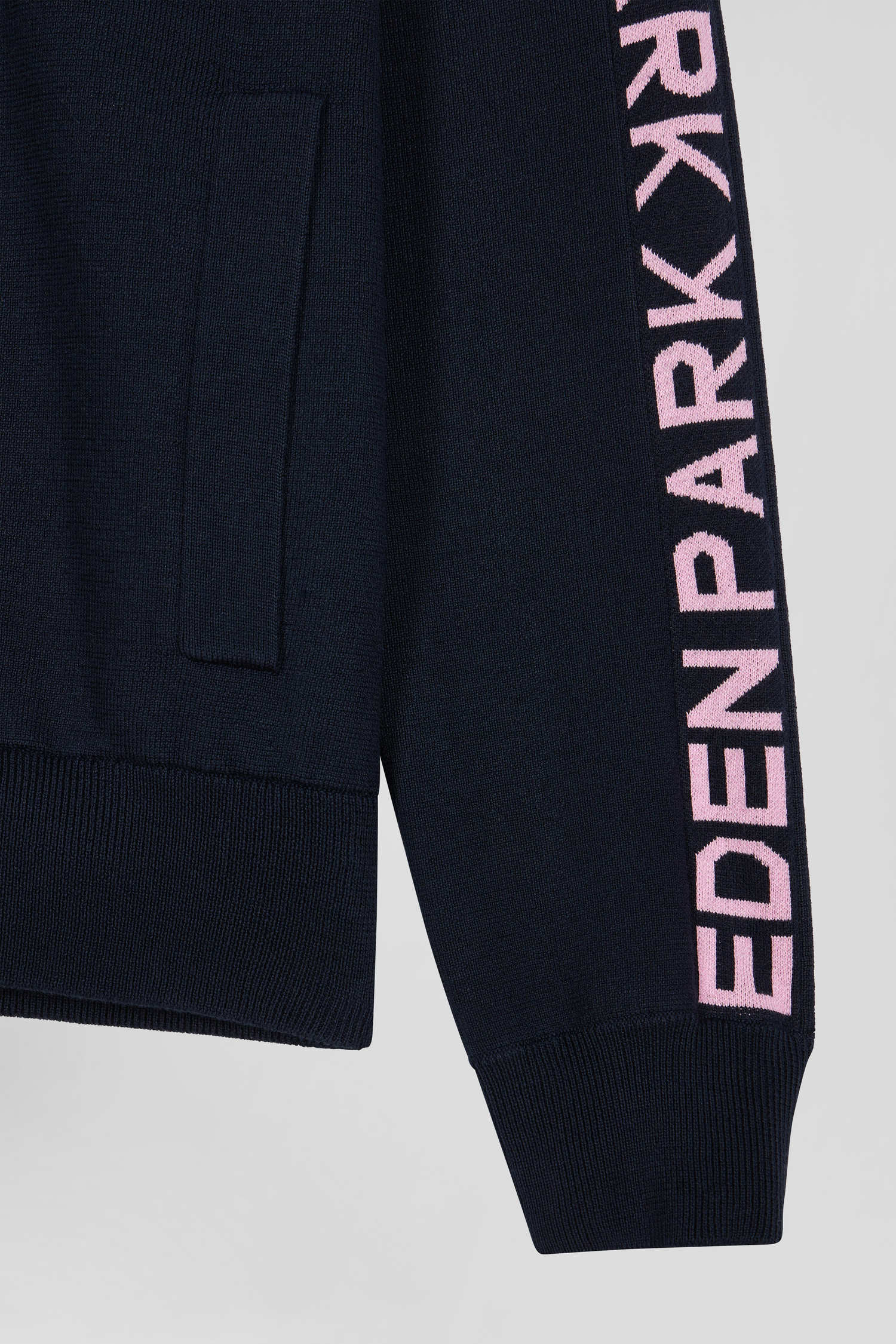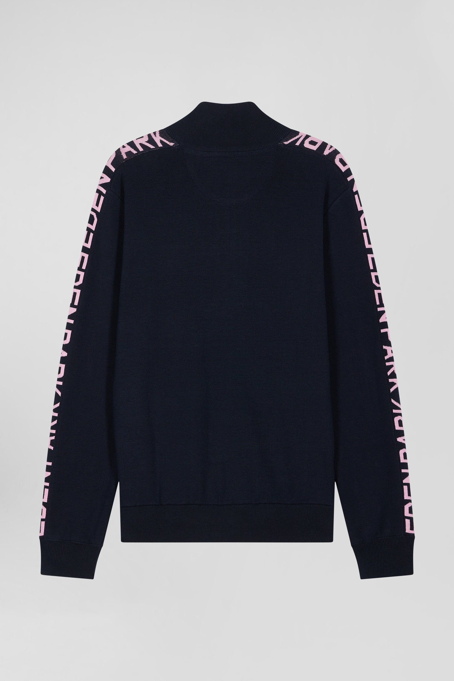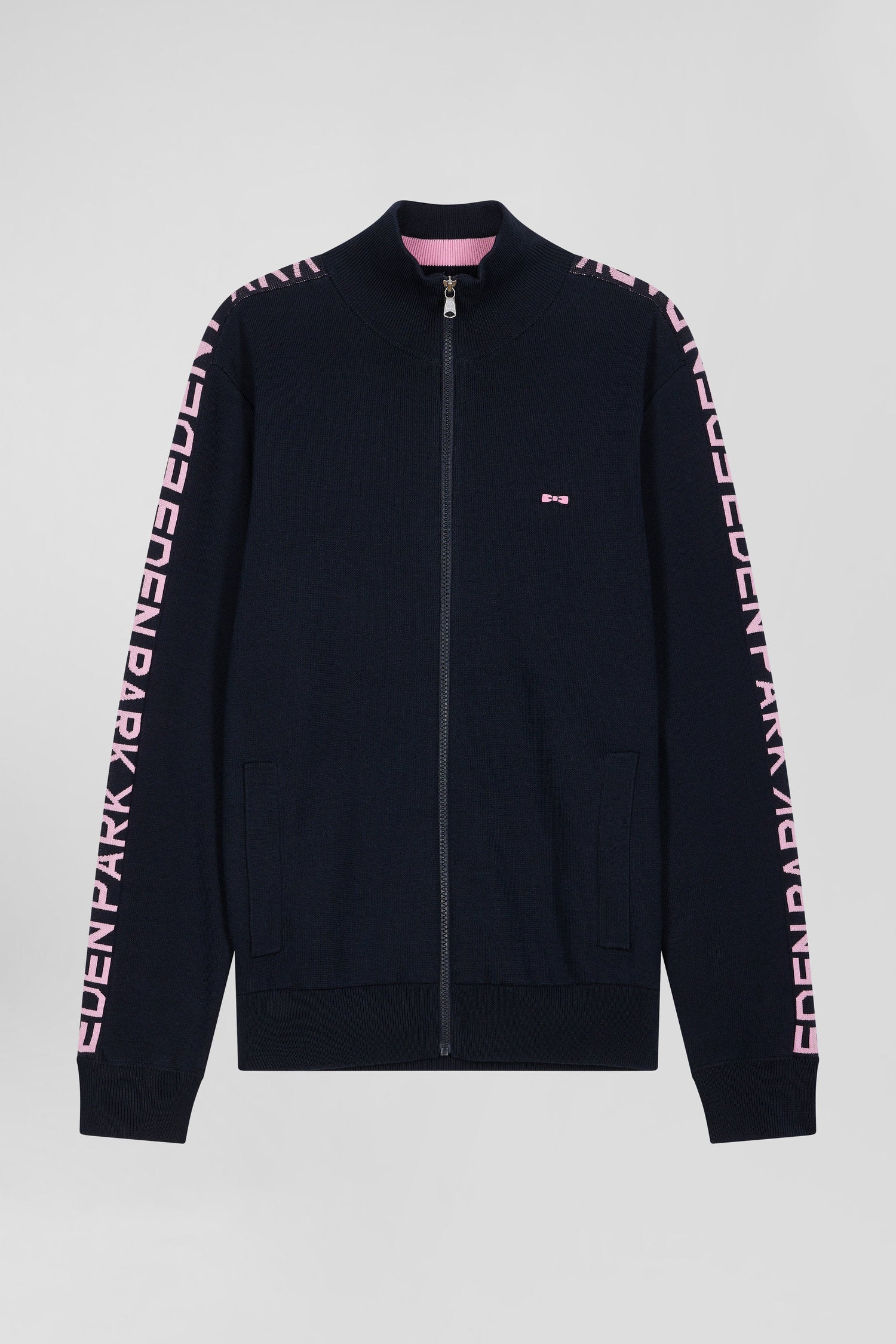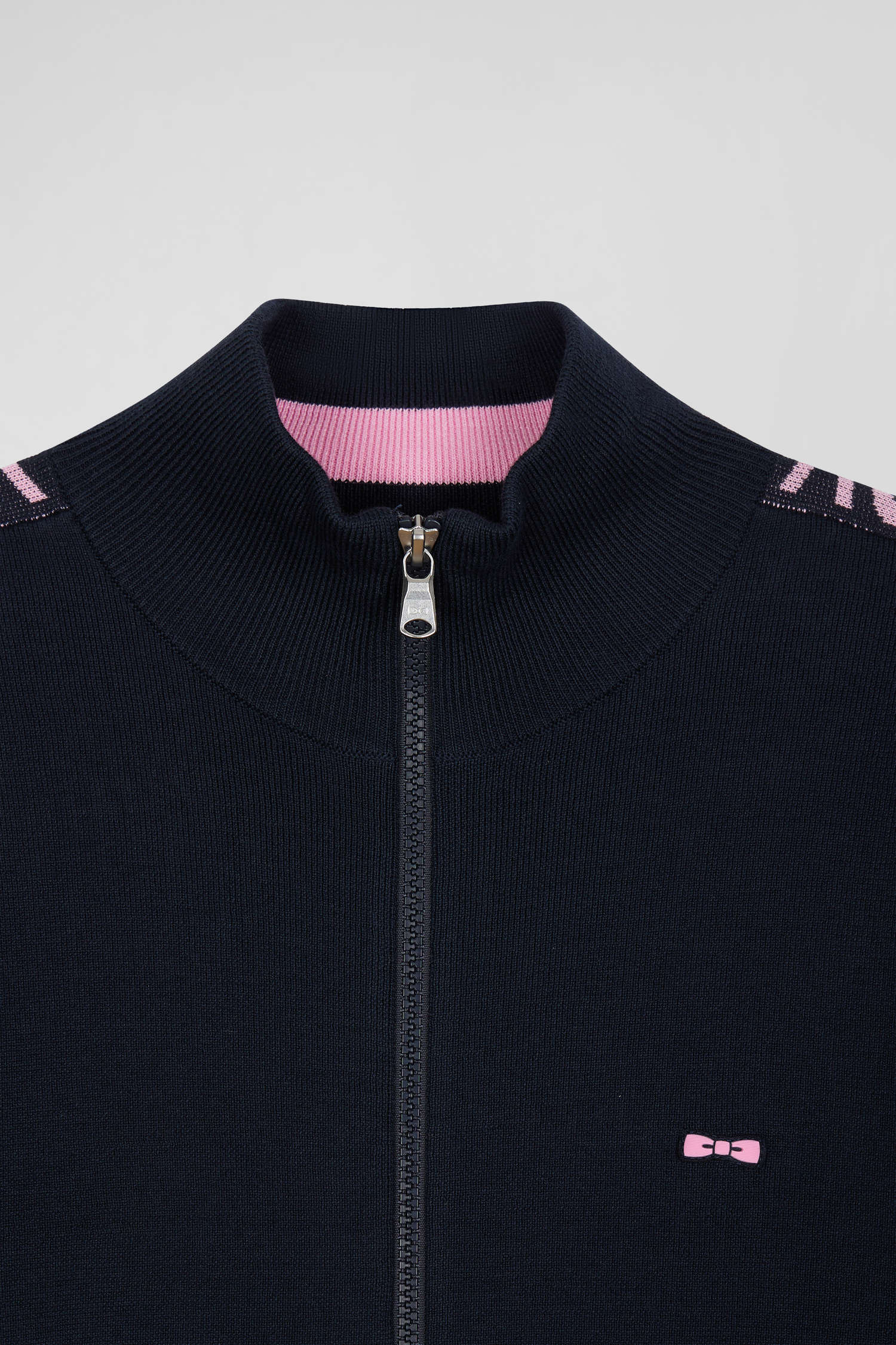 This milano knit zip-up cardigan with stand-up collar is designed for optimum comfort and a modern blouson look. Featuring two flat ribbed side pockets, this milano cotton zip-up sweatshirt offers both practicality and elegance. The contrasting interior stripe and Eden Park Jacquard stripe along the sleeves add a distinctive signature to this on-trend piece. Perfect for fall layering, it's the ideal ally for a casual yet refined outfit worn as a cardigan or mid-season jacket.