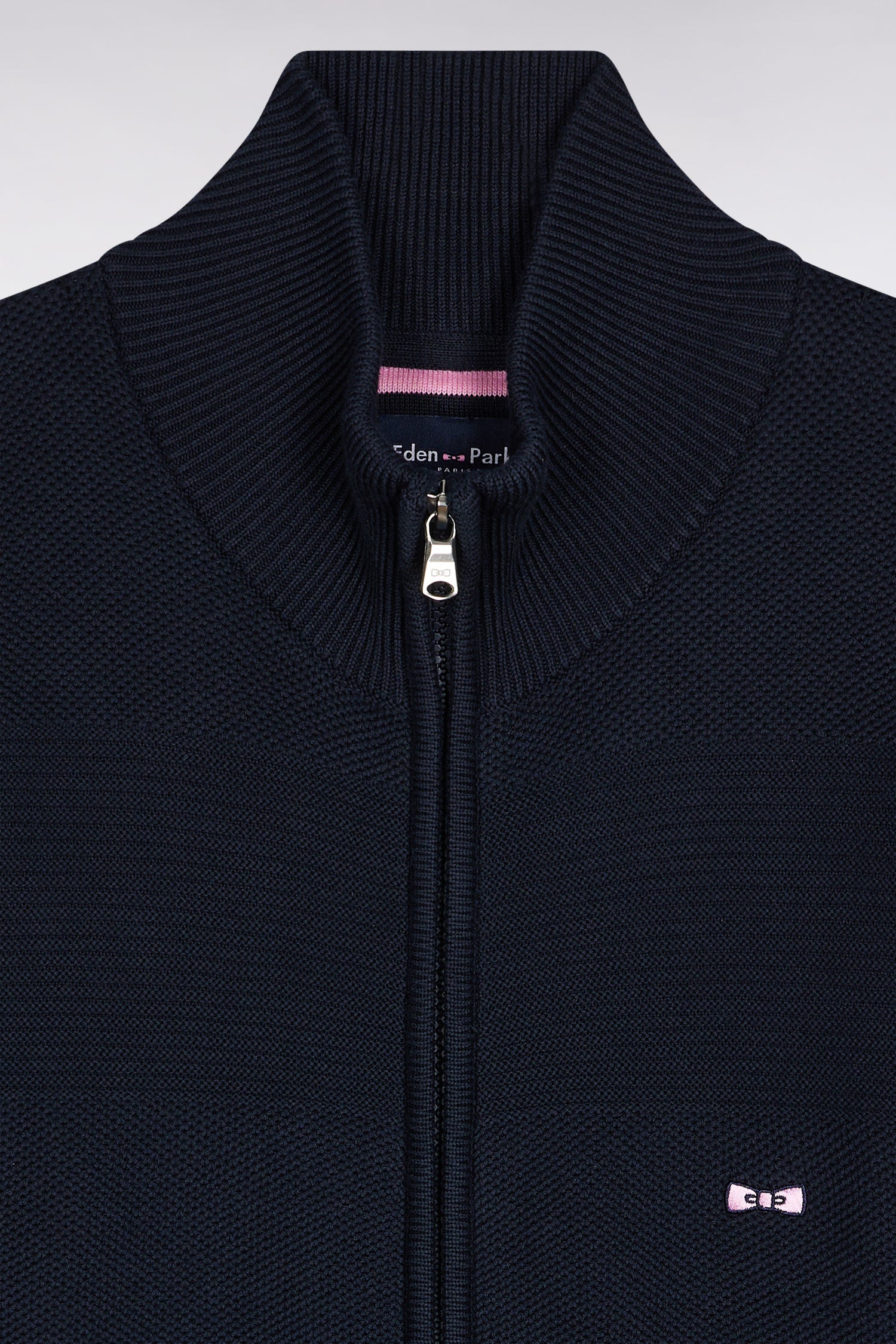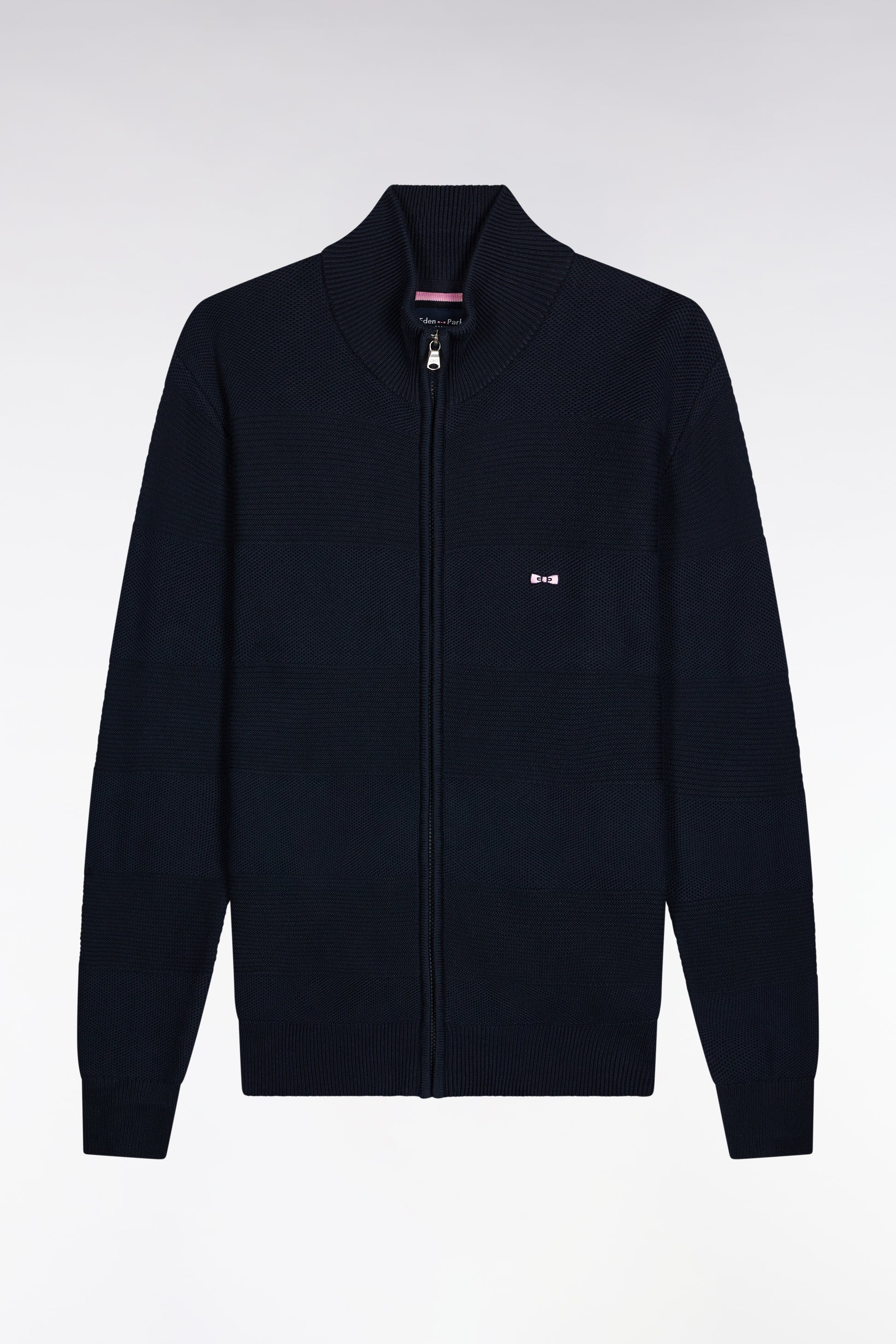 This zipped cardigan in knitted cotton seduces with its play of stitches that create a trompe-l'œil effect of rugby stripes. The high collar and chest embroidery underline Eden Park's attention to detail. This trucker-collar cardigan is available in our signature colors