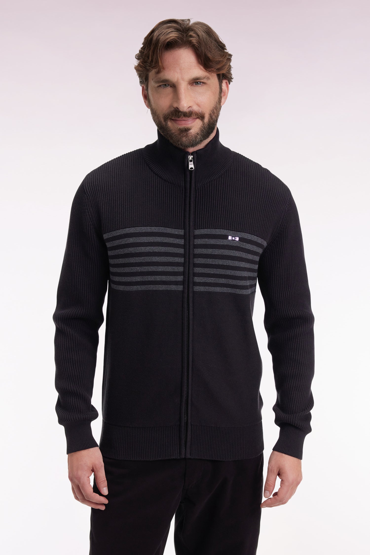 Zipped cardigan in black cotton with grey stripes, straight cut
