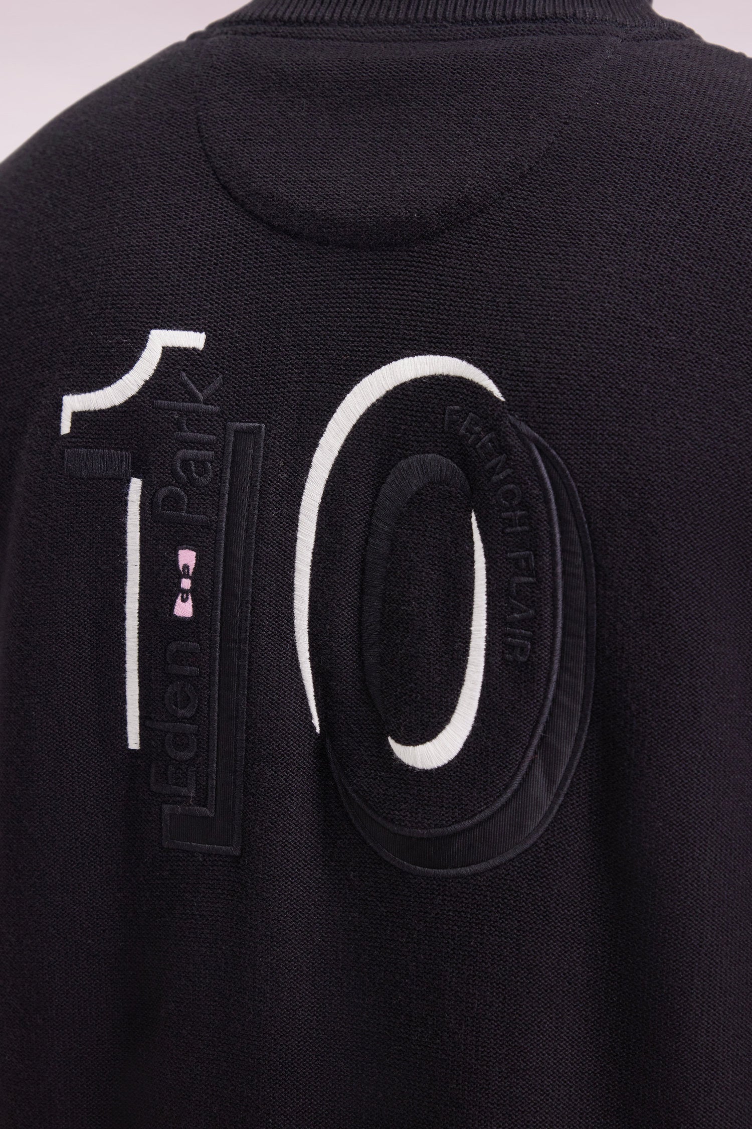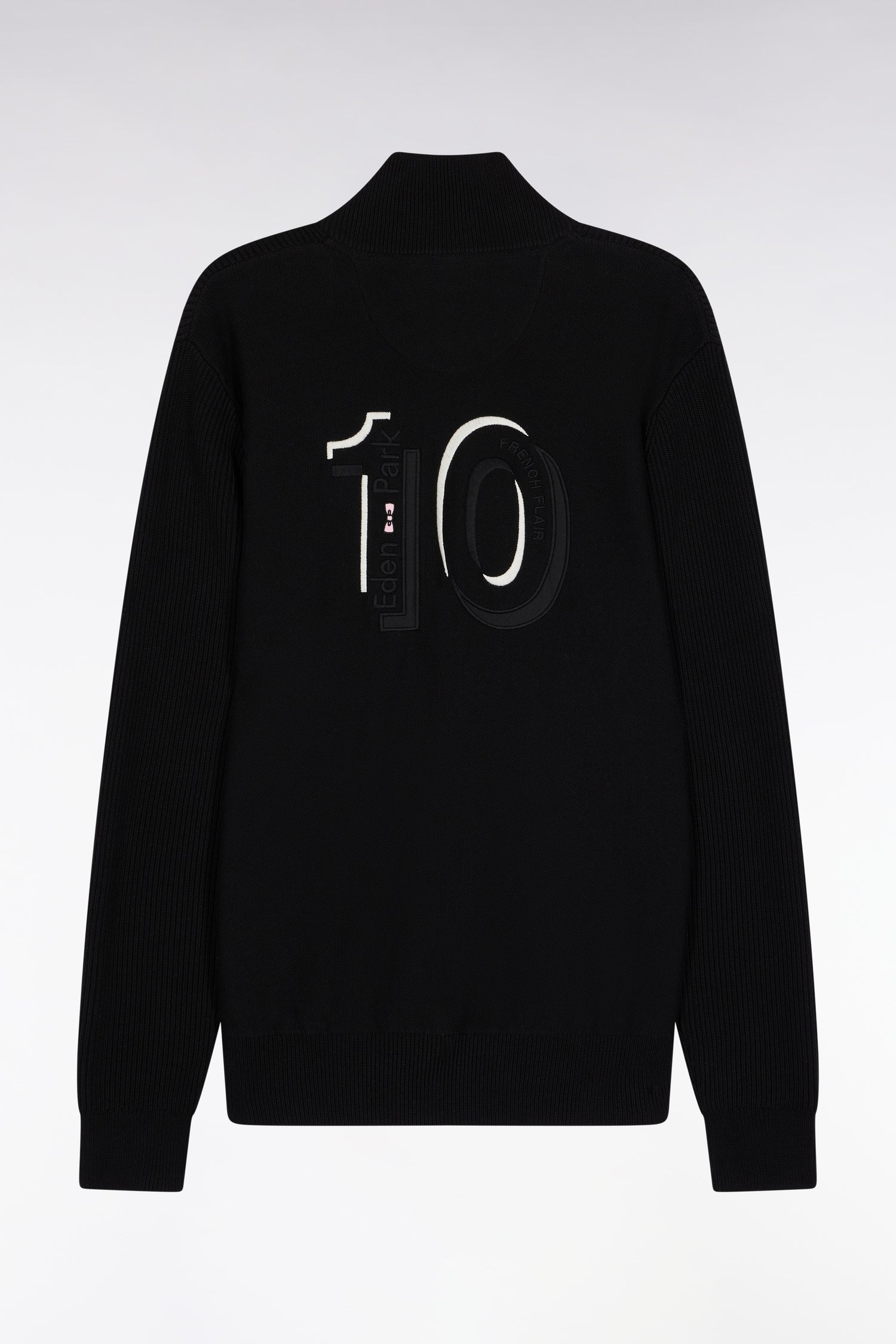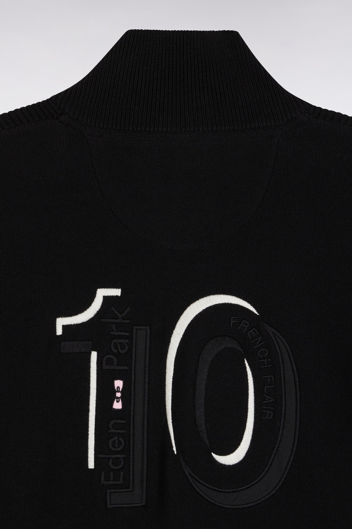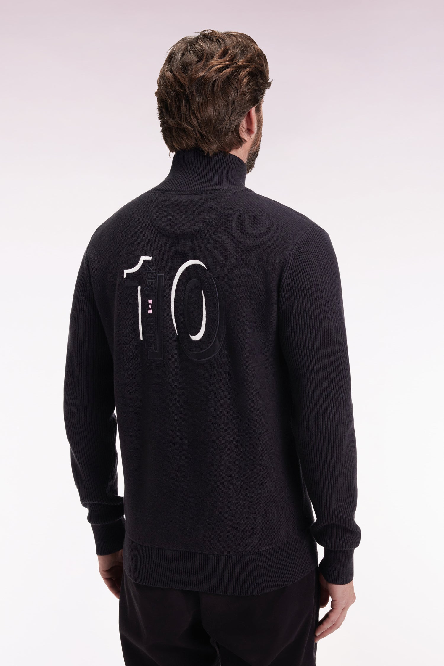This zipped cardigan with stand-up collar and contrasting interior, revealed when worn open, imposes its graphic style with a play of contrasting horizontal stripes on the chest. Knitted in cotton, it combines ribbed knit on the sleeves and jersey on the body for a structured, comfortable look. On the back, this high collar zip sweater features a large embroidery, a subtle tribute to the rugby jersey of our founder, Franck Mesnel. A singular, recognizable look: the hallmark of French sport-chic elegance.