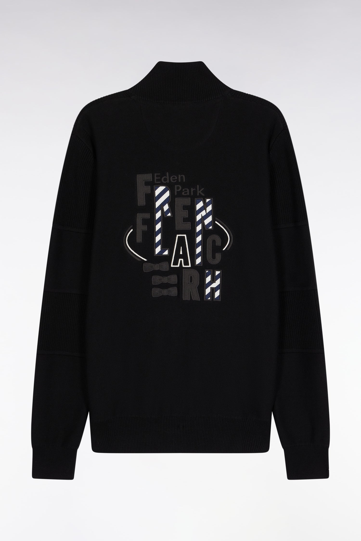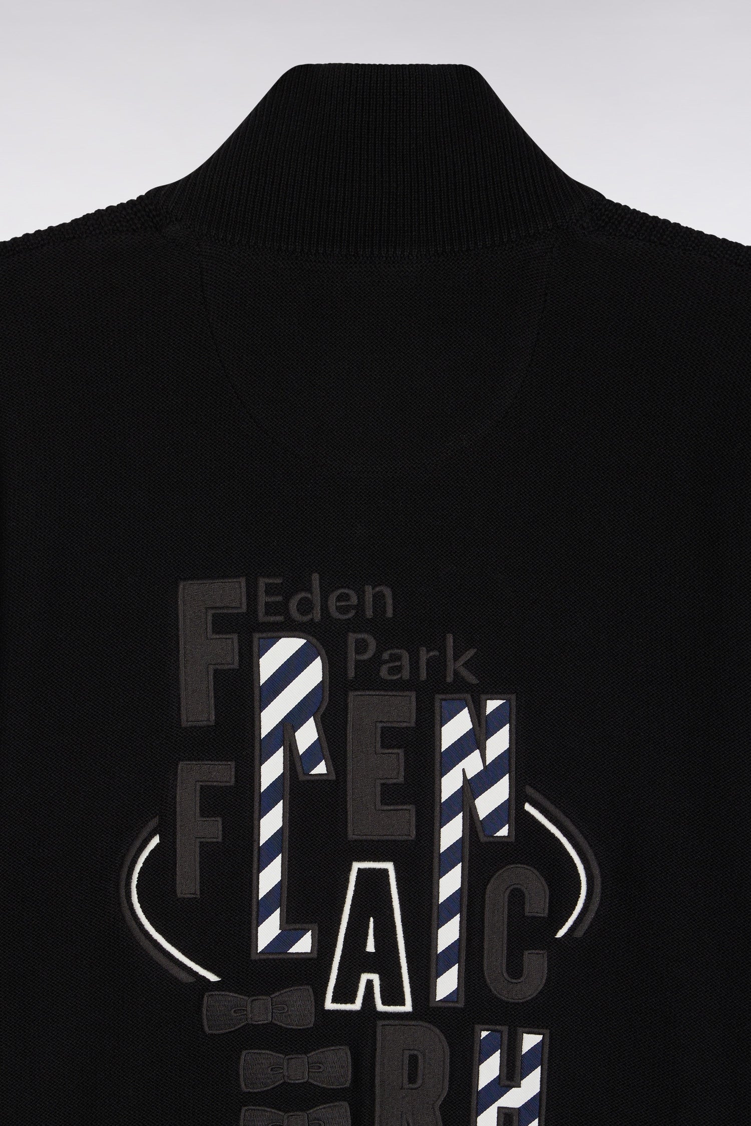 This straight-zip cardigan in pure cotton, knitted in a blend of jersey and English rib, embodies the sport-chic spirit so typical of Eden Park. On the back, its large French Flair embroidery is enhanced by a striped tie fabric: a typical detail of our fashion house's wardrobe.