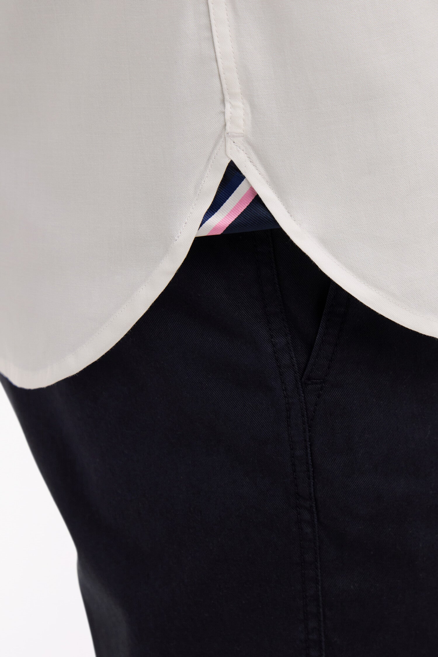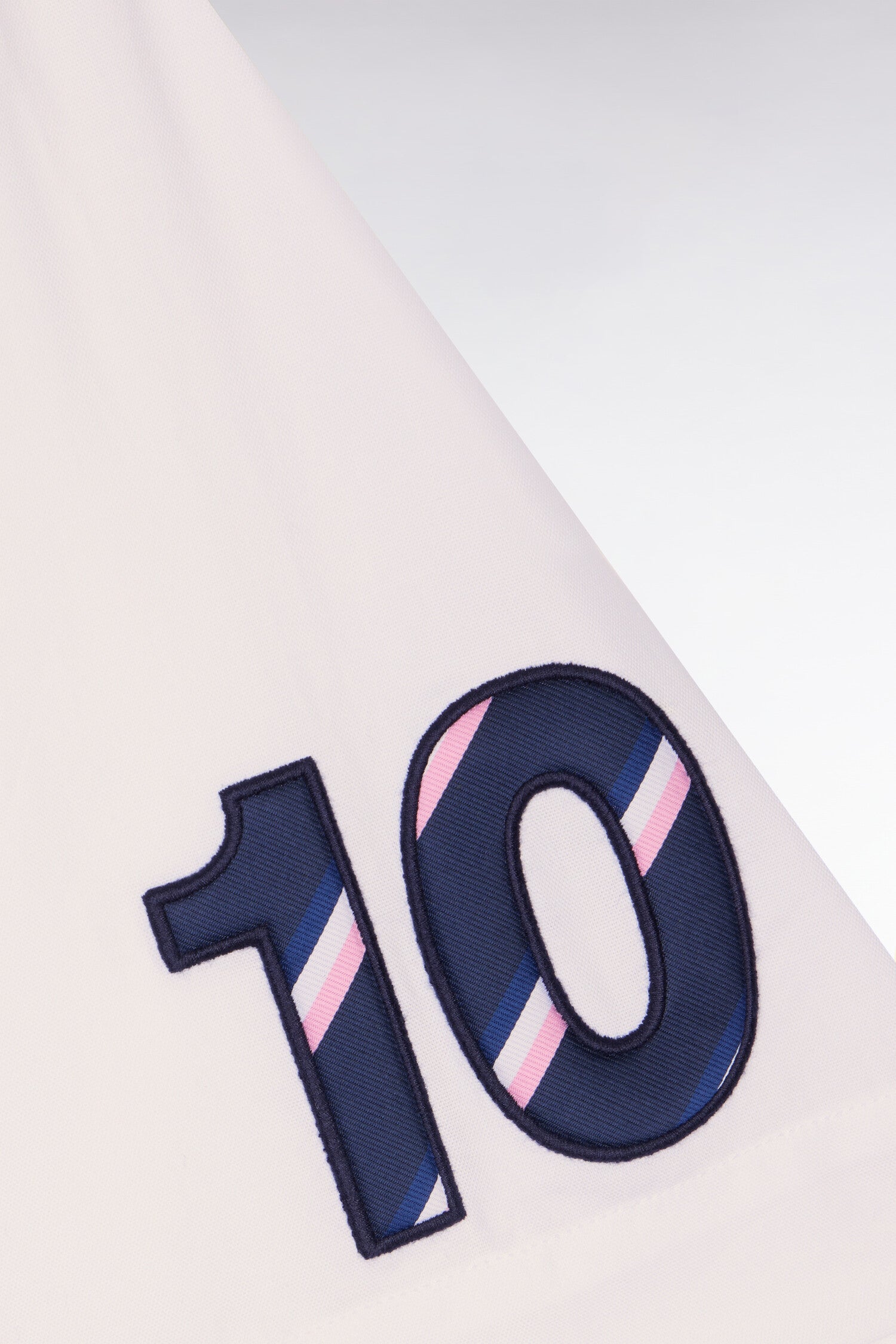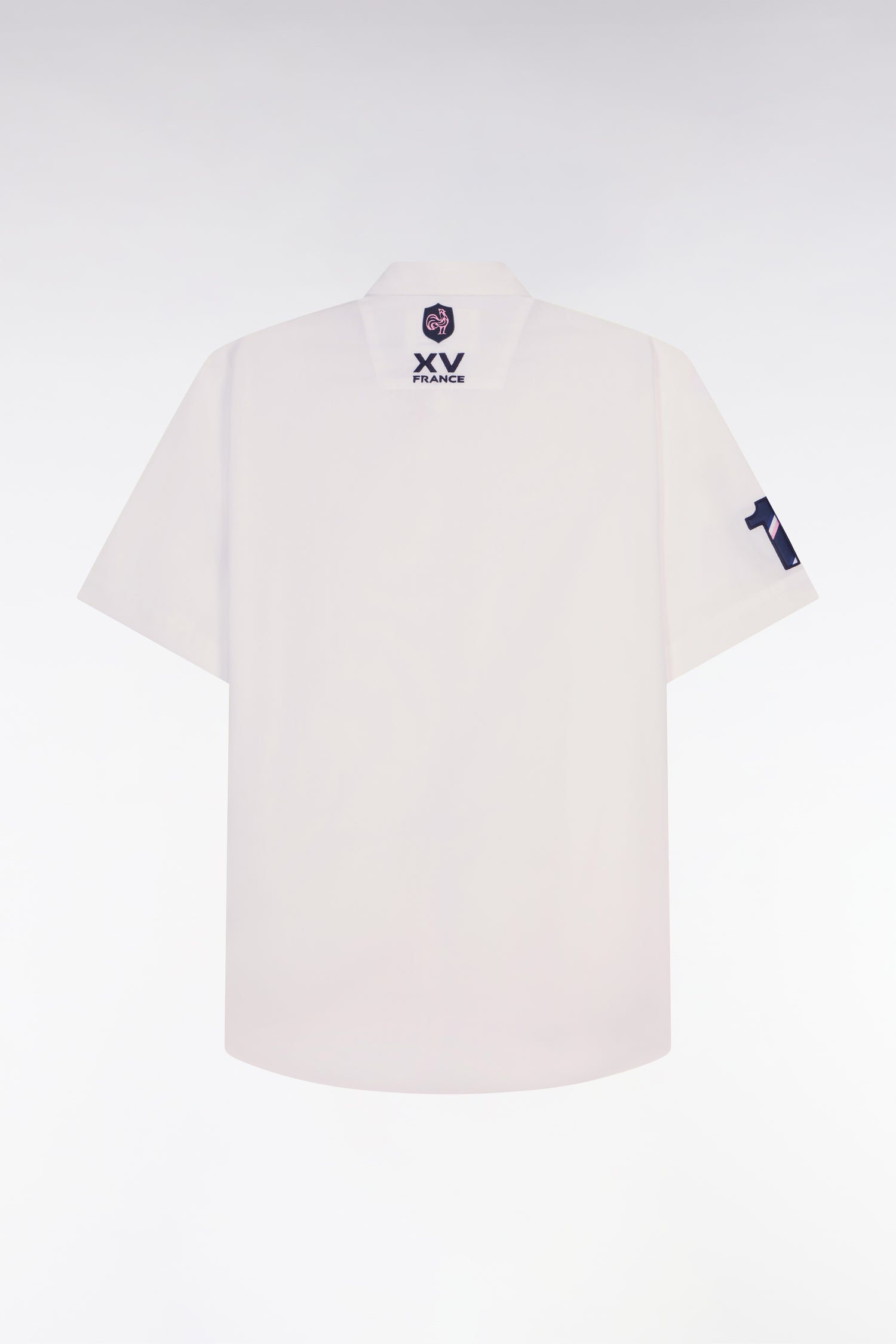 Cette chemisette en coton à armure pinpoint, déclinée en blanc ou en marine, célèbre notre collaboration avec le XV de France à travers des détails identitaires soigneusement travaillés. Sa coupe droite à bas arrondi et son col à pointes boutonnées assurent une allure nette et contemporaine. Notre emblème nœud papillon brodé tricolore affirme l’esprit rugby d'Eden Park, tandis que l’empiècement dos, les broderies et le badge signature XV de France renforcent ses accents rugby chic. Les ajouts de tissu cravate placées sur la manche et à l’intérieur du col soulignent le raffinement propre à la Maison : l'esprit French Flair de notre vestiaire. Autre détail identitaire, le ruban ottoman tricolore glissé dans la patte de boutonnage de cette pièce estivale forte, entre élégance à la française et passion affichée pour l'ovalie.