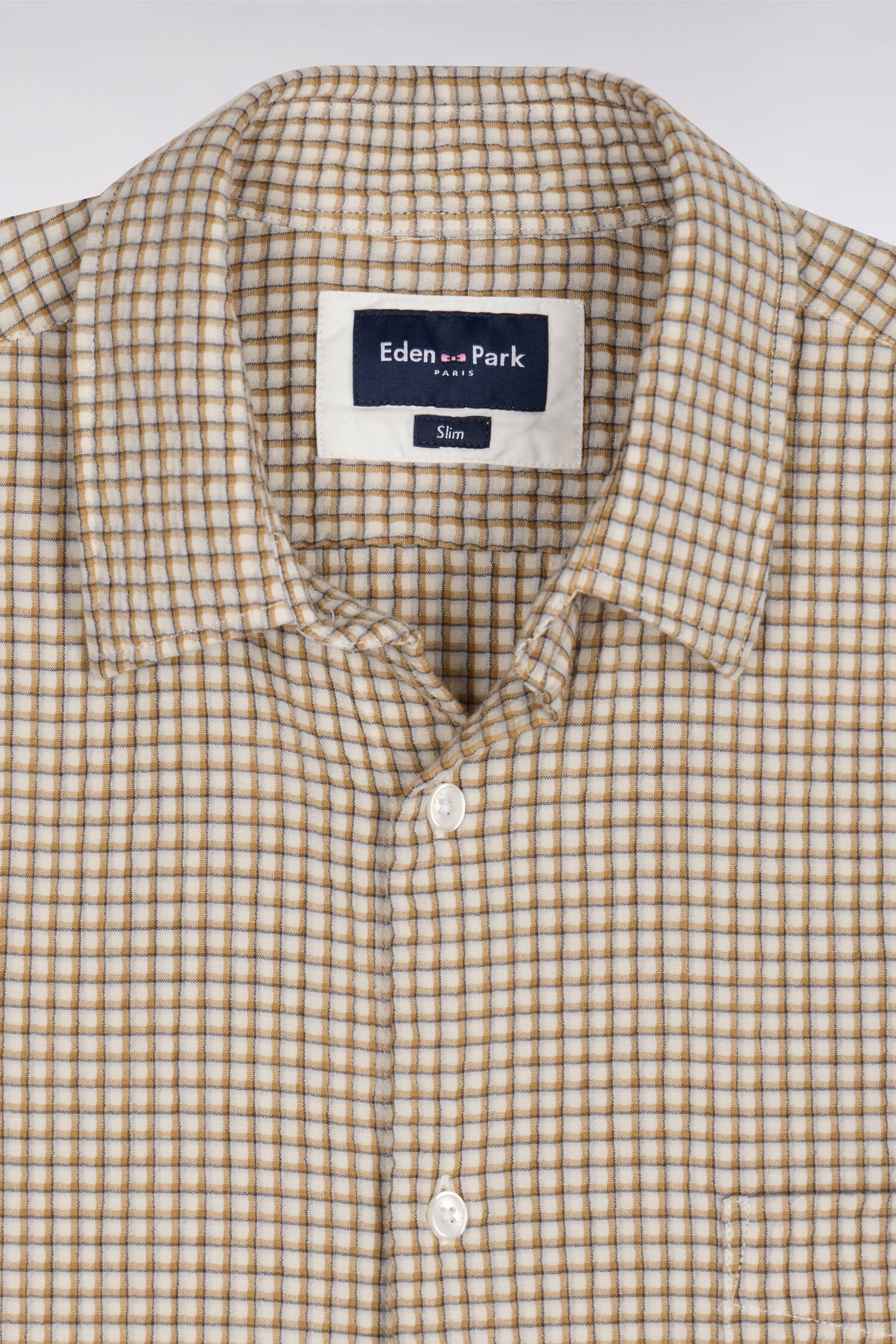 Chemise à manches courtes en coton seersucker à carreaux beige coupe slim