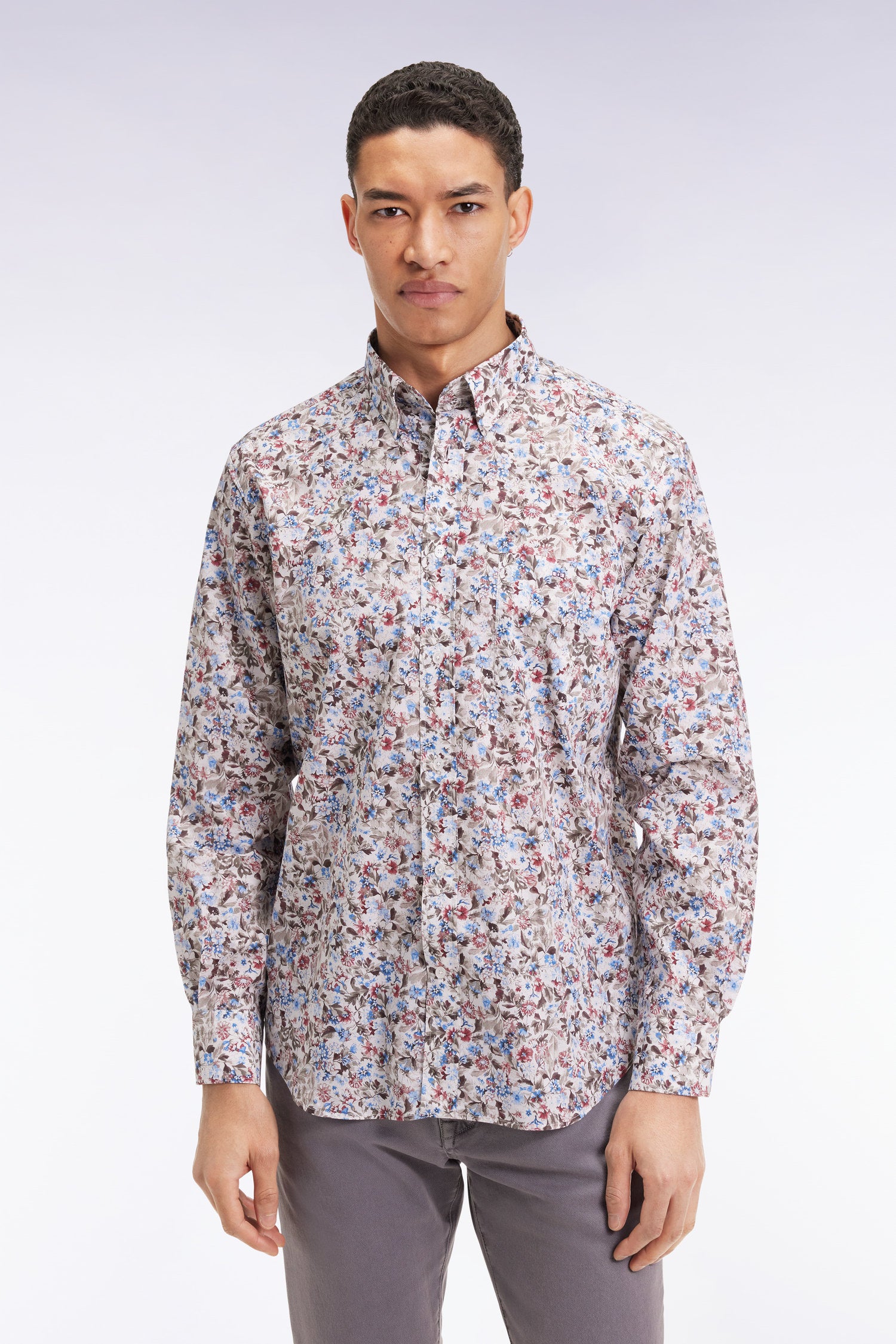 Playful and refined, this men's shirt plays on contrasts with a multicolored floral micro-pattern that conceals the iconic Eden Park bow tie from the discerning eye. Made from soft cotton poplin, it's lightweight and fashionable to wear in all circumstances.