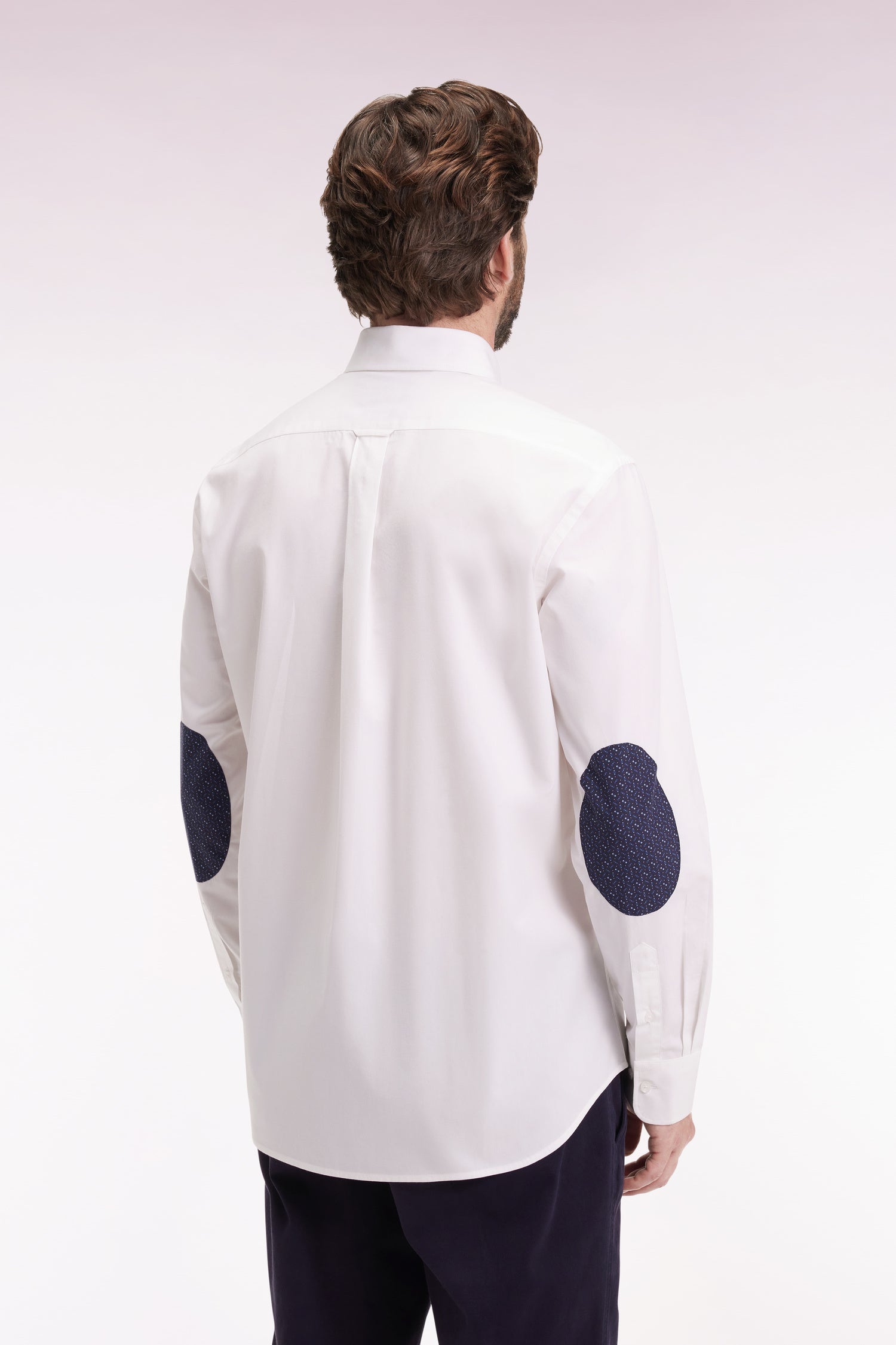 Behind its streamlined look, this elegant cotton poplin shirt hides a playful wink that Eden Park wardrobe insiders will recognize. The House emblem, the bow tie, is concealed in a micro-patterned print on the inside of the collar and worked into blue elbow patches. An elegant shirt with a straight cut, twisted with contrasting finishes that underline its French Flair spirit. This timeless, original model is available in sky, navy or white cotton, and always features a button-down collar for extra hold.