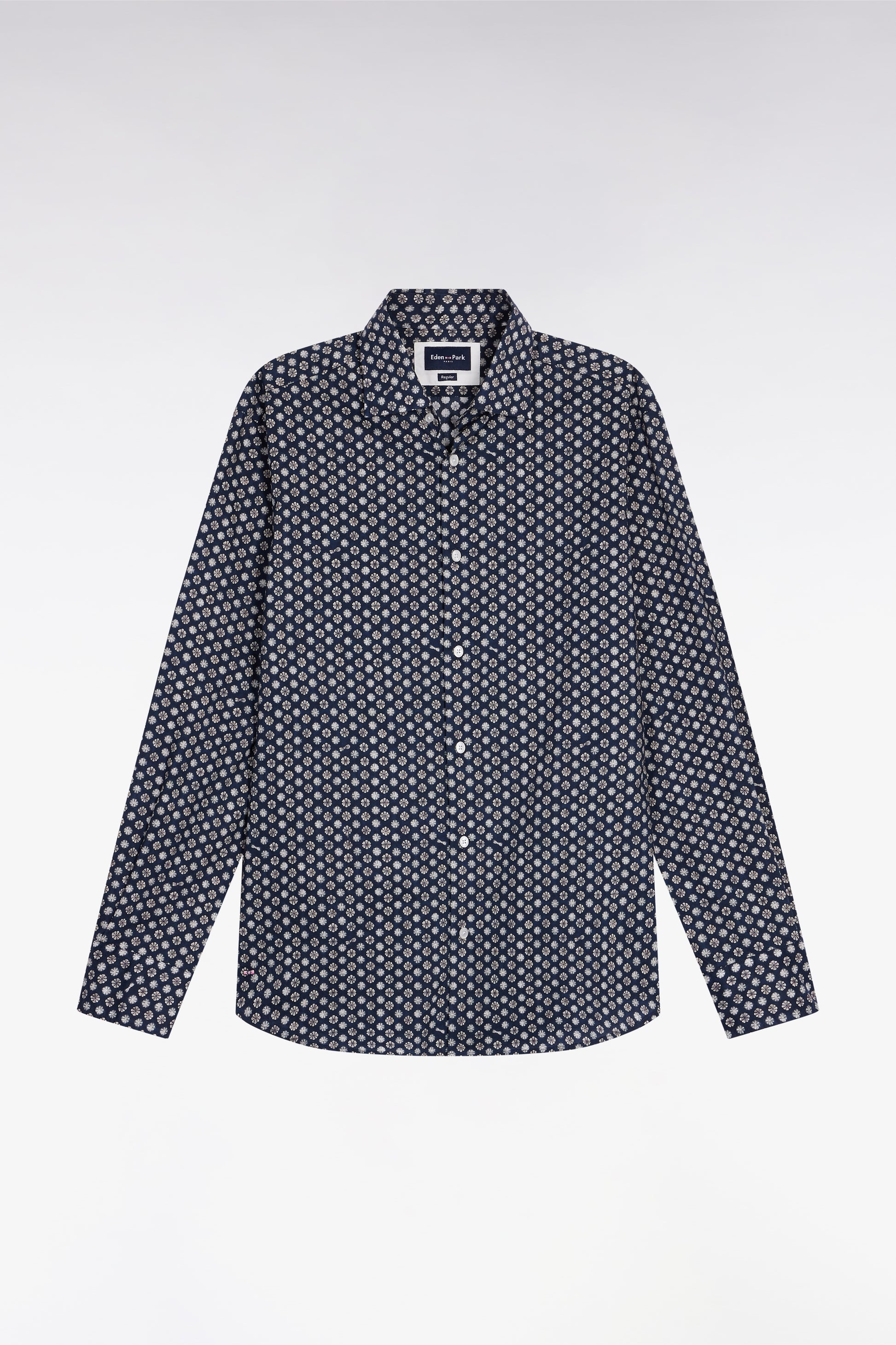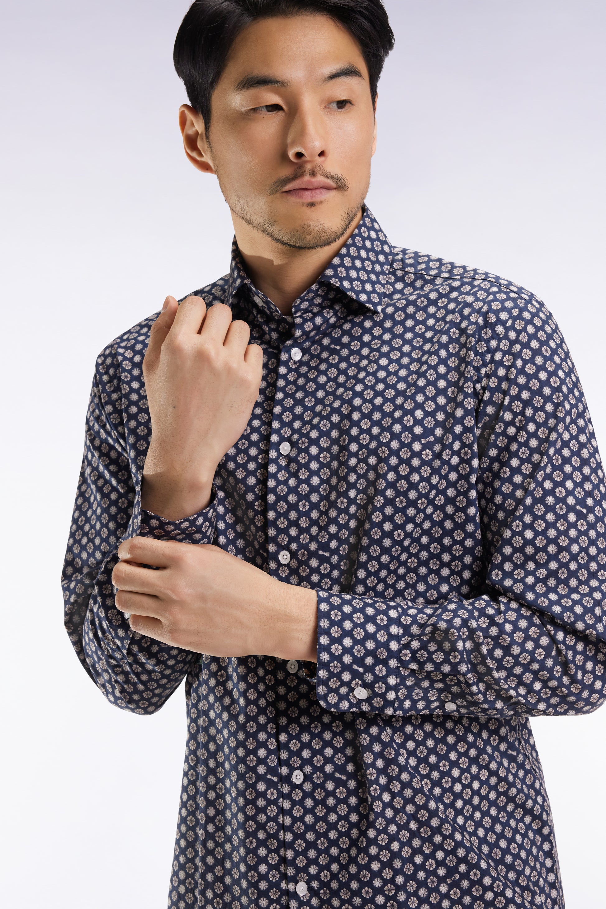 Modern and graphic, this shirt in a less figurative floral print, worked with originality on a navy background, is in the tradition of French chic. Its classic collar, signature oval buttons and impeccable straight cut create a well-groomed look that's perfect with raw denim or light-colored pants.