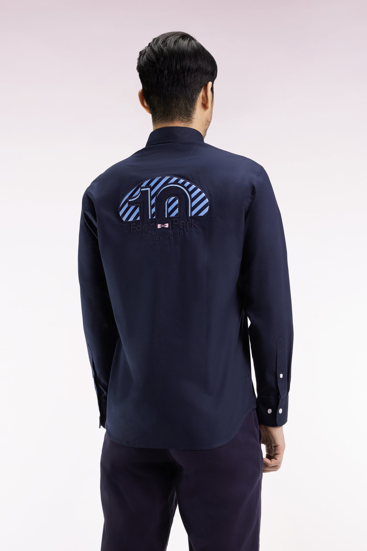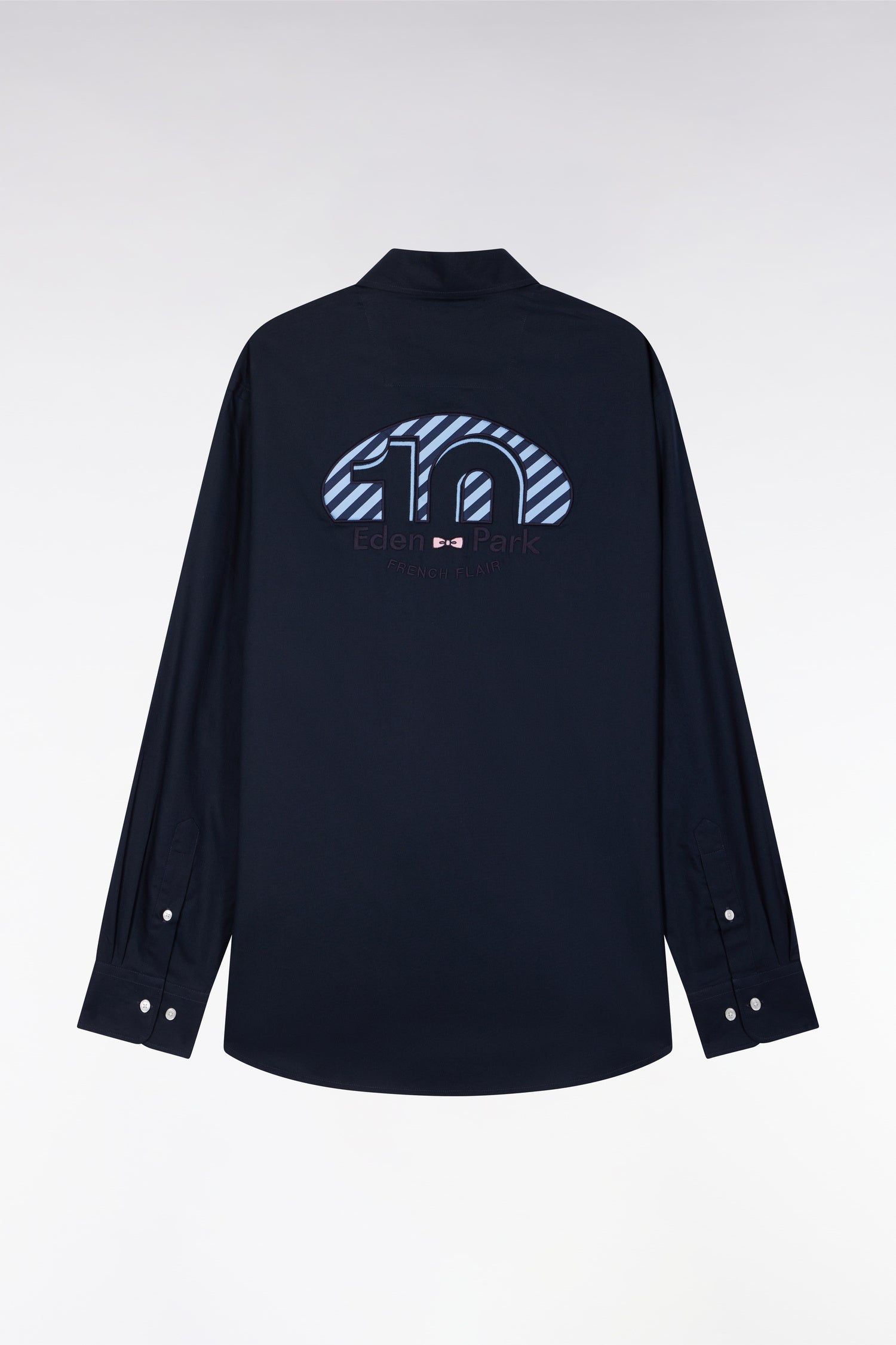 Made from structured pinpoint cotton, this men's shirt is a subtle tribute to rugby. The collar and cuffs are enlivened by tie fabric details, while a number 10 embroidered on the back confirms its place in a passionate wardrobe, recalling Franck Mesnel's historic jersey number. A strong piece, to be worn on its own or layered over a plain T-shirt. This straight-cut men's shirt is available in 3 colors: white, navy blue or black, to match your favorites as well as our fashion suggestions for the season.
