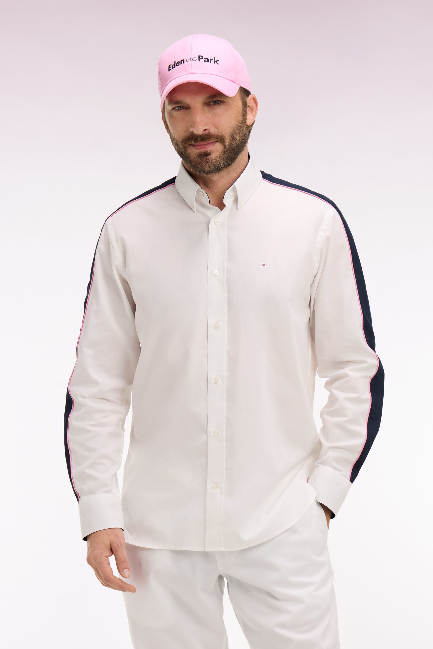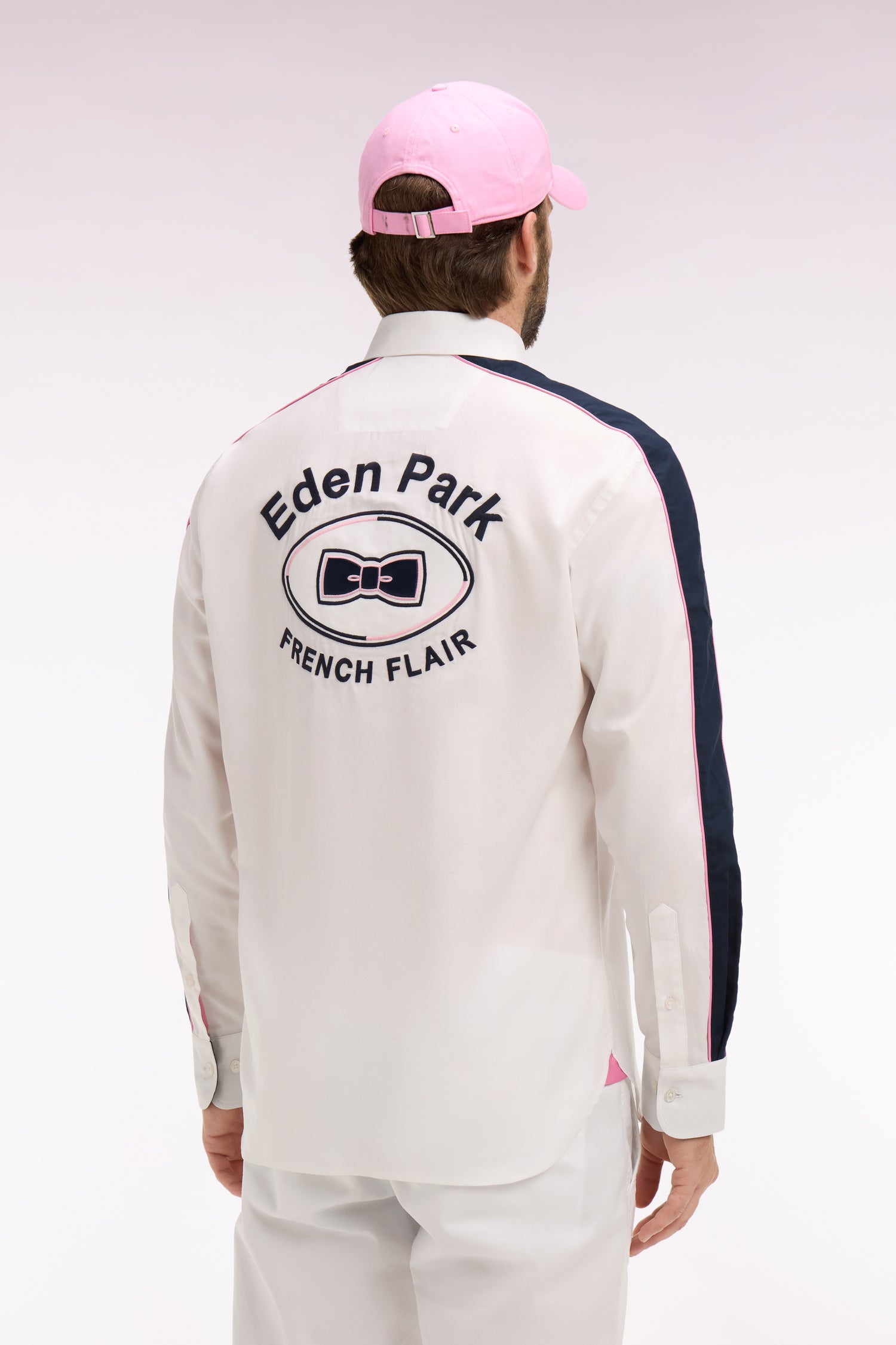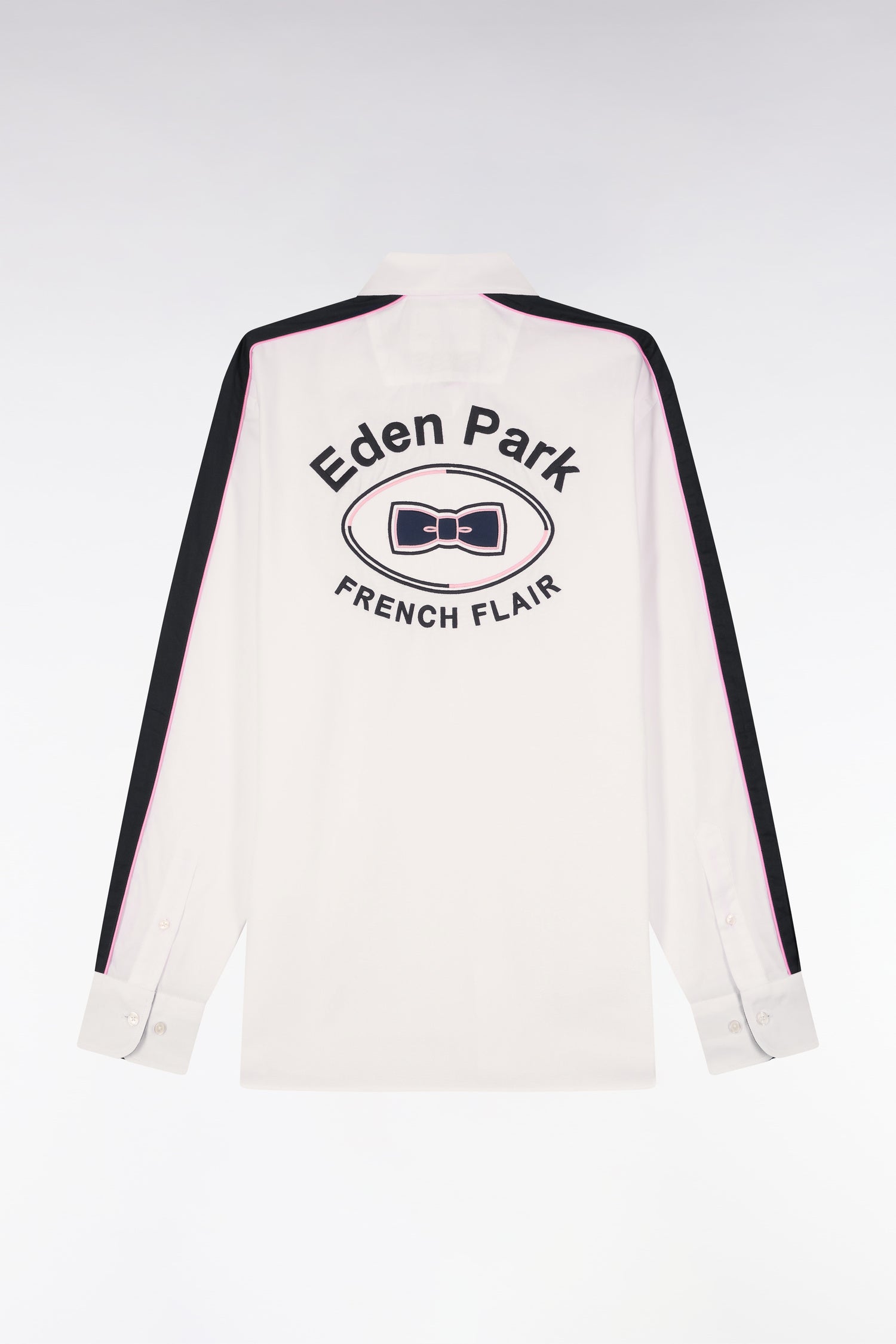 Cette chemise en coton blanc à armure pinpoint associe finesse du tissage et signature identitaire. Sa broderie dos et ses découpes manche expriment l’héritage rugby de notre Maison, toujours revisité dans une version contemporaine. Sa coupe droite assure un porté confortable, tandis que ses passepoils contrastés rose et marine aux manches et à l’intérieur du col apportent un raffinement discret. Une pièce affirmée, parfaite pour une allure sport chic qui ne passe pas inaperçue.