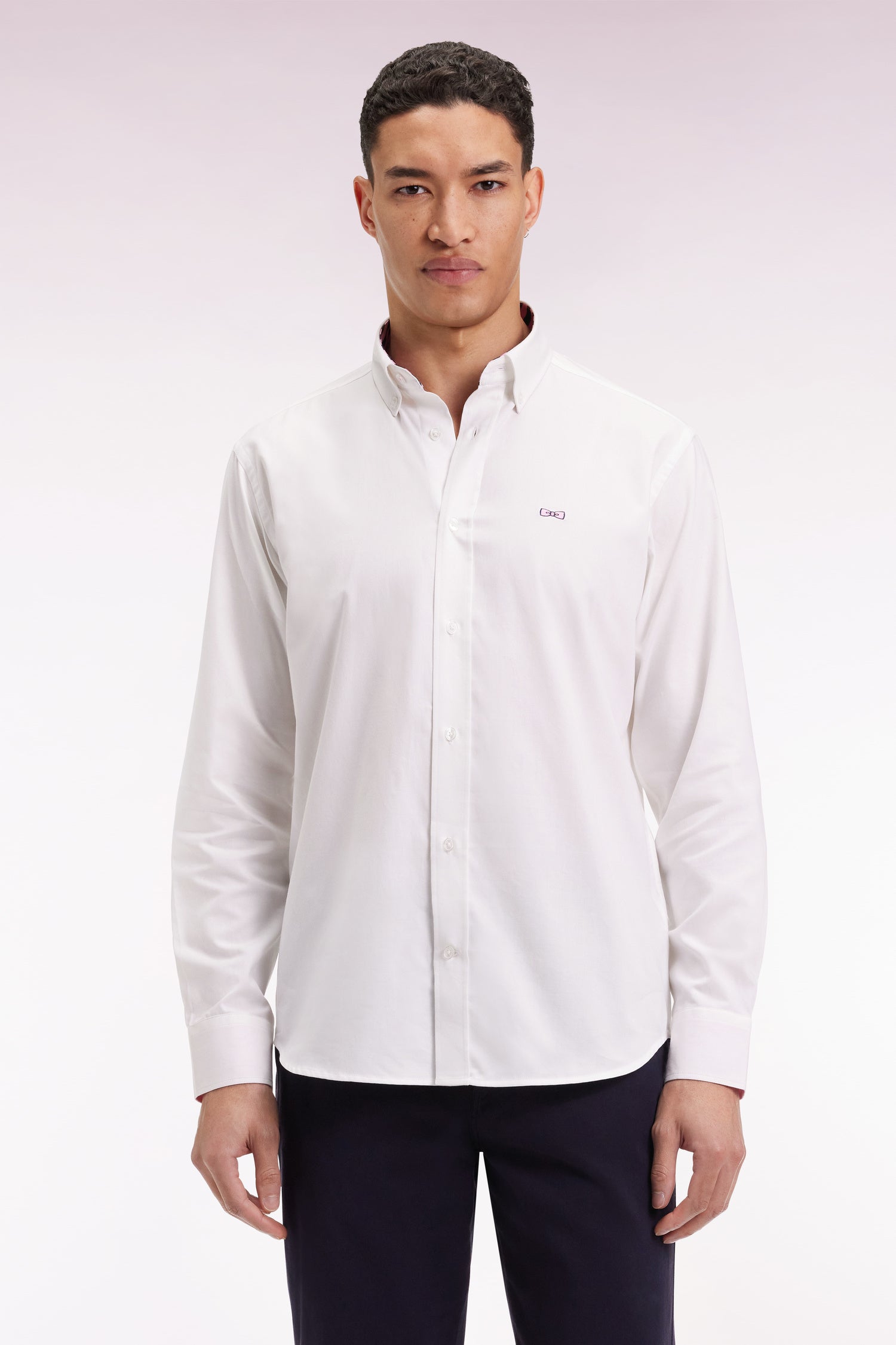 A discreet tribute to the world of rugby, this men's shirt plays the card of sporting elegance with its signature finishes. Crafted in pinpoint cotton for a structured fit, it is enlivened by subtle contrasting tie fabric details on the inside of the collar stand and cuffs. An exclusive embroidery on the back, a nod to the brand's rugby heritage, distinguishes this straight-cut shirt. Wear alone or open over a white T-shirt for a controlled sport-chic look in navy or white.