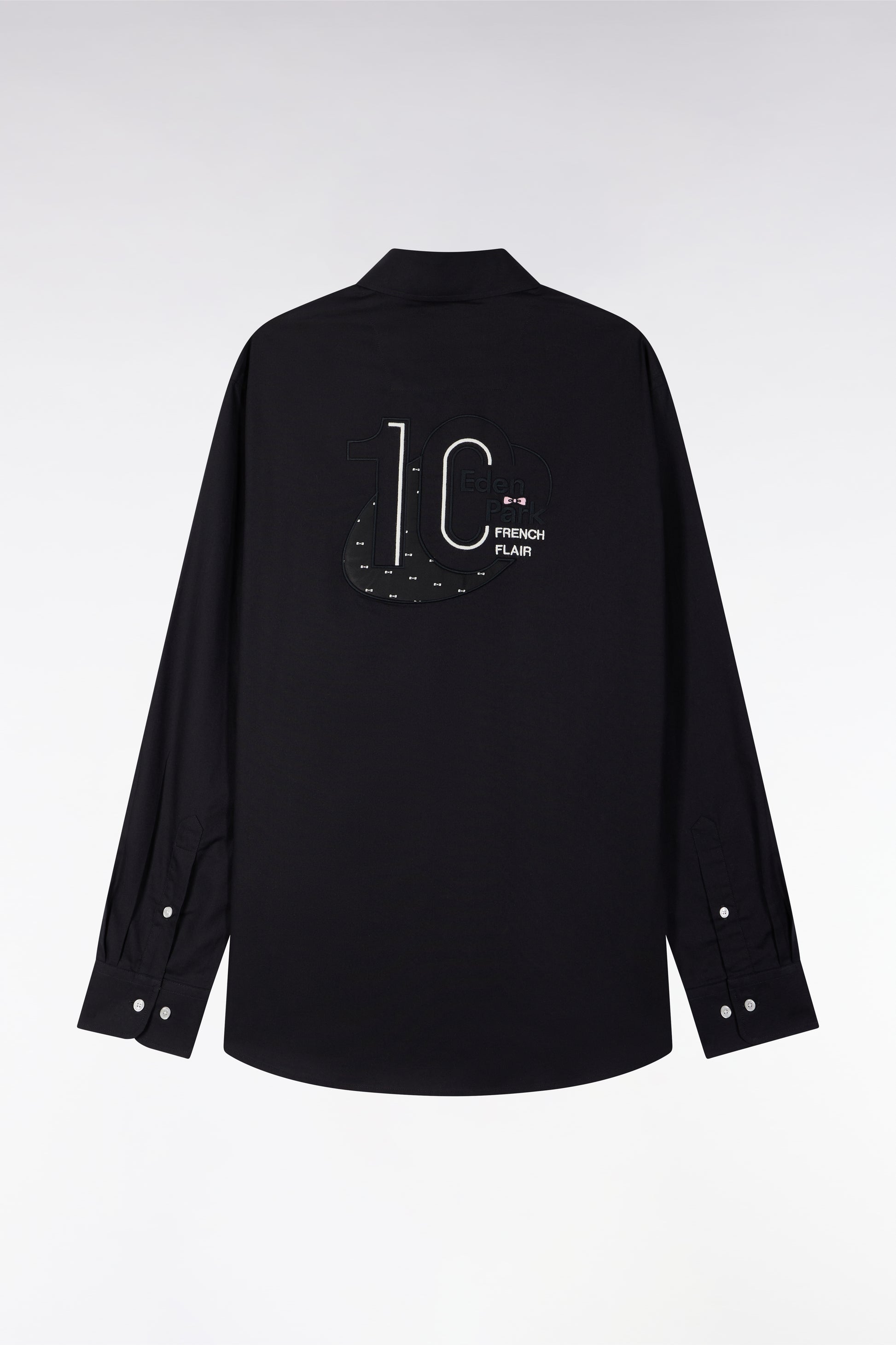 Made from pinpoint-woven cotton for a more structured look, this straight shirt proudly displays the passion for rugby that drives our company and its community. On the back, an embroidery pays tribute to jersey 10, the one worn by our founder on the national team. For an elegant French Flair twist, a printed tie fabric enlivens the collar stand and the button placket on the cuffs. A straight-cut model for easy layering, worn as an overshirt over a white cotton T-shirt.