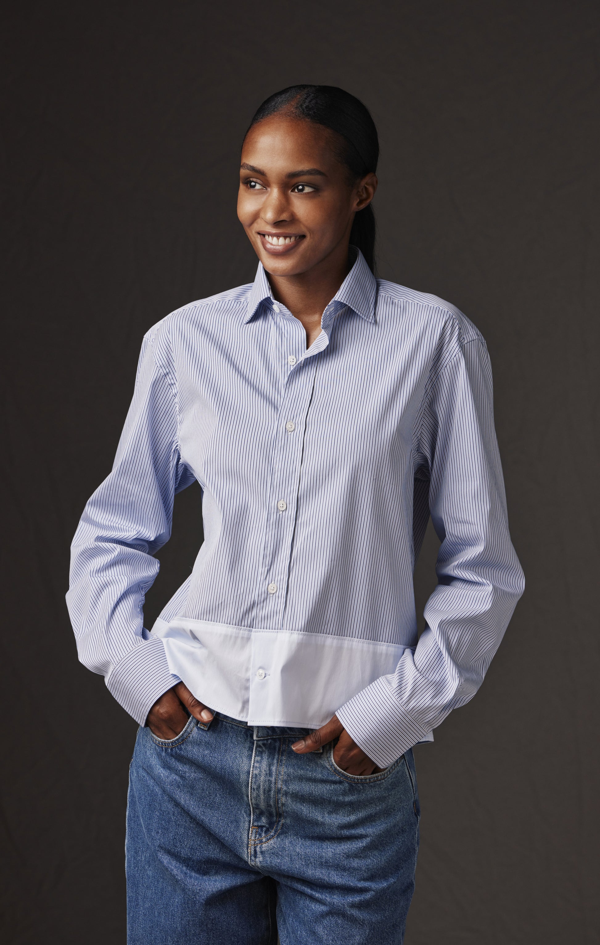 Ensure your personal style by wearing this unique piece, created by our atelier in a single piece in a medium size (length 62cm). For this elegant women's shirt, our Maison selected a striped shirt from our men's archives before carefully reworking it. Cut to size, it is then completed by the addition of a strip of fabric taken from another shirt from our dormant stocks. The combination of blue and white stripes and the patchwork pattern lends this women's shirt a graphic allure ideal for structuring the feminine silhouette. Jeans or tailored pants with a fitted waistband will go perfectly with this upcycled shirt. The Pap'Atelier capsule is available exclusively on our website for a limited time.