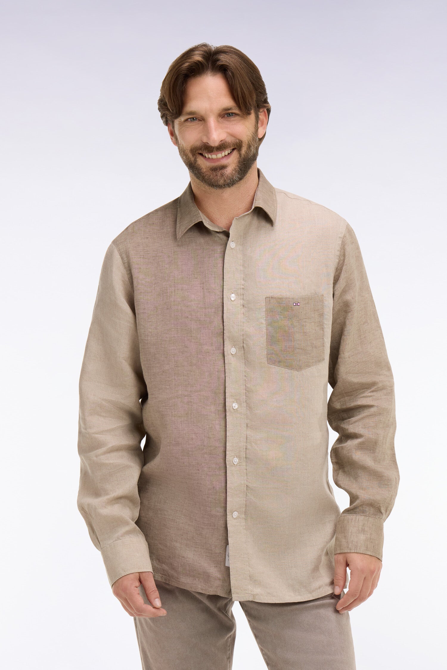 Pièce forte du vestiaire estival, cette chemise en lin bicolore revisite l’esprit casual chic de nos collections de mode avec naturel. Sa coupe regular offre une aisance confortable tandis que le lin, matière emblématique de la saison, offre un tombé léger et respirant. Le jeu de couleurs contrastées, beige clair d’un côté, sable plus profond de l’autre et sur la poche, signe une esthétique élégamment asymétrique qui modernise une silhouette tout en subtilité. Facile à associer à un jean brut comme à un chino écru, ce modèle s’impose comme une alternative sophistiquée aux chemises unies plus classiques. Ses boutons inspirés de l’ovalie ponctuent la patte de boutonnage.
