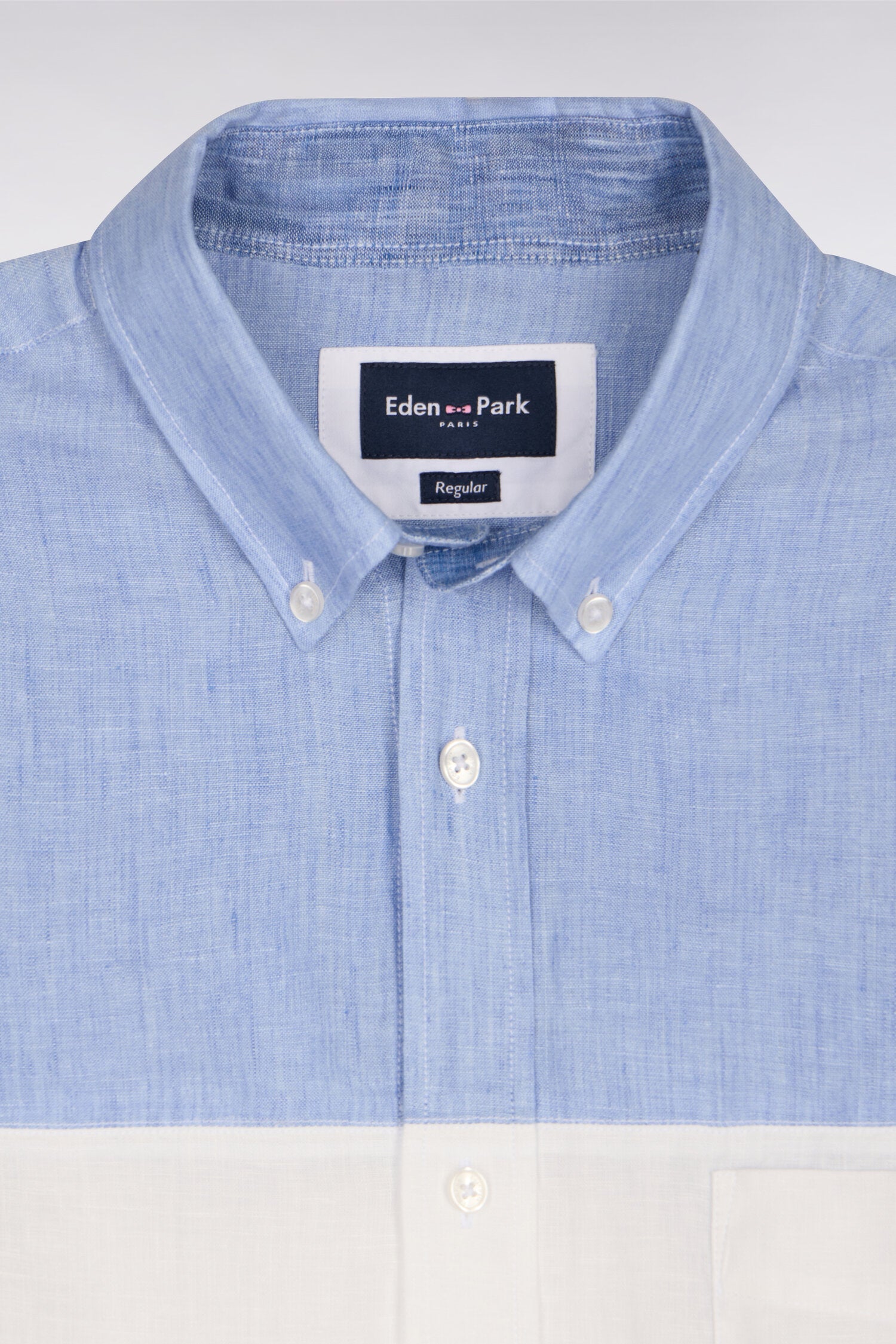 Réalisée dans un lin italien de haute qualité, cette chemise masculine coupée-cousue décline trois couleurs en un patchwork doux et sophistiqué. Sa coupe droite et sa matière naturellement respirante en font une alliée idéale pour la mi-saison comme pour l’été. Le col à pointes boutonnées apporte une touche sport chic, tandis que la poche poitrine ornée du nœud brodé signe indéniablement son appartenance à notre vestiaire. Cette chemise en lin au tomber impeccable conjugue confort, fraîcheur et sens du détail dans son élégant camaïeu bleu. Jean ou chino s'y associent avec la même élégance.