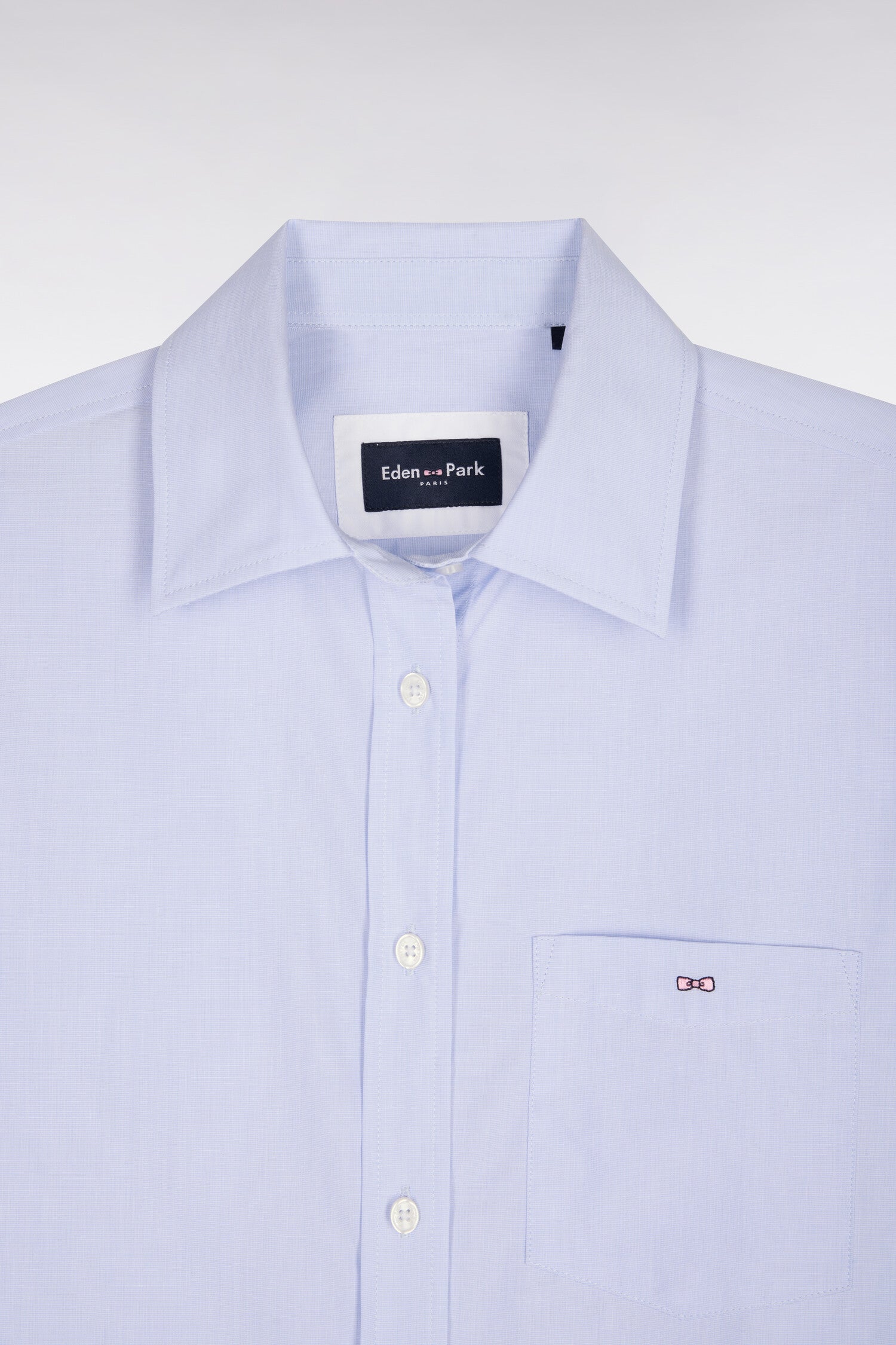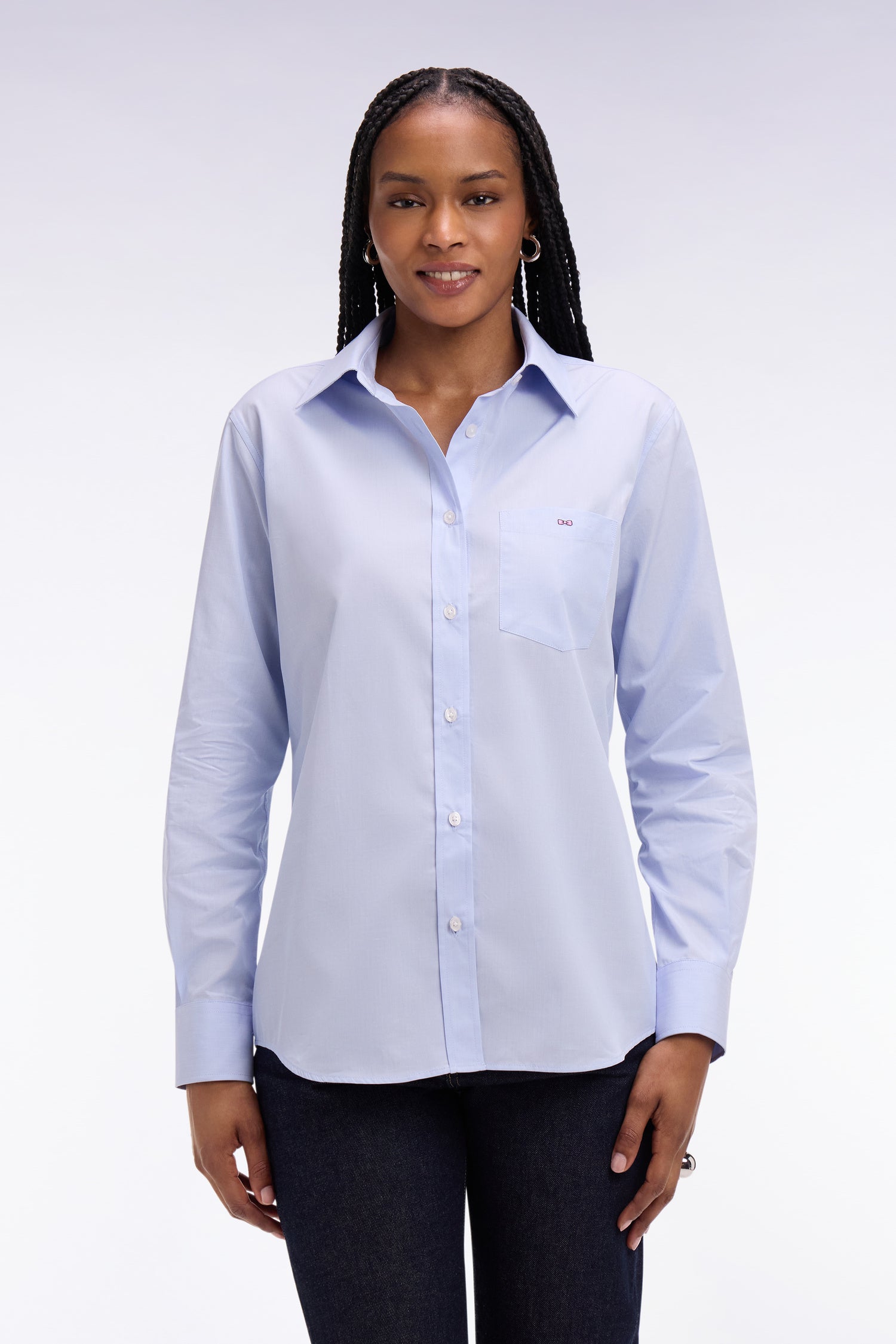 Cette chemise bleu ciel décline sa teinte douce pour illuminer le dressing féminin avec subtilité. Sa popeline de coton italienne, une matière de haute qualité sélectionnée avec soin par notre Maison française, assure une structure nette rehaussée par sa poche plaquée. Quant à sa coupe slim féminine elle maintient une allure chic et décontractée. Facile à associer à un jean clair ou à un pantalon de tailleur marine, cette chemise est un pilier du vestiaire féminin.