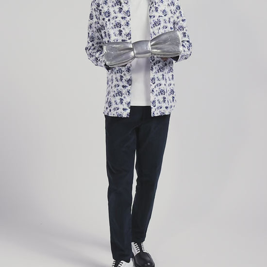 The timeless elegance of this white cotton twill shirt lies in its blue floral print, classic straight cut and button-down collar. Its patch pocket adds a more casual, utilitarian touch. A versatile piece for a polished look on any occasion.