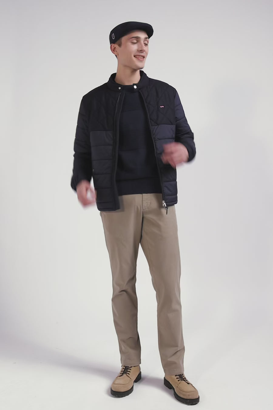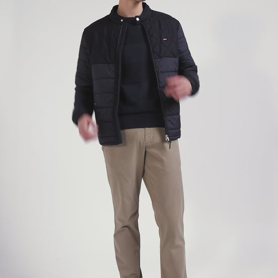 This long-sleeved down jacket boasts modern styling with its biker collar and two-way quilting. The flannel upper section blends harmoniously with the durable nylon lower section. It features a plain nylon lining for superior comfort and a custom double-slider zip. Its two snap pockets and scratch-closure inner pockets combine functionality and aesthetics. The varied quilting provides a unique texture, complemented by an embroidered pink bow tie, for an iconic Eden Park style signature.
