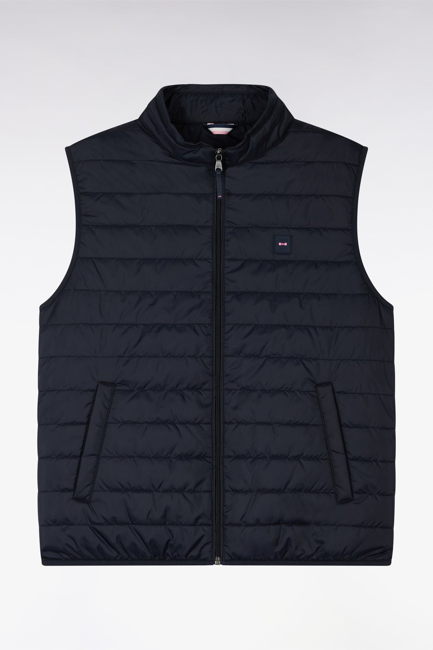 This sleeveless, water-repellent puffa features 2 piped front pockets, 2 interior pockets with Velcro and zip fastening. The filling is made entirely out of polyester fibres derived from recycled plastic bottles