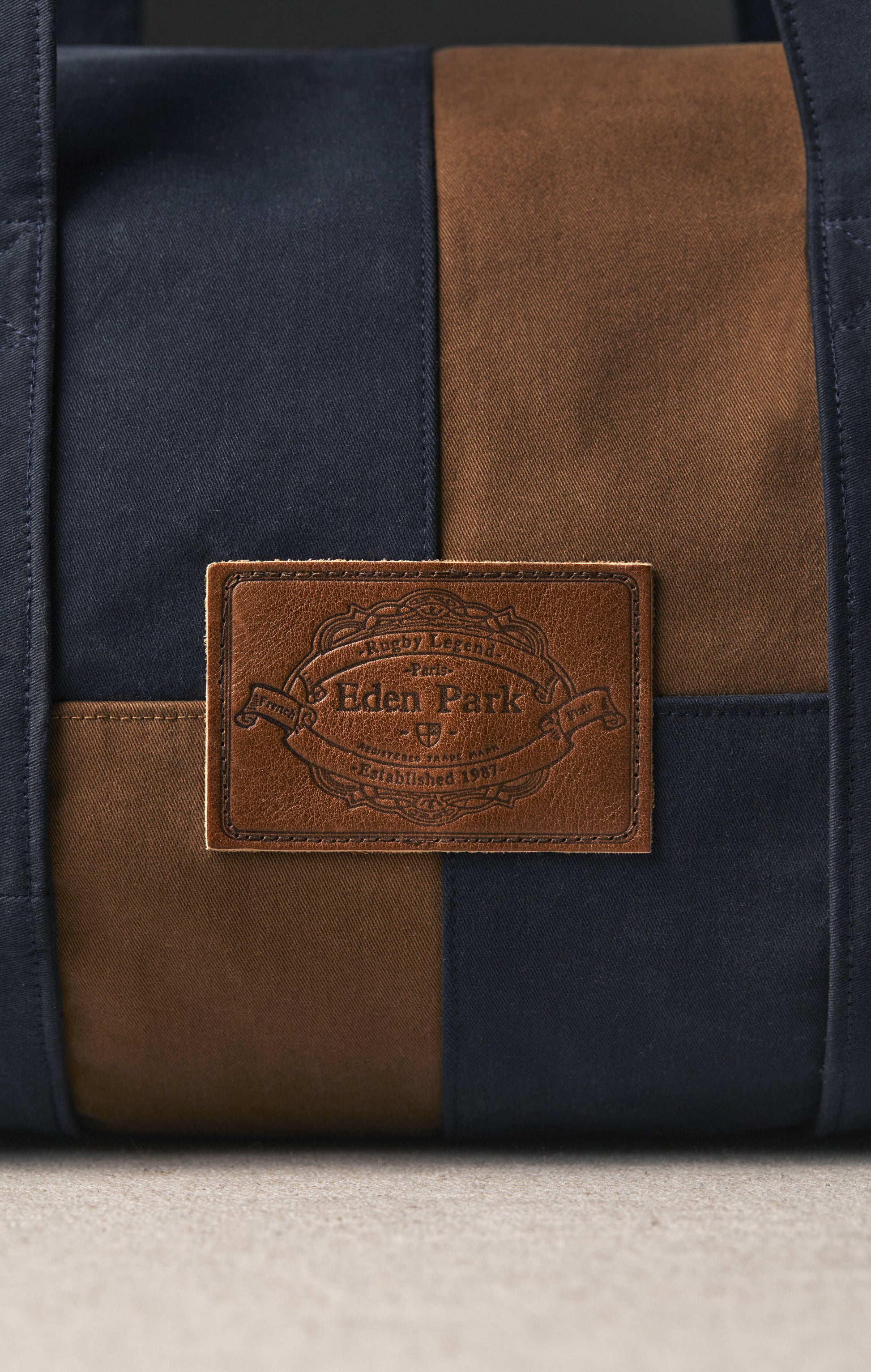 Ce duffle bag en coton bicolore camel et marine est une pièce unique, cousue à la main dans notre atelier parisien à partir de chutes de tissus provenant de nos archives. Inspiré des maillots de rugby et de leur style graphique, ce sac chic et décontracté s'avèrera parfait pour un week-end, un court séjour ou en sac de sport. La griffe en cuir embossée Eden Park placée au centre de ce sac provient d'un jean de nos anciennes collections, tout comme la fermetures éclair principale et celle de sa poche intérieure où glisser clés, cartes ou monnaie. Résistant et pratique, ce duffle bag est proposé en un seul et unique exemplaire à retrouver sur notre site pour une durée limitée.