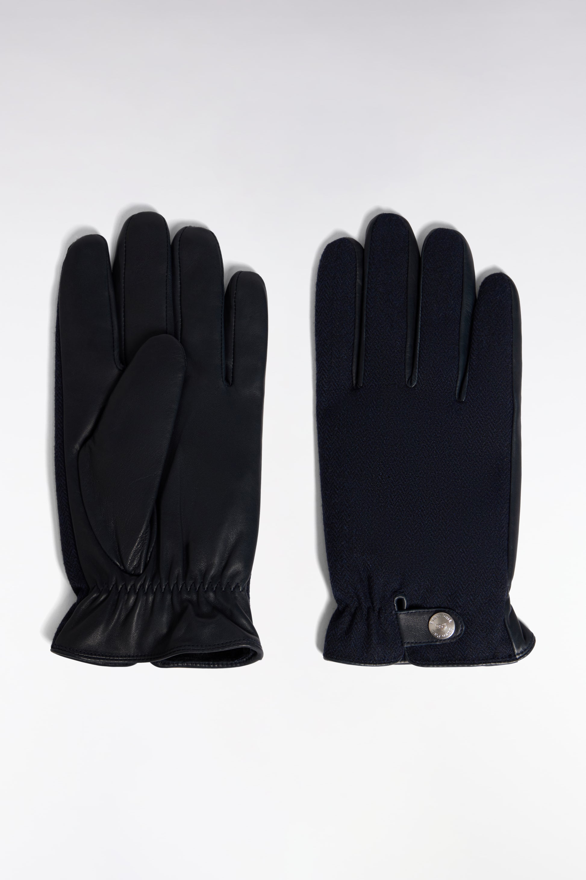 These men's gloves blend retro elegance with contemporary refinement. Their herringbone fabric back is matched by a smooth leather palm and a signature buttoned placket, for a distinguished look down to the smallest detail. A timeless accessory in gray or blue
