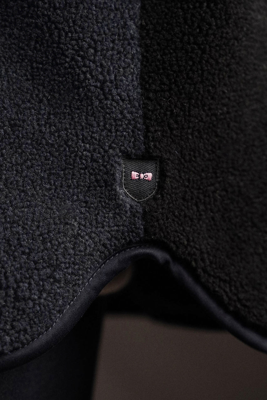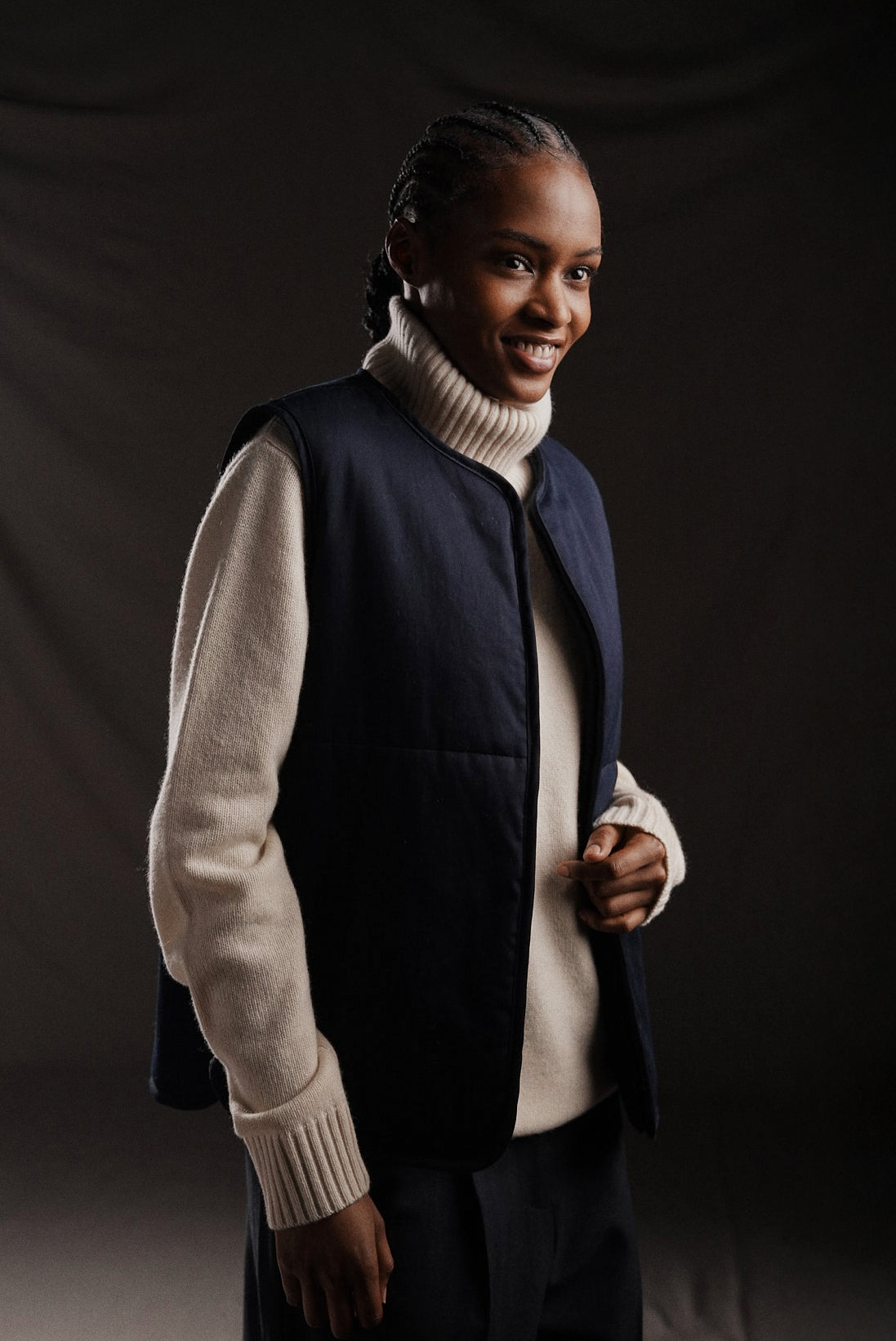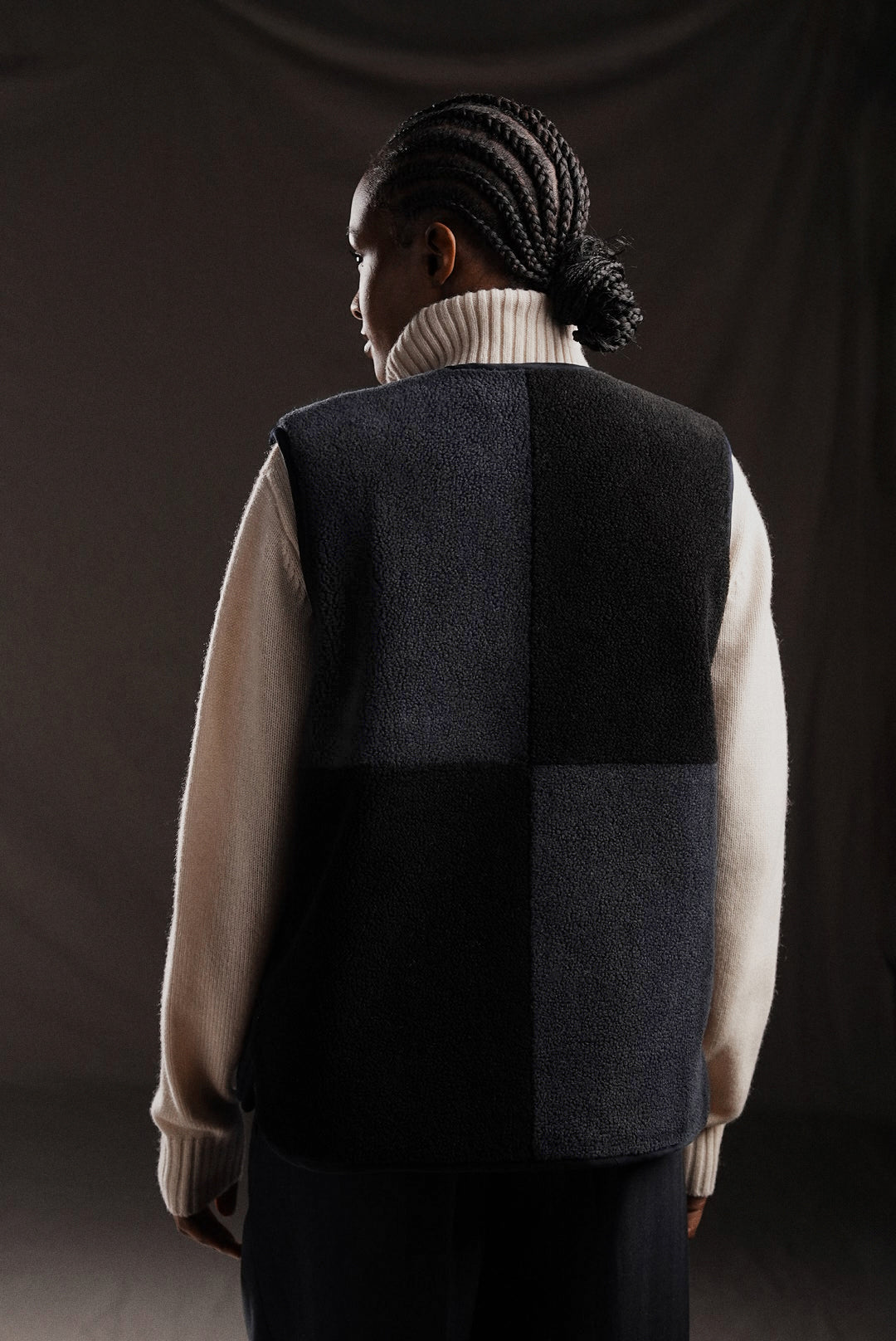 This women’s reversible vest features a solid navy side, while the reverse side is crafted from soft bouclé fabric in navy and black in a quadrant layout—a nod to our iconic cut and sew pattern. This one-of-a-kind piece, created from our atelier’s dormant stock, gives new life to high-quality materials: fabric, wadding, trim, and badges all sourced from our inventory. With a comfortable fit and freedom of movement, this straight-cut, slightly oversized medium-sized vest is a perfect layering companion. Unique piece from the PAP'Atelier upcycled capsule created in Paris, available exclusively on www.eden-park.com for a limited time.